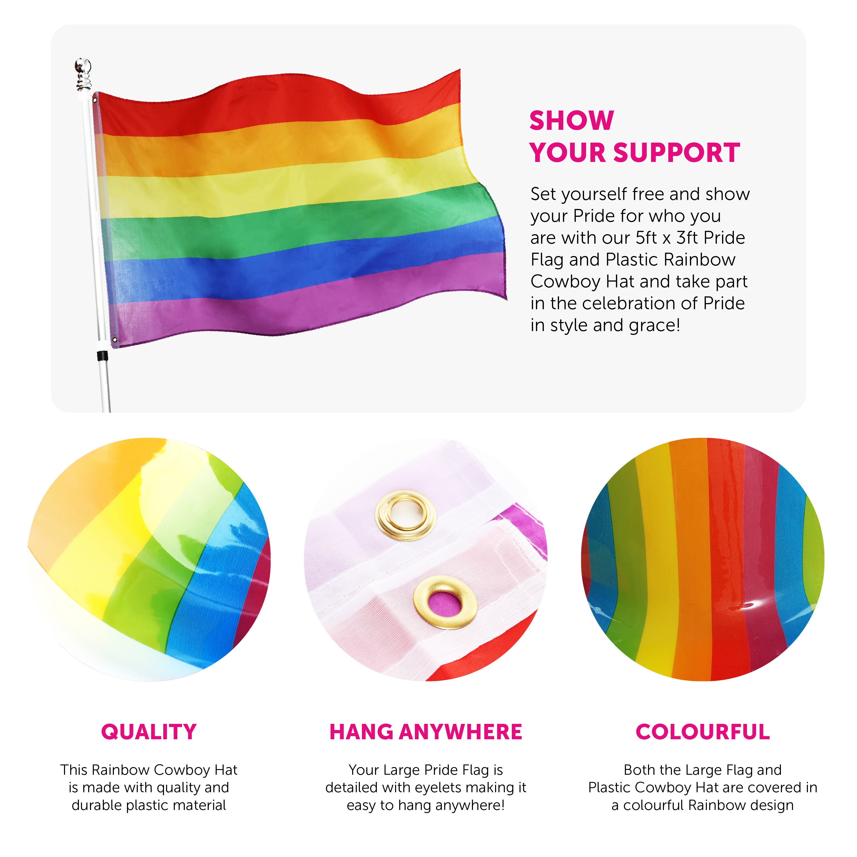 PERFECT FOR PRIDE & SUMMER EVENTS: Whether you’re celebrating LGBTQ+ Pride at public parades and parties or for other events, make sure you're picking up our 5ft x 3ft Pride Flag and Plastic Rainbow Cowboy Hat, for a Summer of support and celebration alongside family and friends!