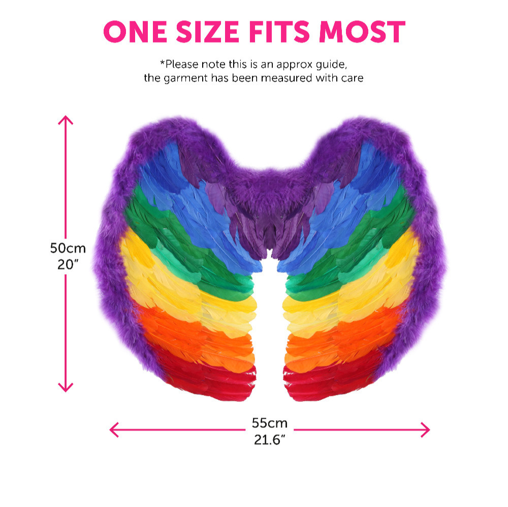 FEATHER WINGS MEASUREMENTS: Your Rainbow Pride Feather Boa Wings are 50cm/20” in Width, and 40cm/15” in Length, paired with elasticated straps that are very stretchy and comfortable to wear for any Adult