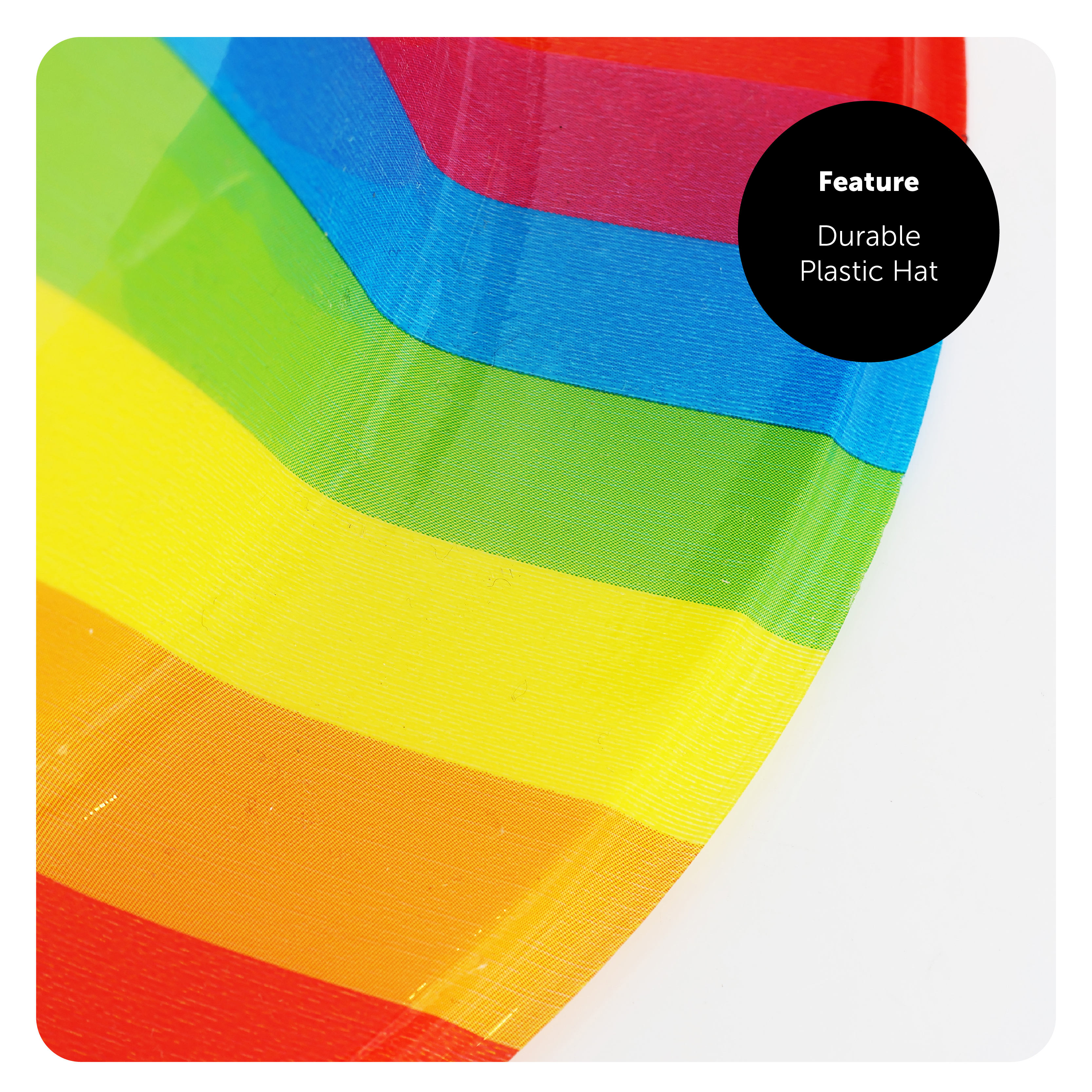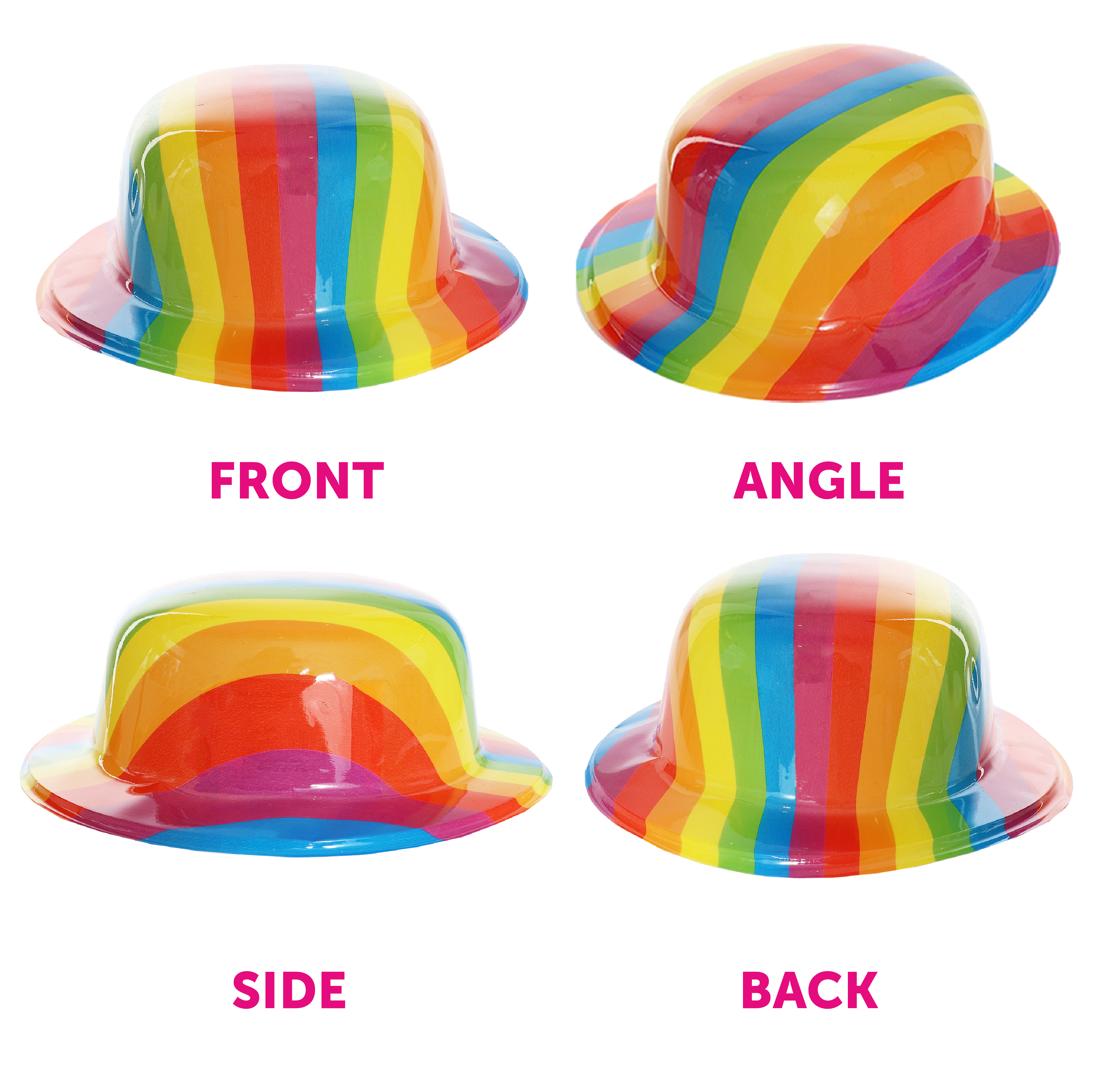 BOWLER HAT DETAILS: These Hats are classic shaped, plastic Bowlers, covered in a brightly coloured, vibrant Rainbow print all over the top, the perfect accessory for adding that splash of colour!
