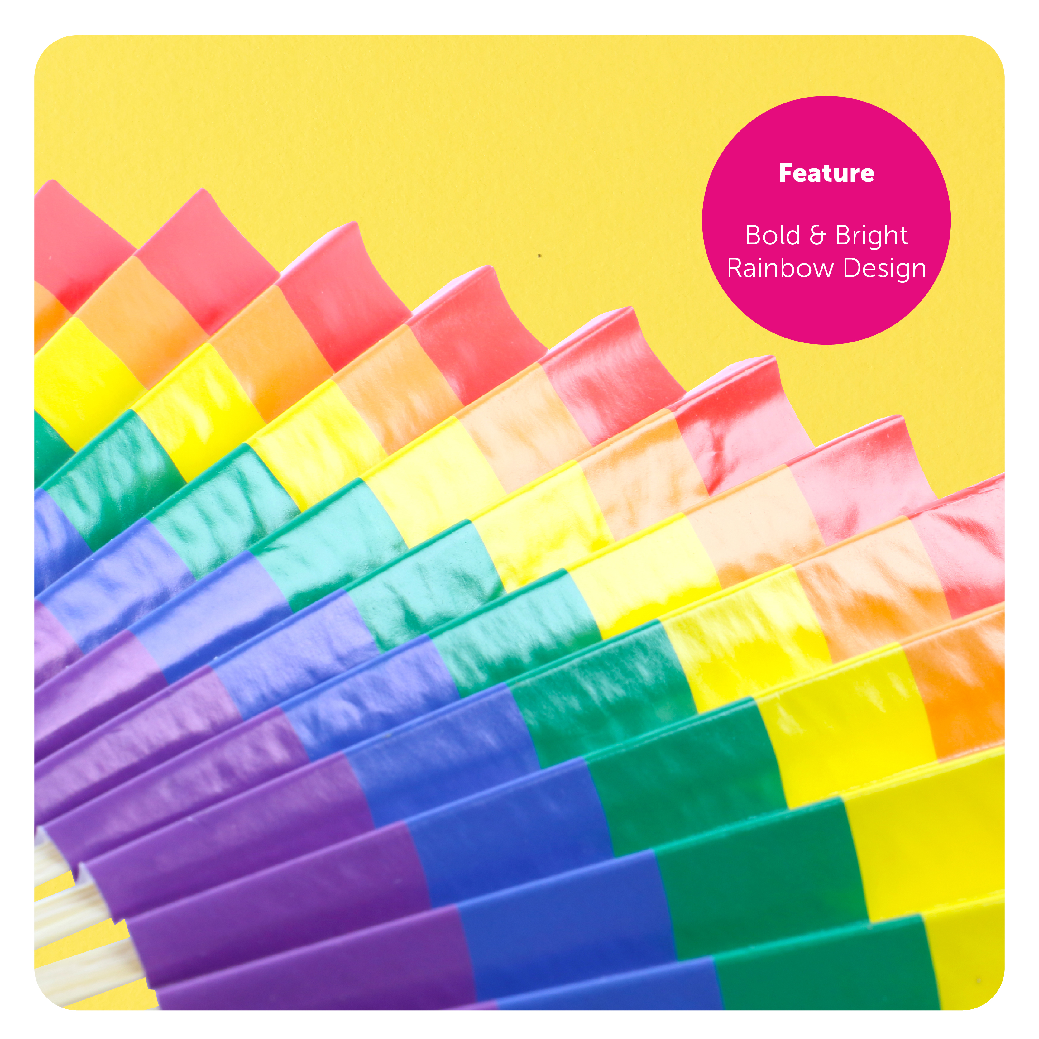 FAN DETAILS: An elegantly styled Folding Fan covered in a bold and bright Rainbow design! Keep yourself down as you celebrate alongside friends and family at any Pride or Summer event!