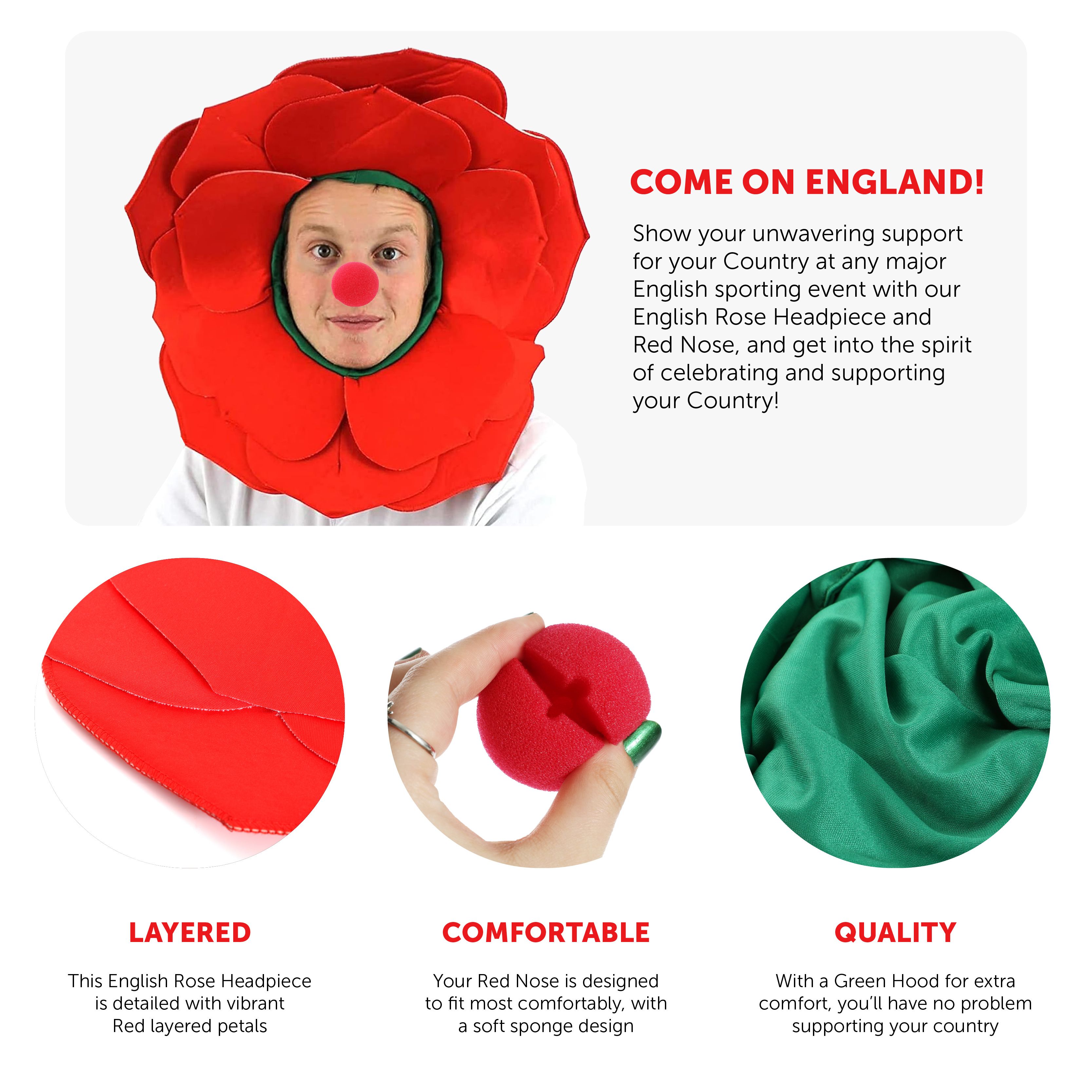 ENGLISH ROSE HEADPIECE & RED NOSE: Show your unwavering support for your Country at any major English sporting event with our English Rose Headpiece and Red Nose, and get into the spirit of celebrating and supporting your Country!
