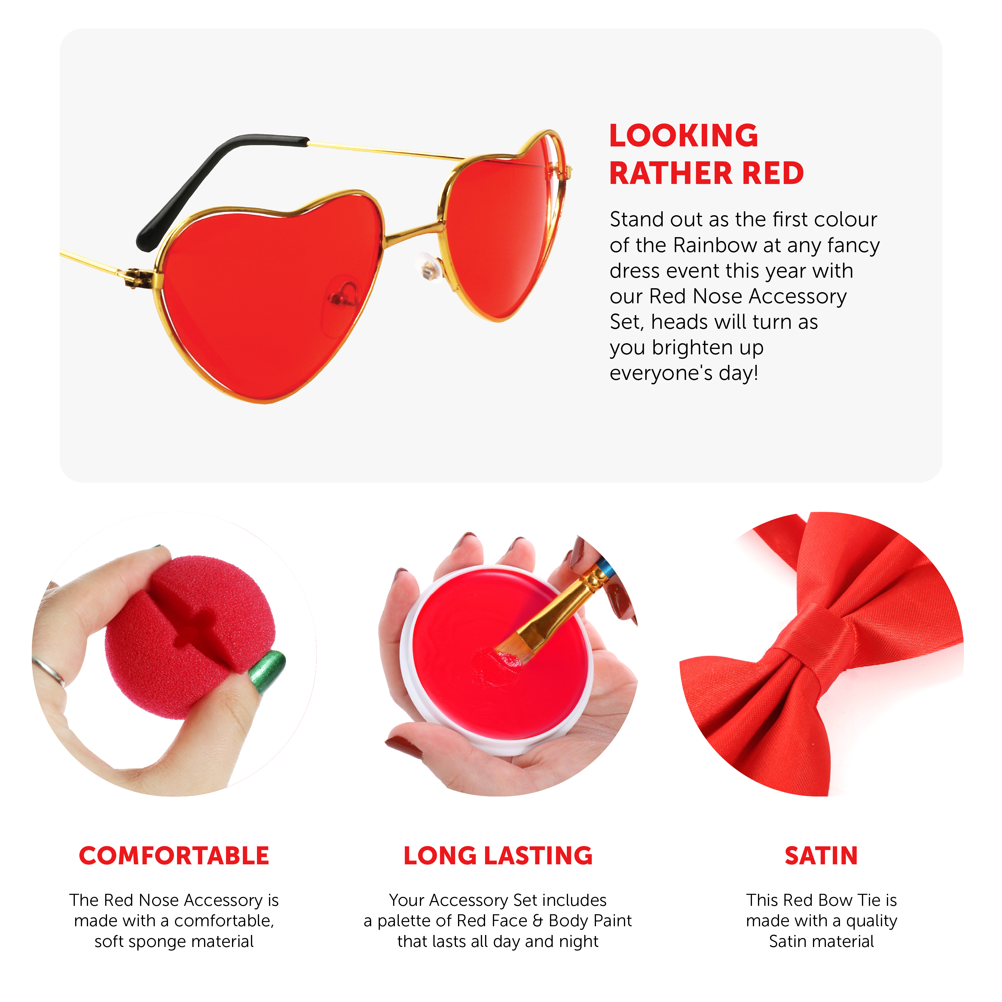 SET INCLUDES: Your Red Nose Accessory Set includes a Red Sponge Nose, Heart Shaped Glasses with Red Lenses, an adjustable Red Satin Bow Tie, and a palette of Red Face & Body Paint, to complete your look!