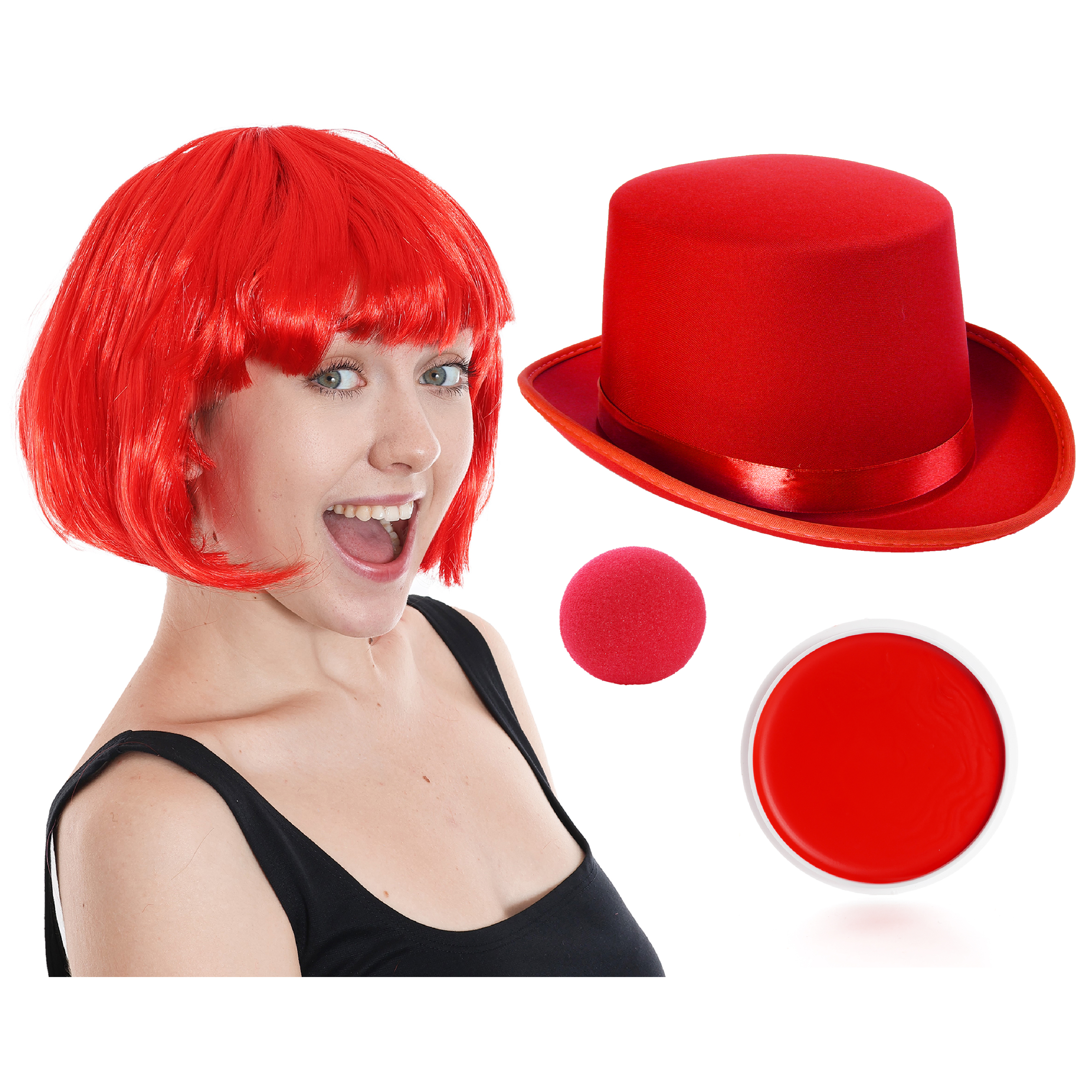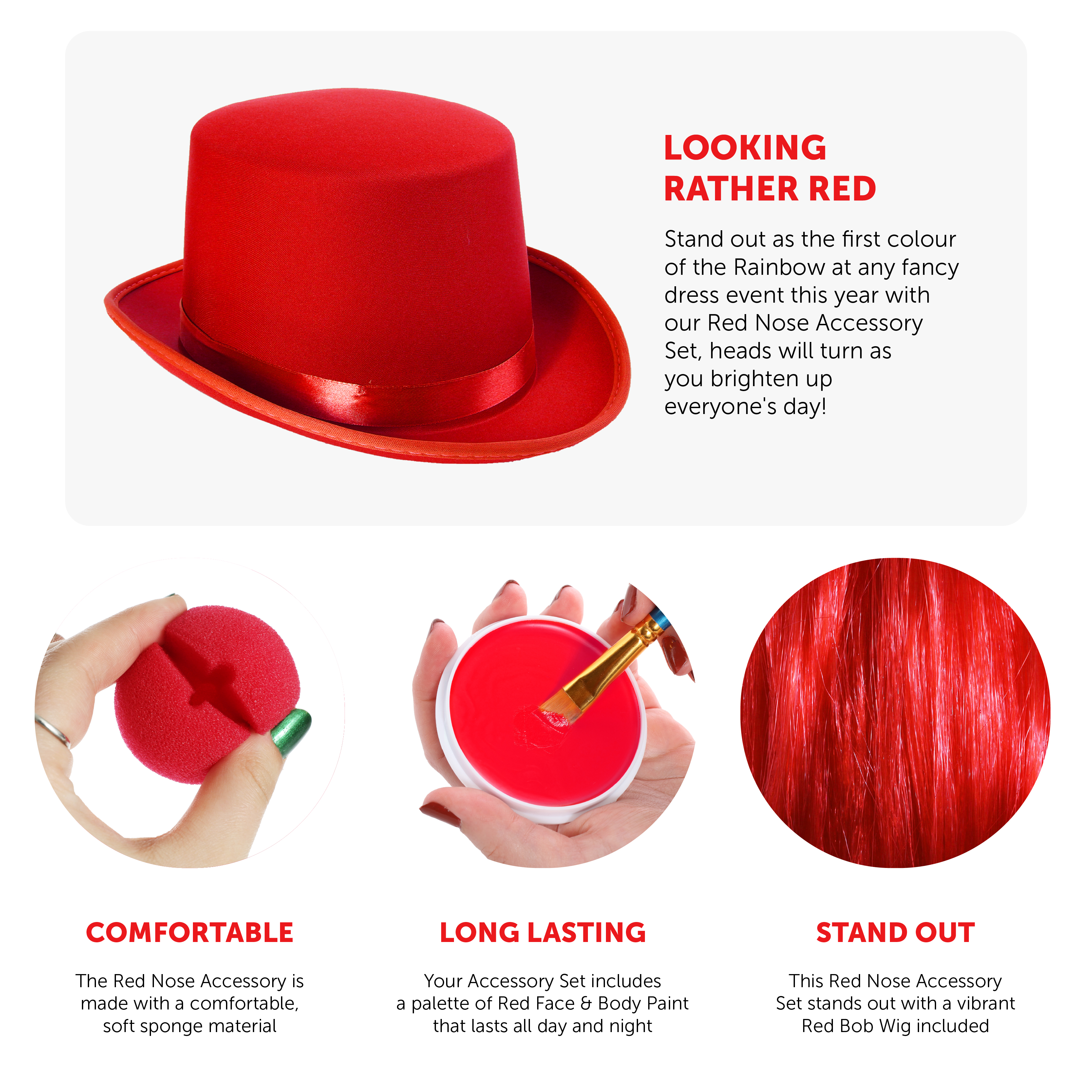 SET INCLUDES: Your Red Nose Accessory Set includes a Red Sponge Nose, a Short Red Bob Wig, a Red Satin Top Hat, and a Palette of long lasting Red Face and Body Paint, to complete your look!