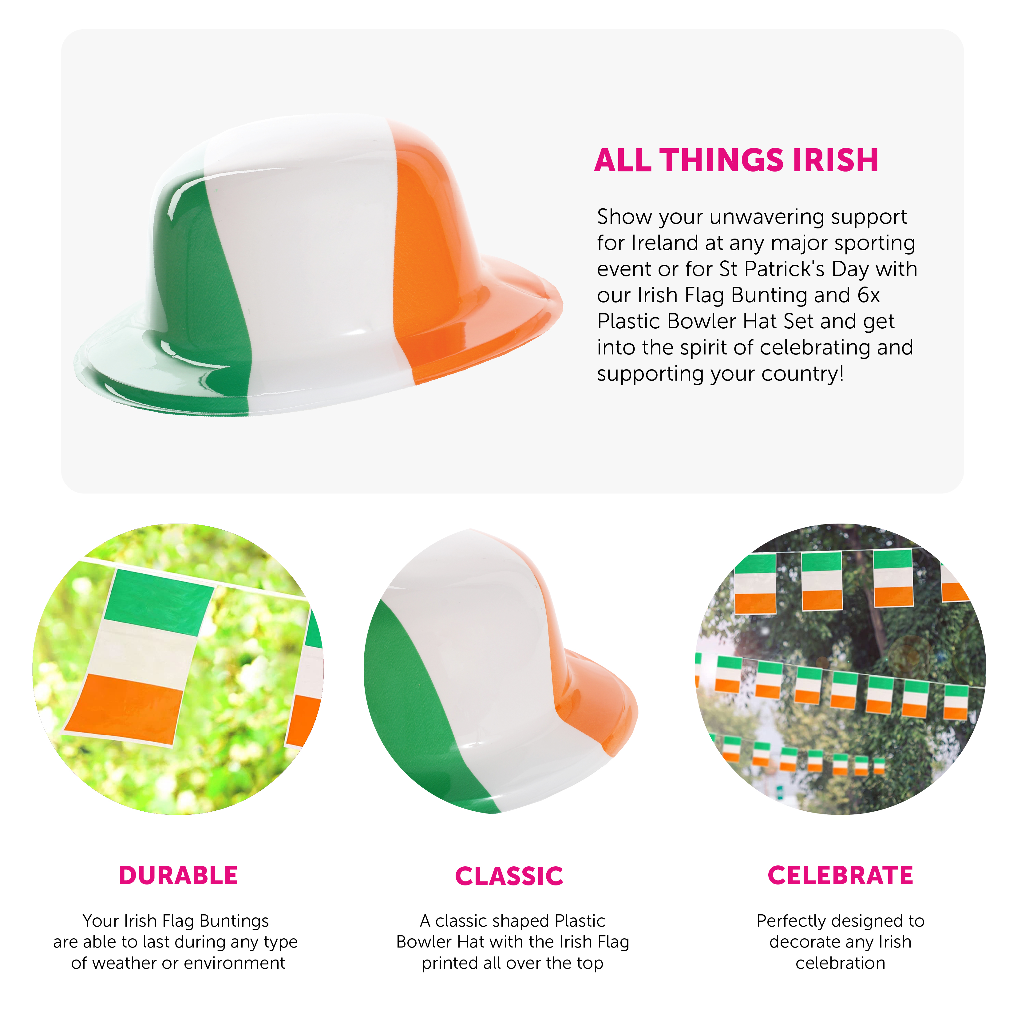IRISH SET INCLUDES: This Irish Set includes 6x classic shaped, Plastic Bowler Hat with an Irish Flag design all over, and a Pack of Irish Flag Bunting, the perfect addition to any Irish themed event!