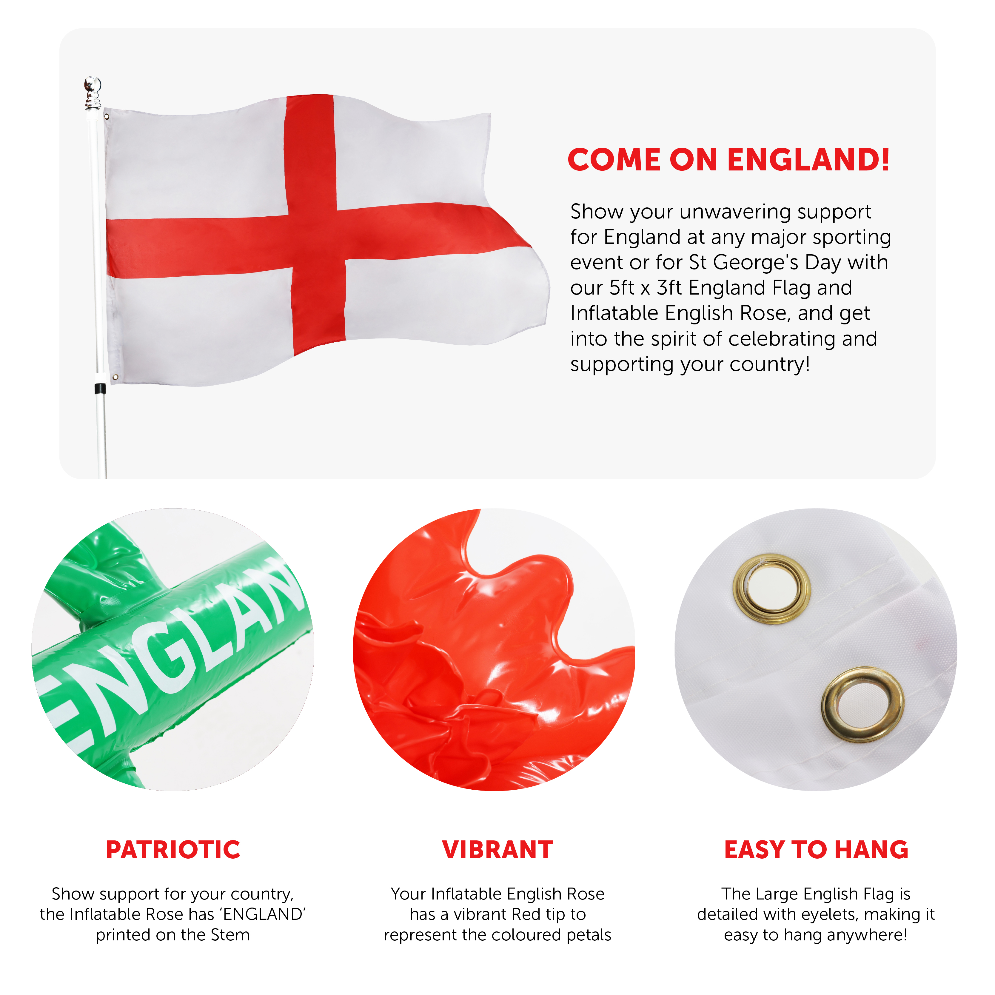 5FT X 3FT ENGLAND FLAG & INFLATABLE ENGLISH ROSE: Show your unwavering support for England at any major sporting event or for St George's Day with our 5ft x 3ft England Flag and Inflatable English Rose, and get into the spirit of celebrating and supporting your country!
