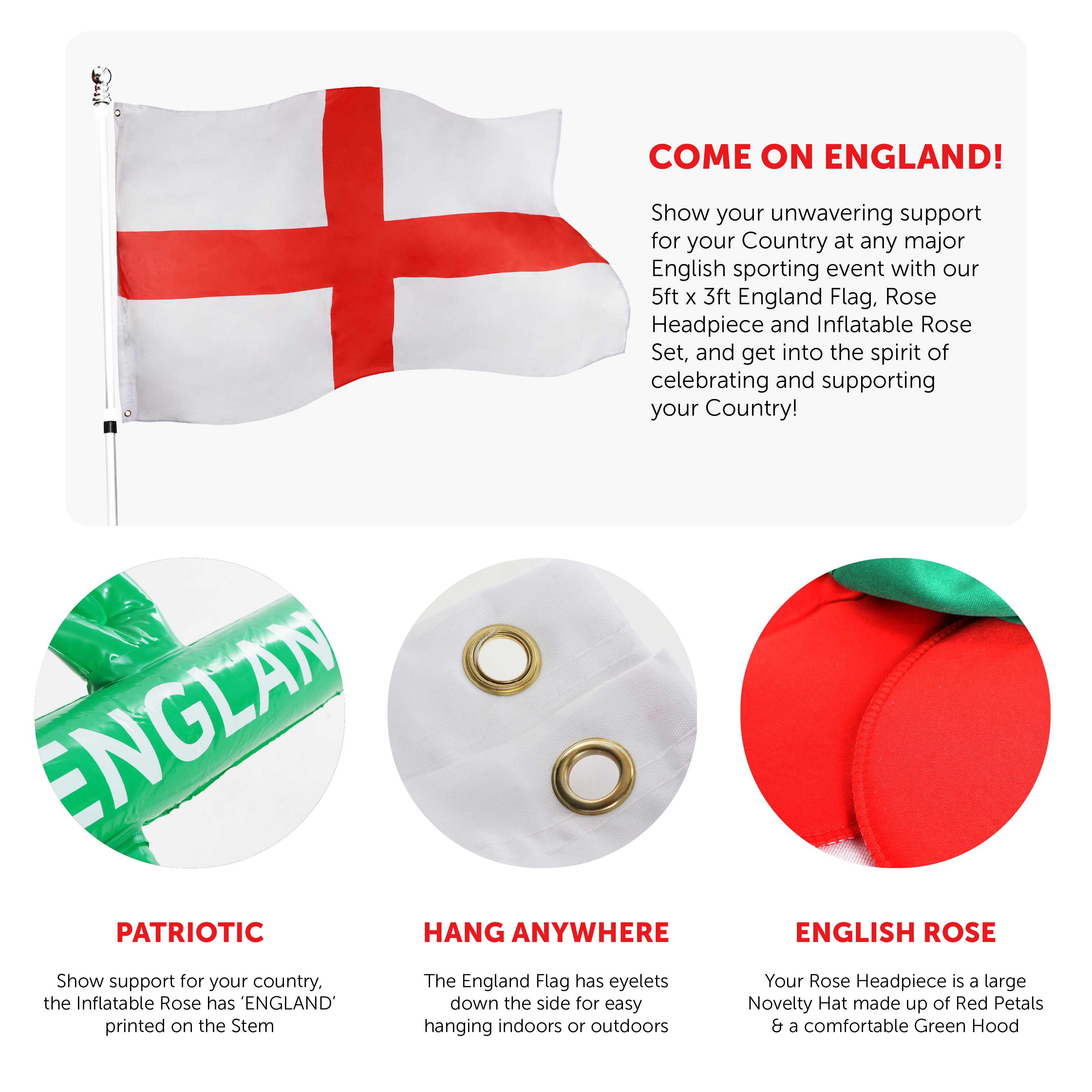 SET INCLUDES: This England Supporters Set includes a Large 5ft x 3ft England Flag with eyelets for easy hanging, a Rose Headpiece made up of Red Rose Petals attached to a Green Hood, and an Inflatable Rose with a Red Rose tip, and a long Green Stem with leaves attached and 'ENGLAND' printed down the side, the perfect look for any English celebration!