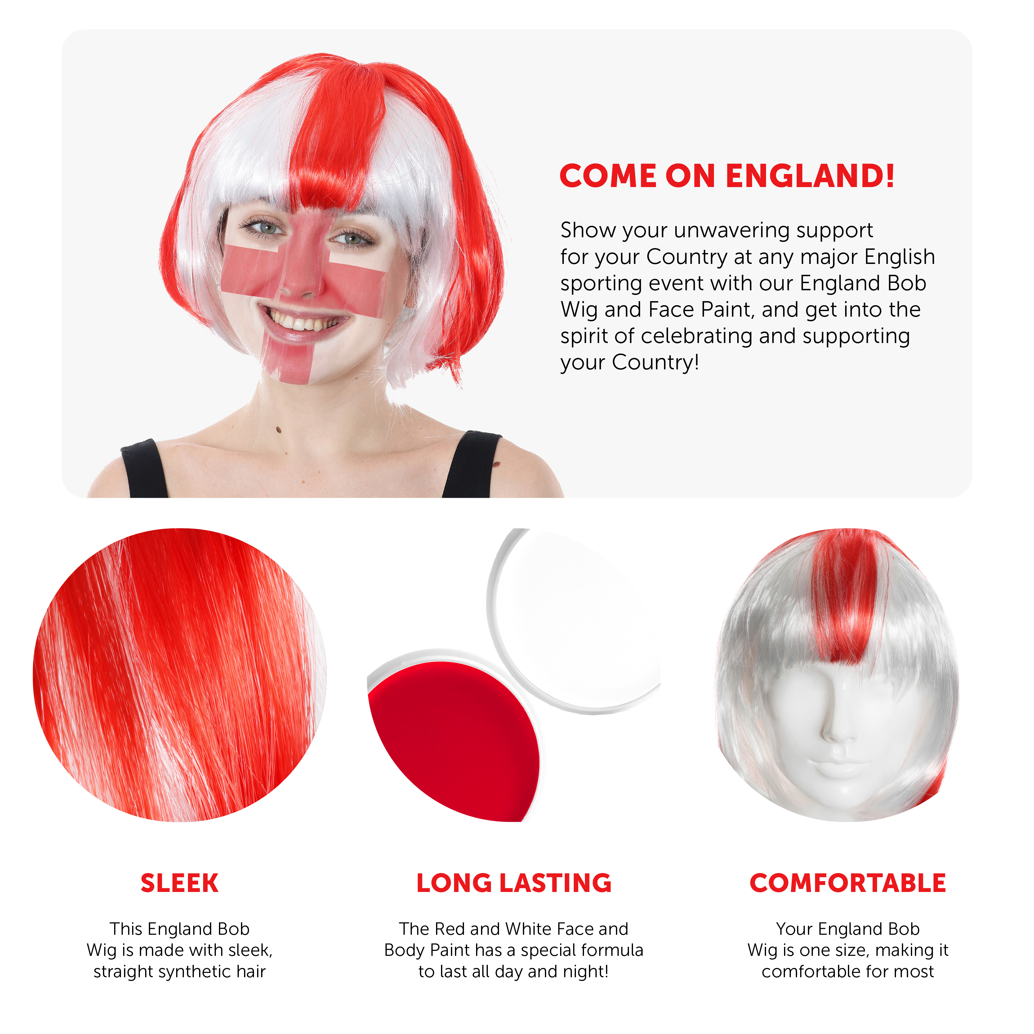 ENGLAND BOB WIG & FACE PAINT: Show your unwavering support for your Country at any major English sporting event with our England Bob Wig and Face Paint, and get into the spirit of celebrating and supporting your Country!
