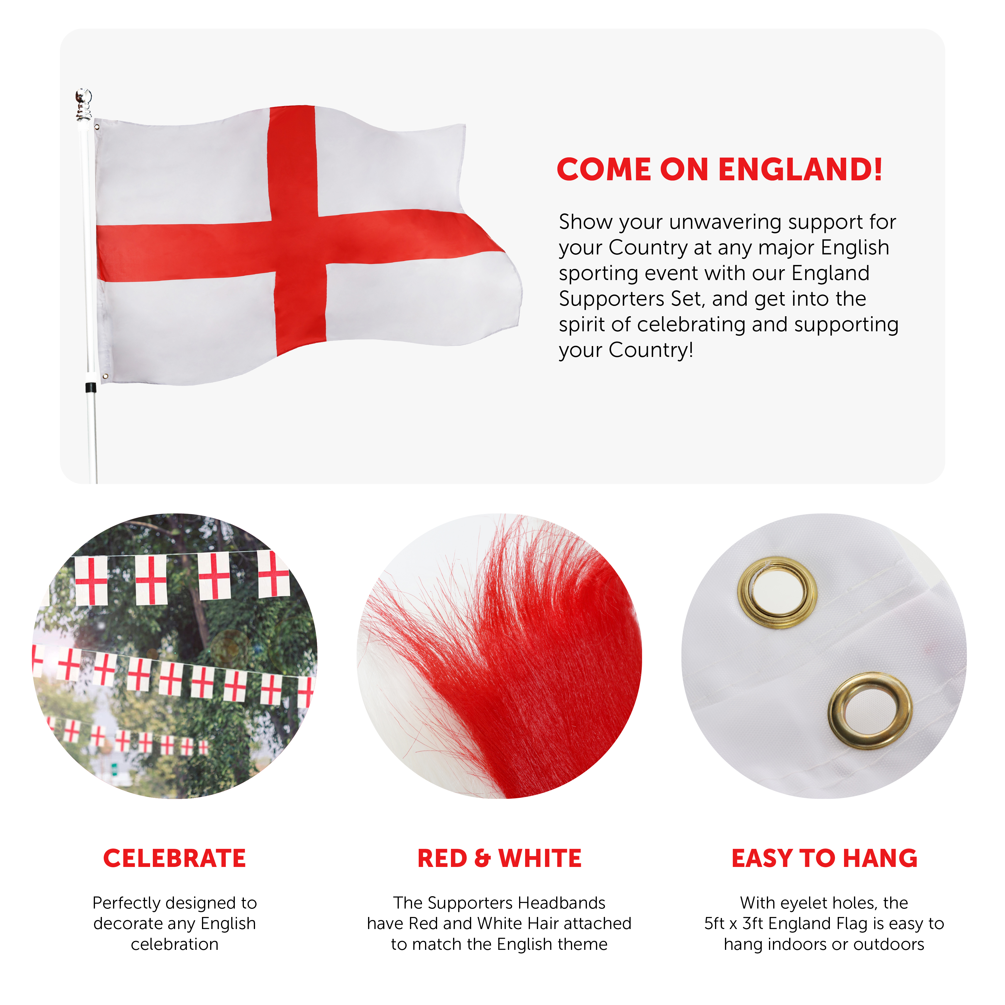 SET INCLUDES: This England Supporters Set includes a Large 5ft x 3ft England Flag with eyelets for easy hanging, 4x Headbands with Red and White Hair attached, a Palette of Red Face Paint, a Palette of White Face Paint, and 3x Packs of England Flag Bunting, the perfect set for any English celebration!