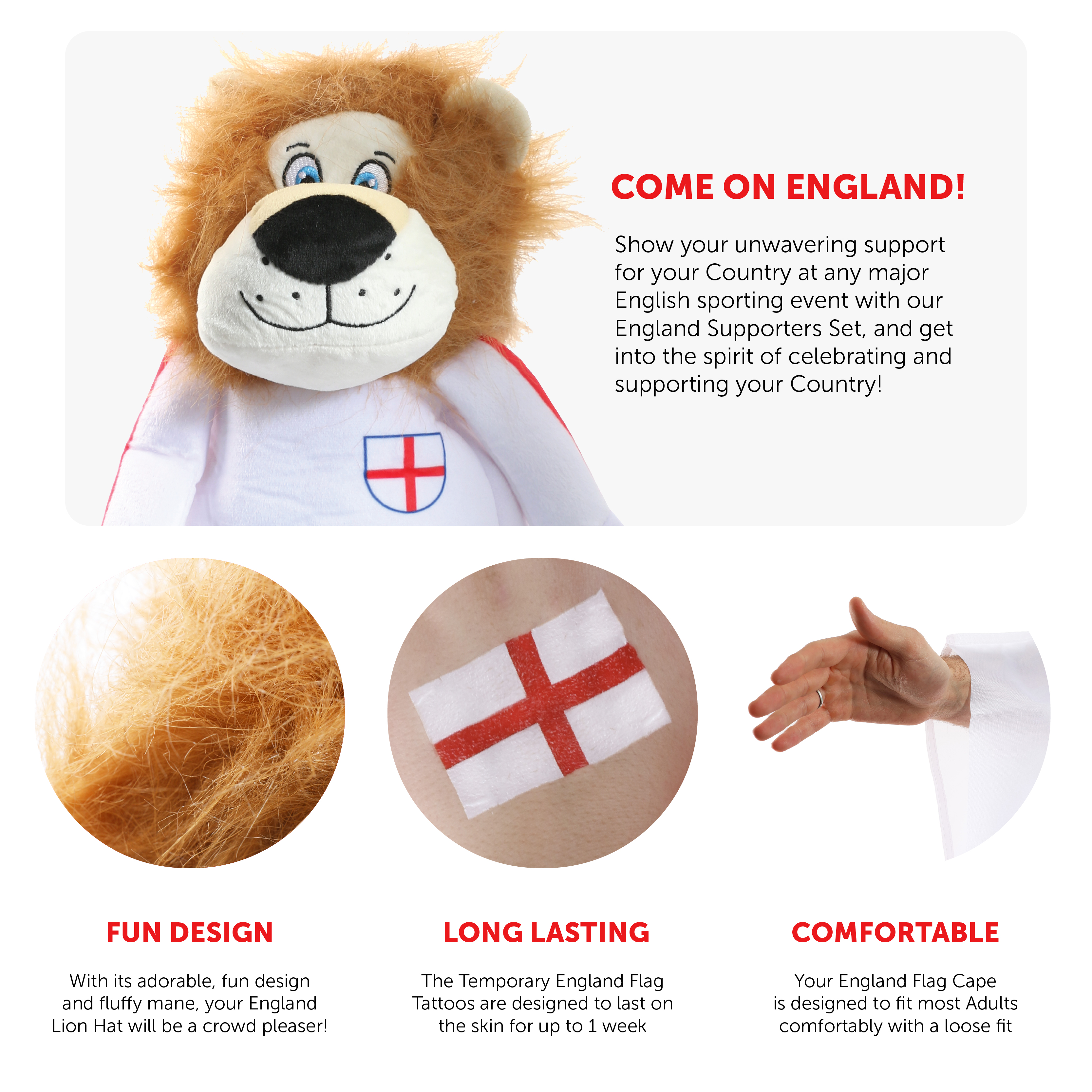 SET INCLUDES: This England Supporters Set includes Temporary England Flag Tattoos, a Novelty Plush Lion Hat with an England Football Shirt on, and a loose fitting England Flag Cape, the perfect set to support your Country at any English event!
