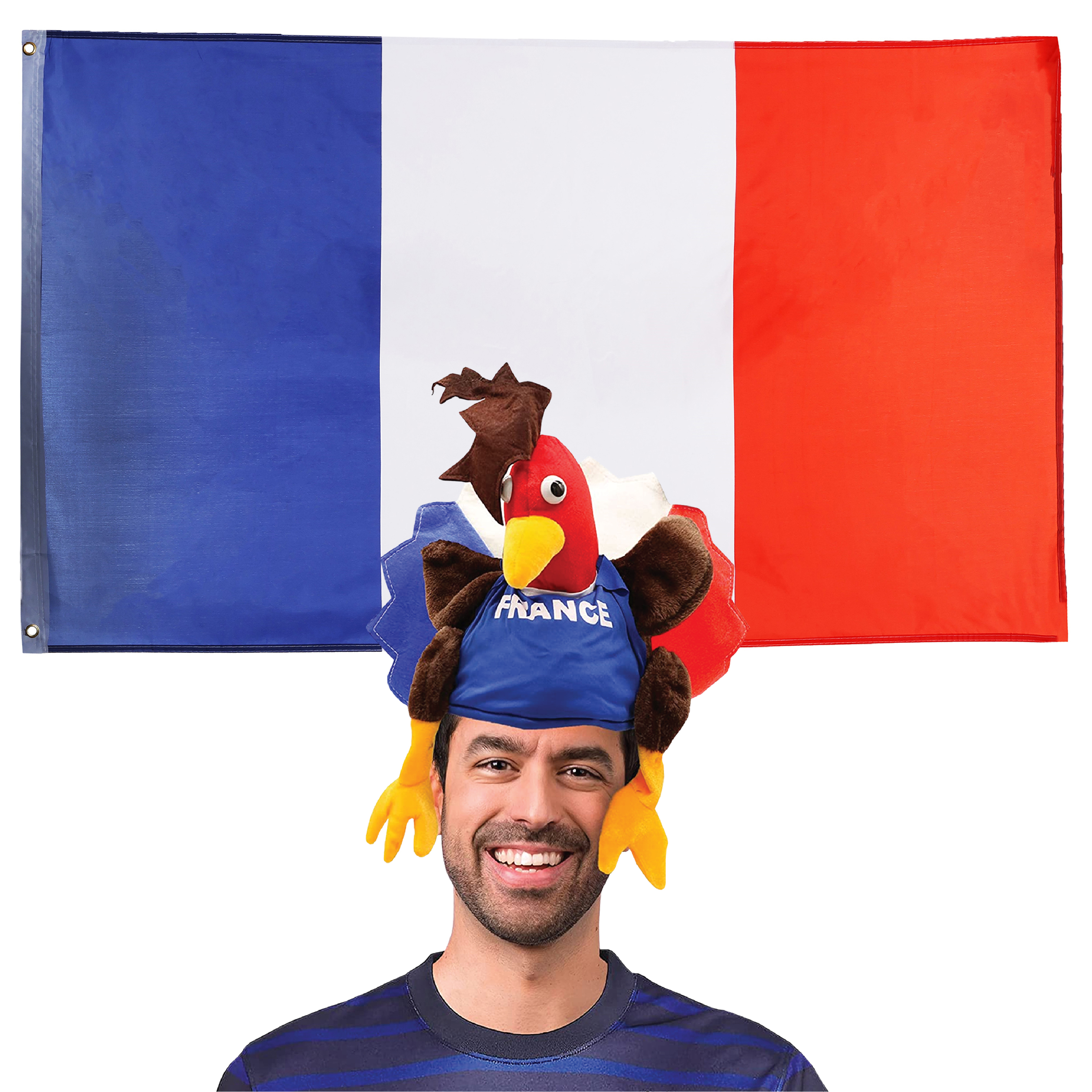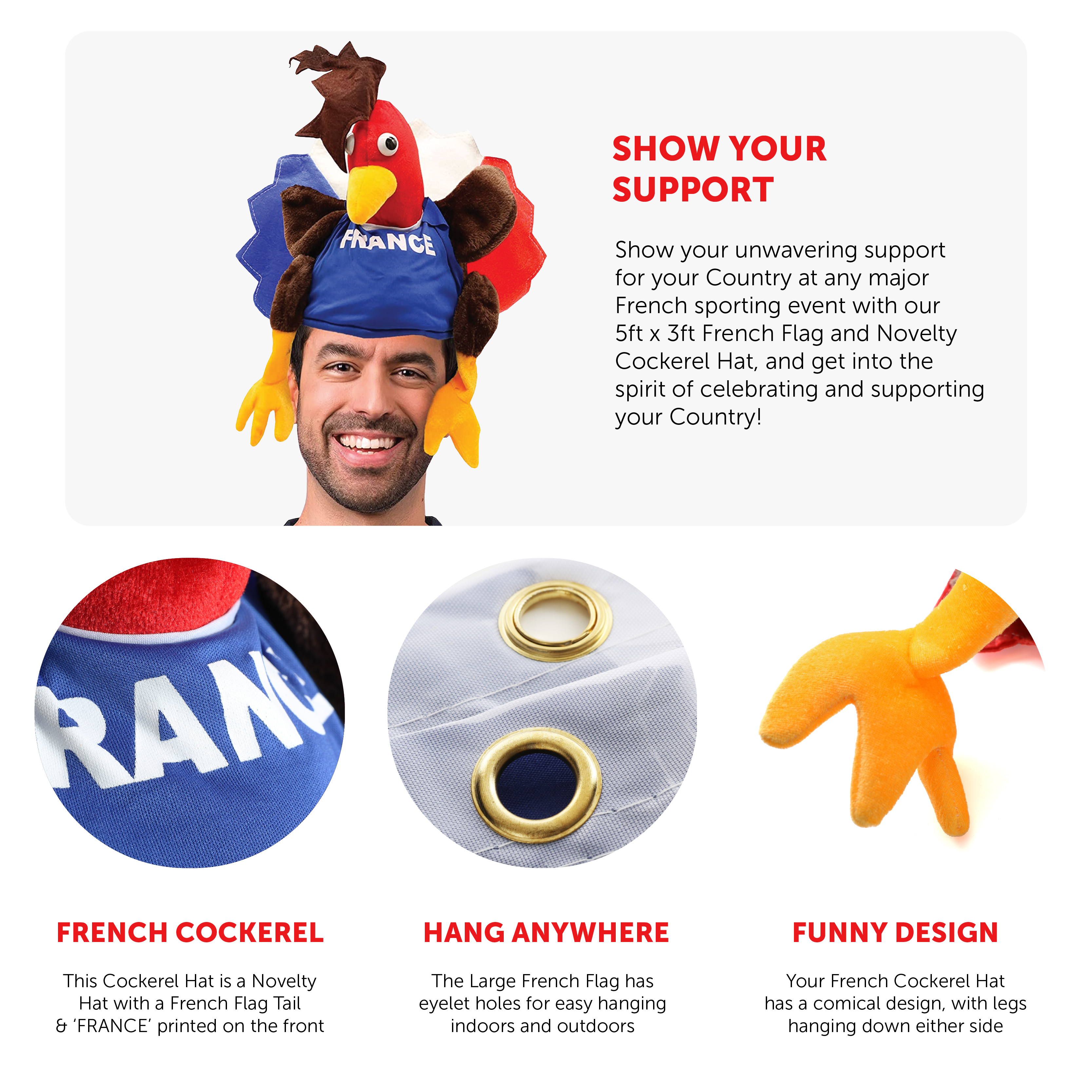 5FT X 3FT FRENCH FLAG & NOVELTY COCKEREL HAT: Show your unwavering support for your Country at any major French sporting event with our 5ft x 3ft French Flag and Novelty Cockerel Hat, and get into the spirit of celebrating and supporting your Country!