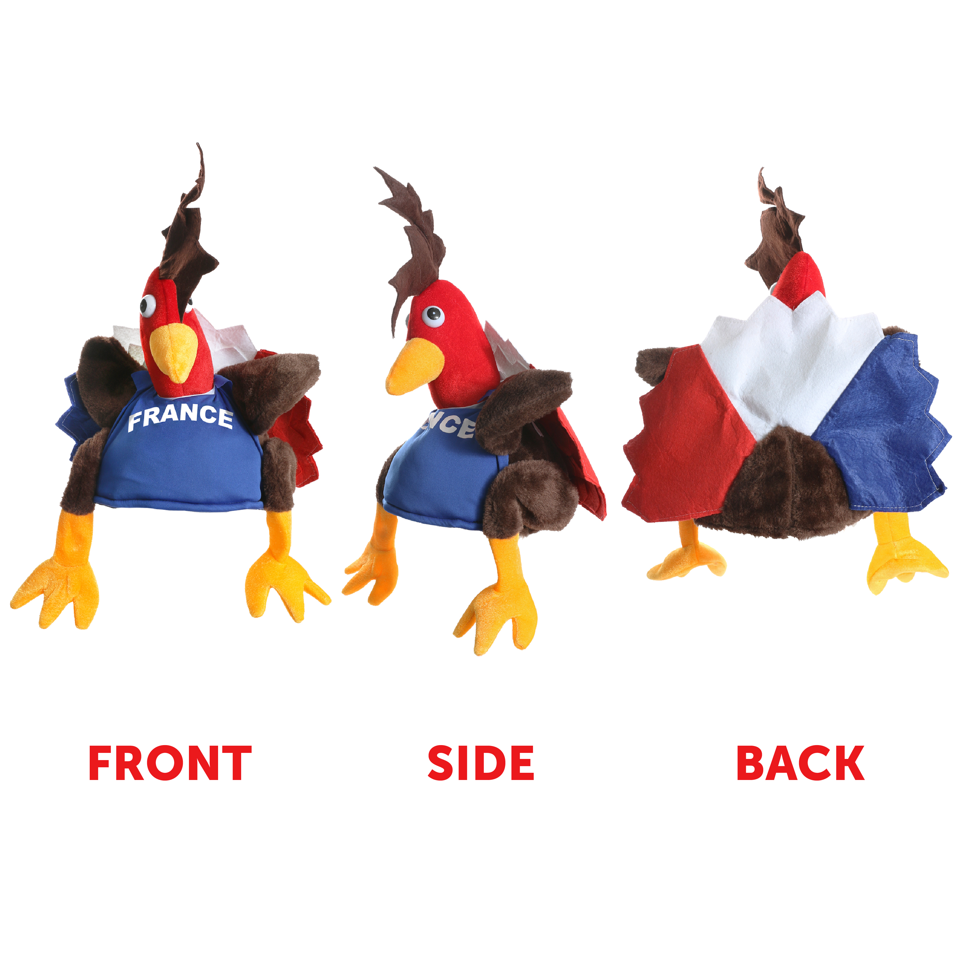 SET INCLUDES: This French Set includes a large 5ft x 3ft French Flag with eyelet holes for easy hanging anywhere, and a plush Novelty Hat in the shape of a Cockerel, wearing a Blue Top with 'FRANCE' printed across the front, with the French Flag colours on the Tail and long legs dangling down either side, you'll be sure to look the part at any French event!
