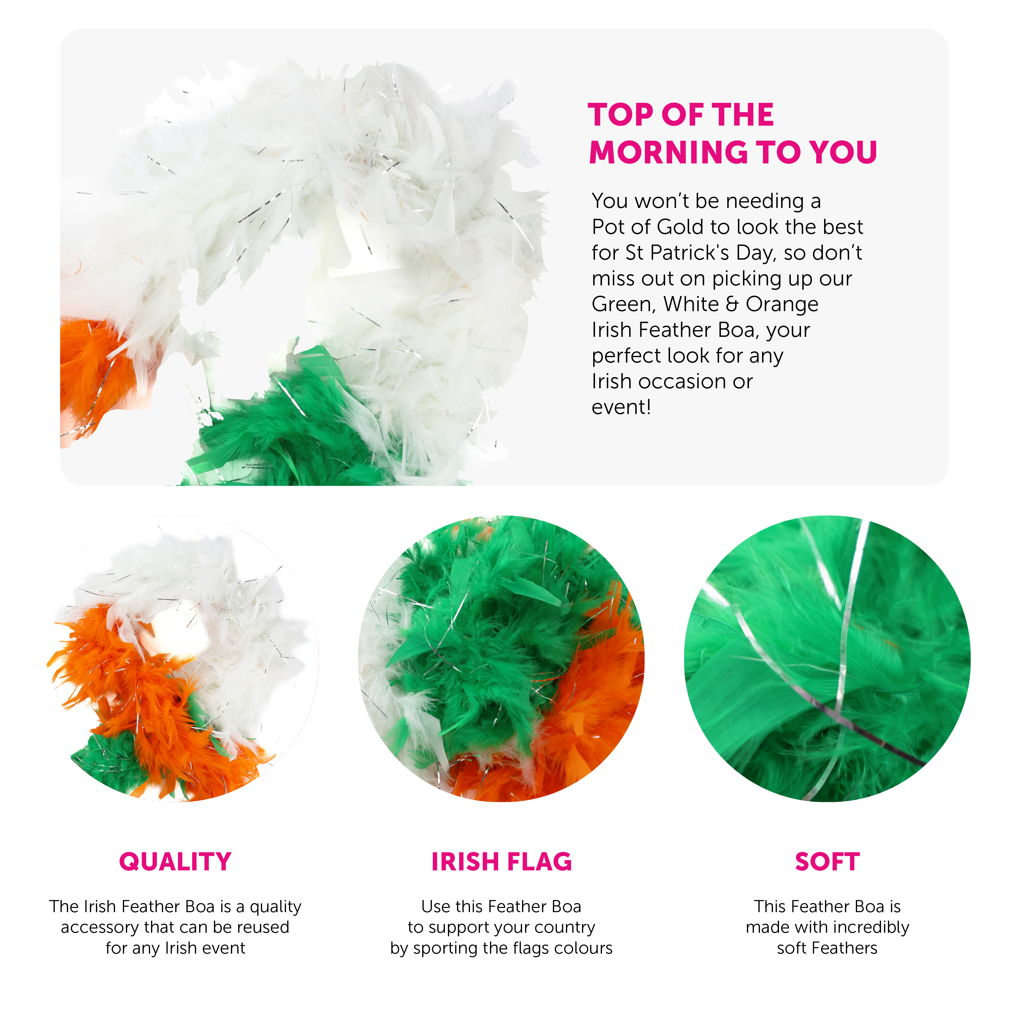 GREEN, WHITE & ORANGE IRISH FEATHER BOA: You won’t be needing a Pot of Gold to look the best for St Patrick's Day, so don’t miss out on picking up our Green, White & Orange Irish Feather Boa, your perfect look for any Irish occasion or event!
