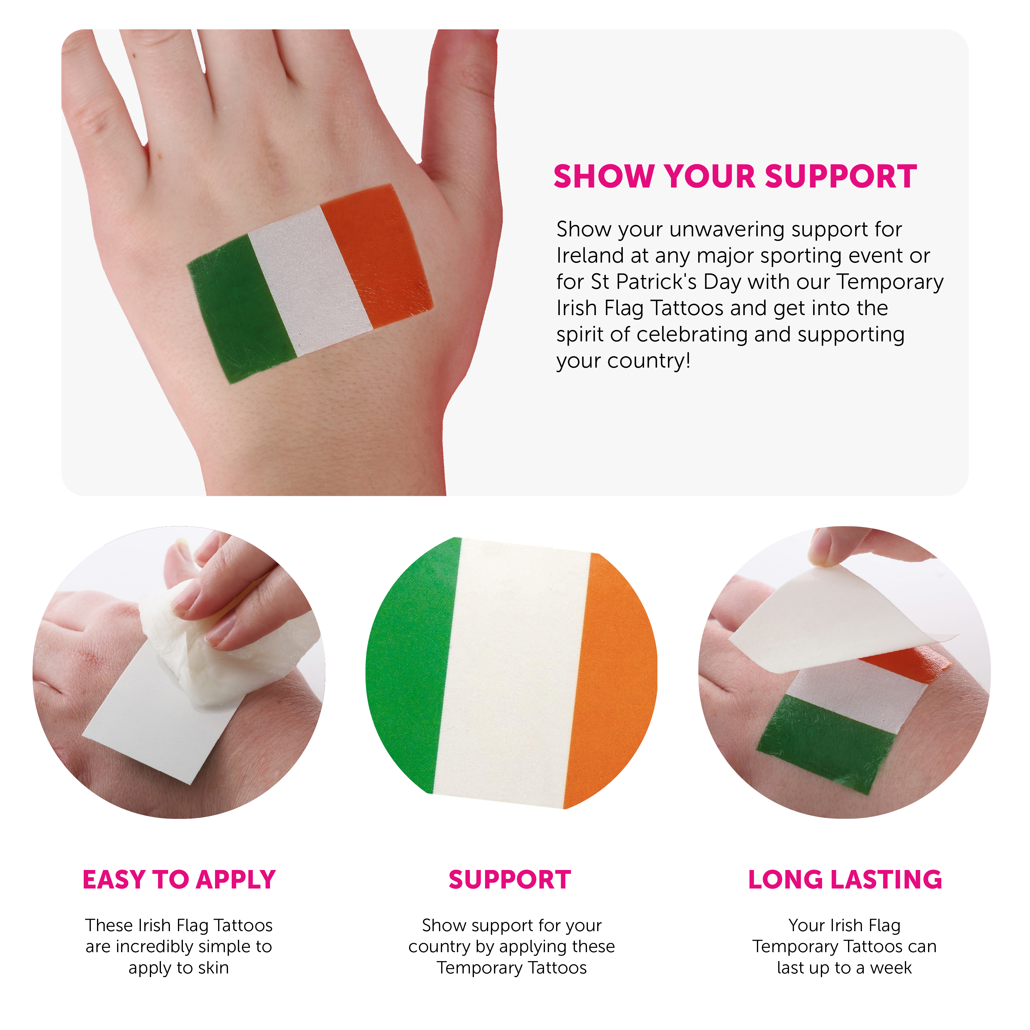 TEMPORARY IRISH FLAG TATTOOS: Show your unwavering support for Ireland at any major sporting event or for St Patrick's Day with our Temporary Irish Flag Tattoos and get into the spirit of celebrating and supporting your country!