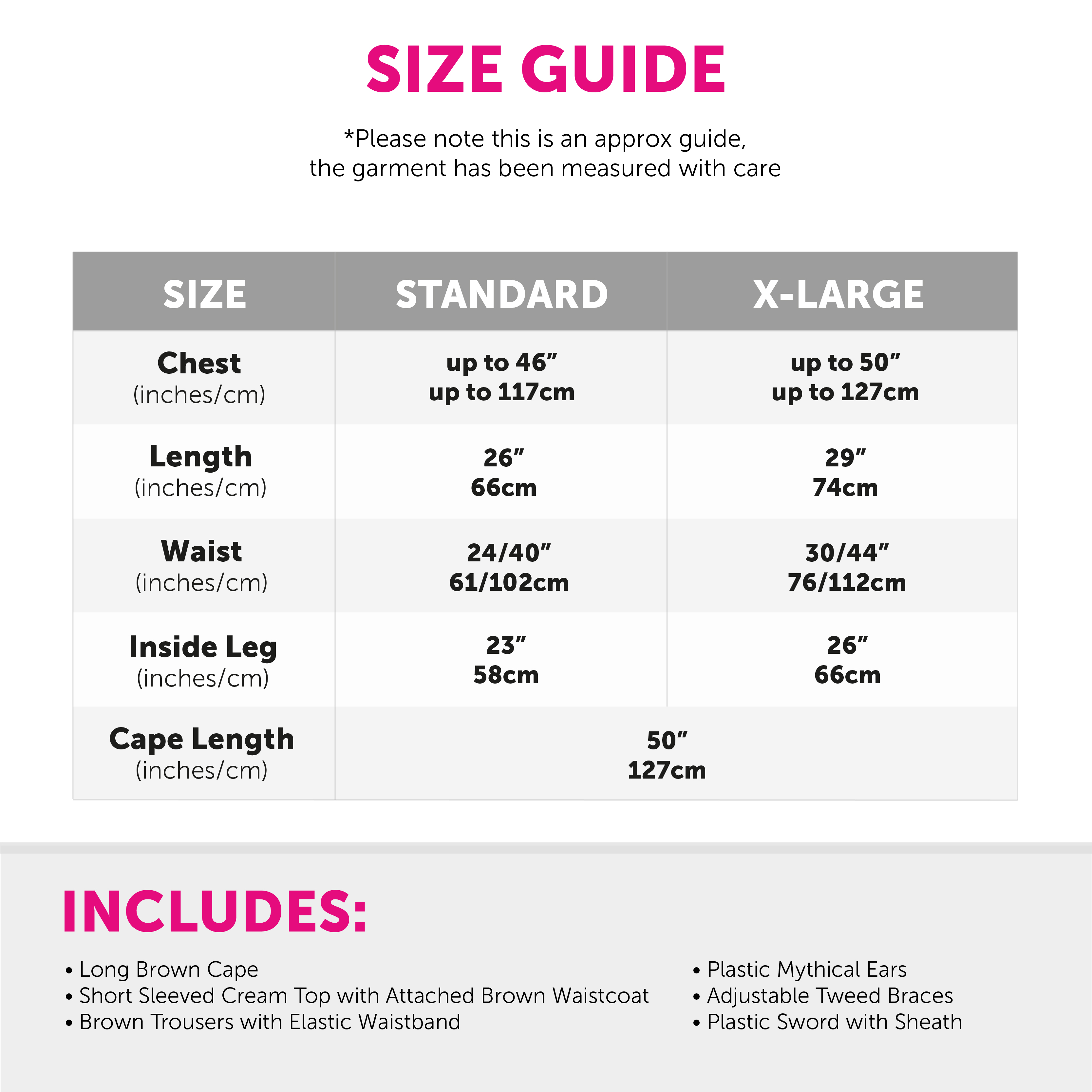 GREAT LENGTH: Your Brown Cape is a great size, measuring a full length of 50" (127cm), and the Sword measures a full length of 15.5" (40cm), the perfect additions to your fancy dress look!