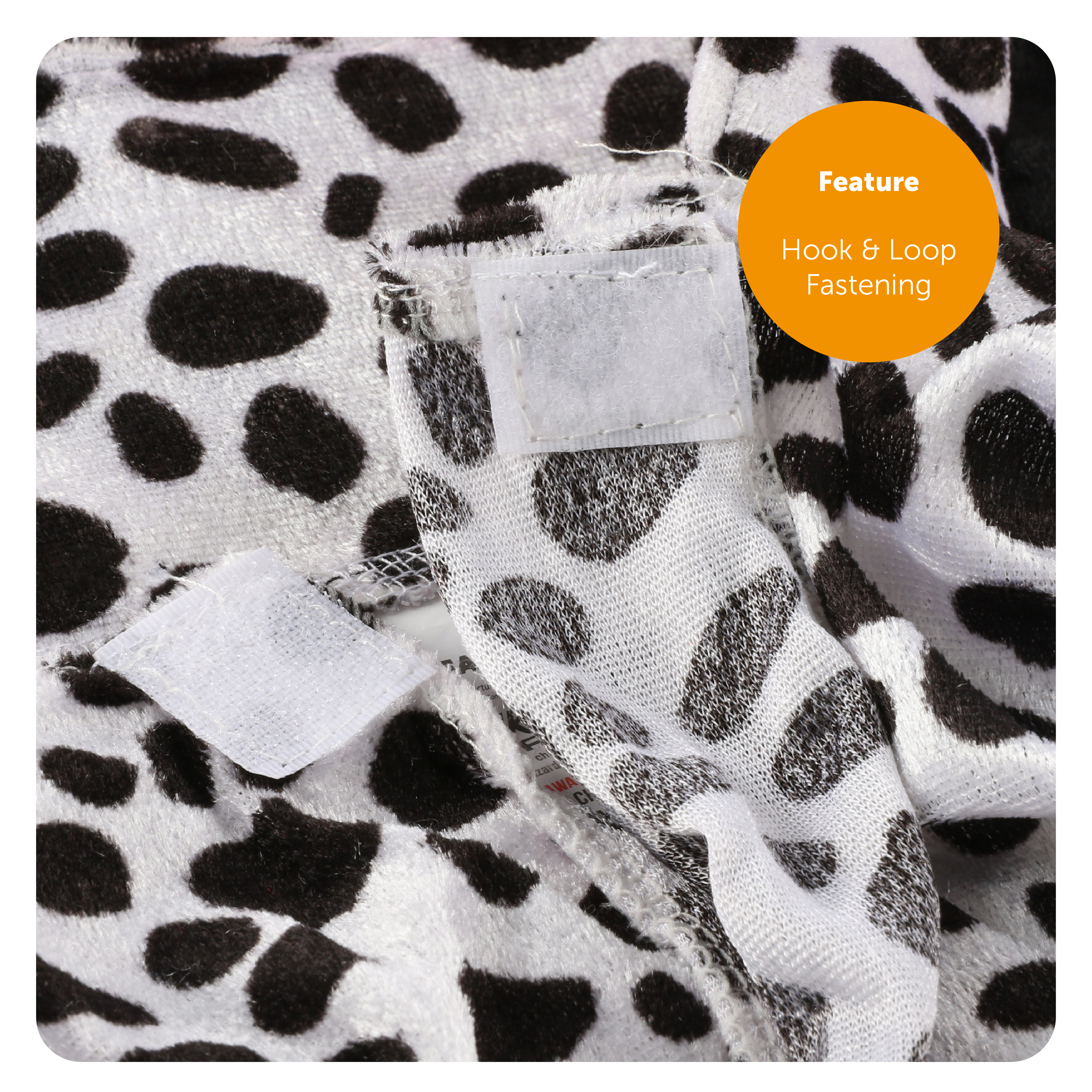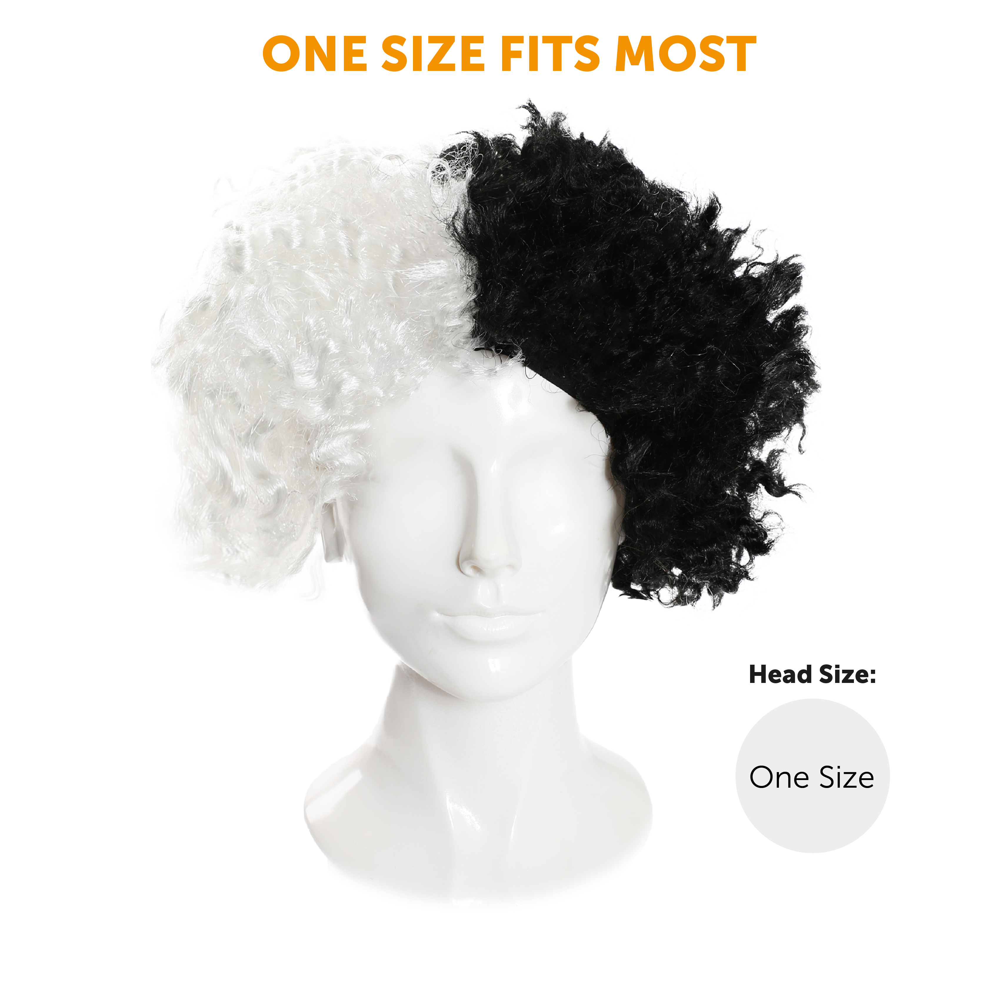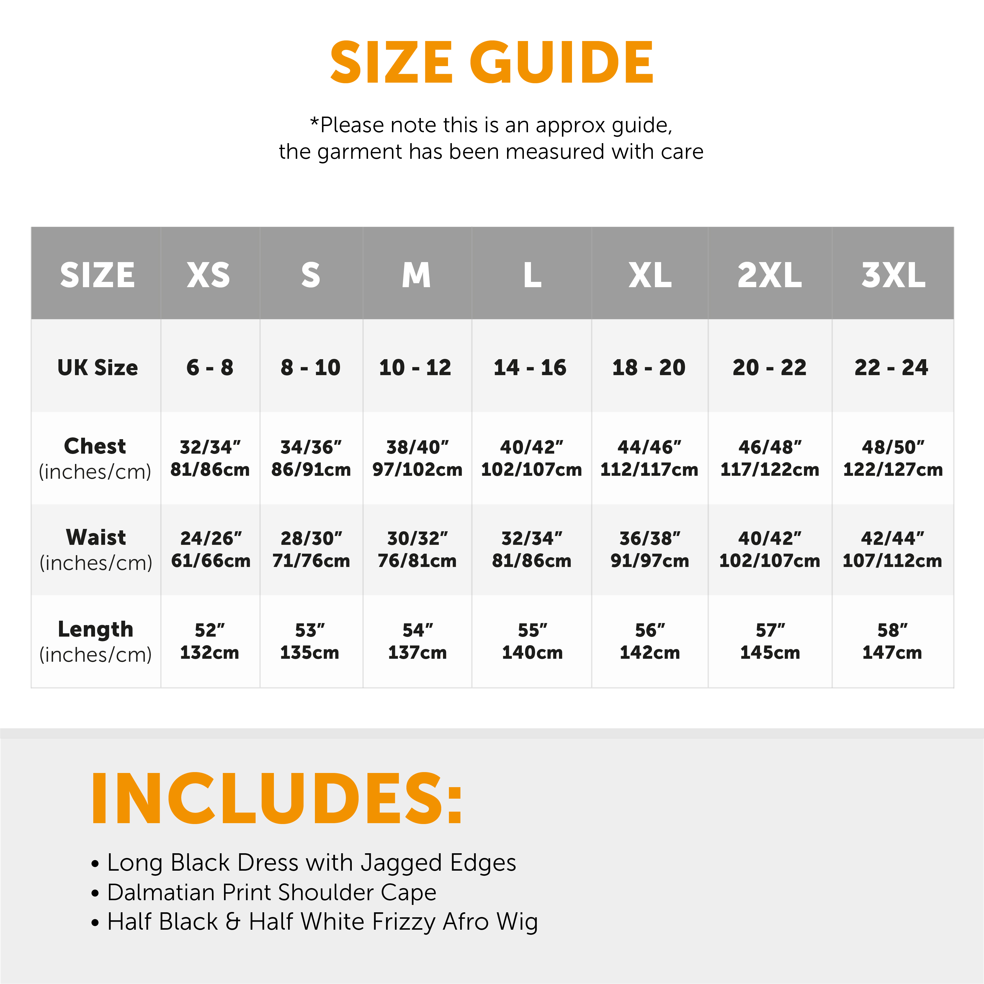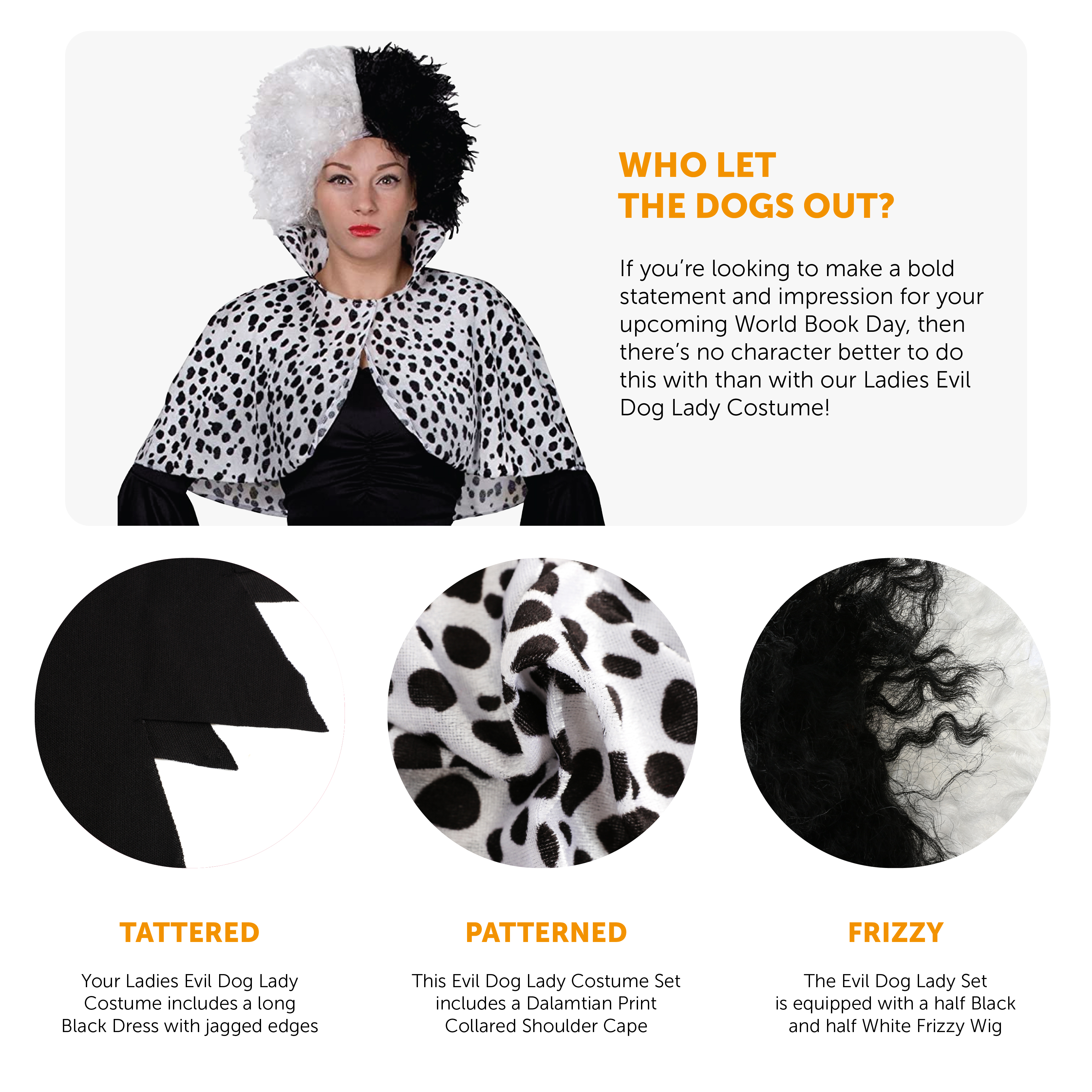 COSTUME DETAILS: Your Ladies Evil Dog Lady Costume includes a Dalmatian Print Over-the-Shoulder Cape, a Long Black Dress with pointed edge trim, and a Half Black and Half White Crimped Afro Wig, the perfect costume set!