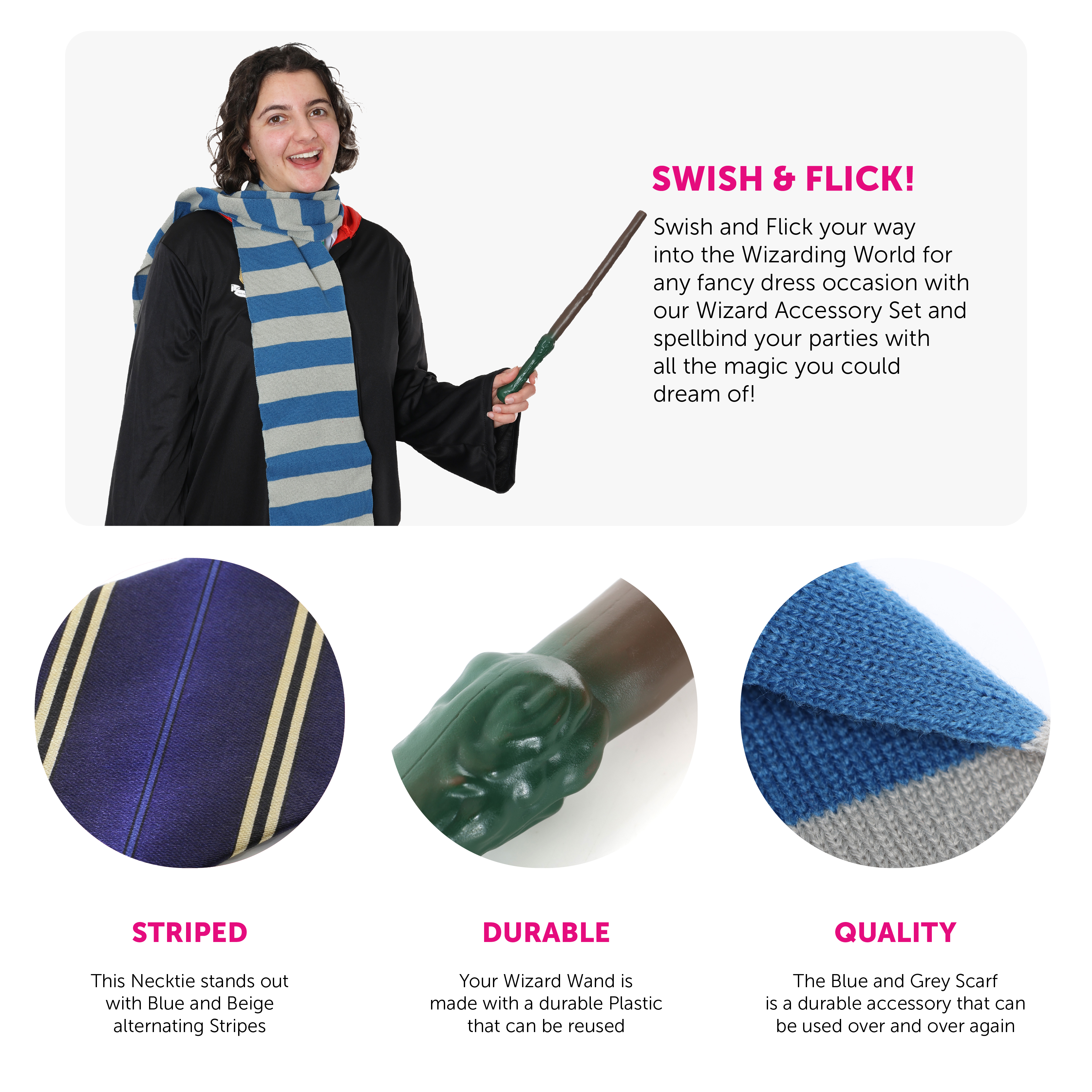 SET INCLUDES: Your Wizard Accessory Set includes a Blue and Grey Striped Scarf, a Striped Tie, Round Glasses with Plastic Frames, and a Plastic Wizard Wand!
