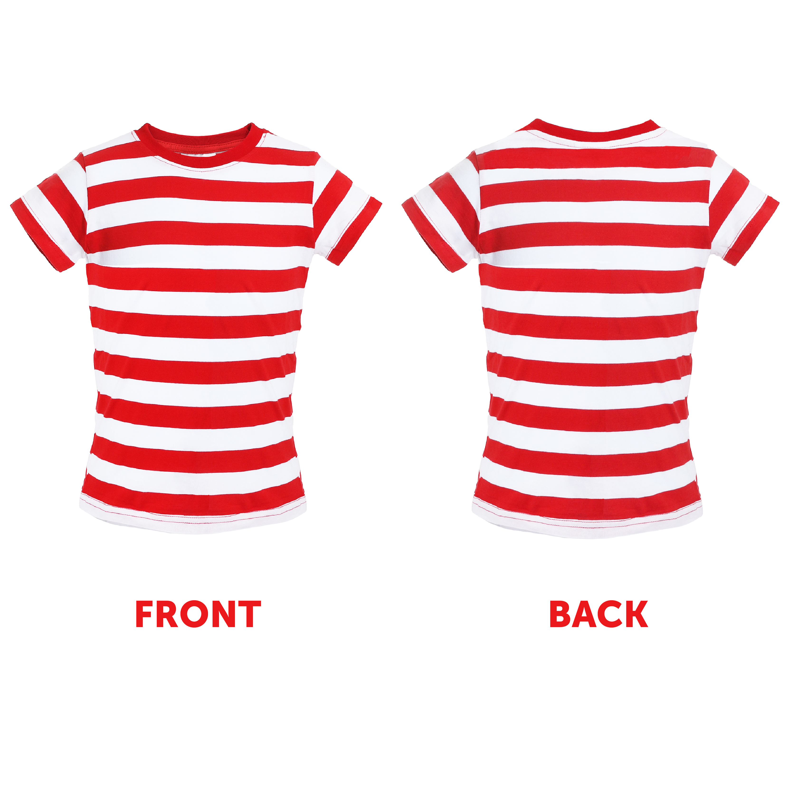FIND ME SHORT-SLEEVED COSTUME DETAILS: Your Child’s Find Me Short-Sleeved Set includes a Short Sleeved Red and White Striped T-shirt, Black Circular Glasses with lenses, and a Red and White Striped Bobble Hat!