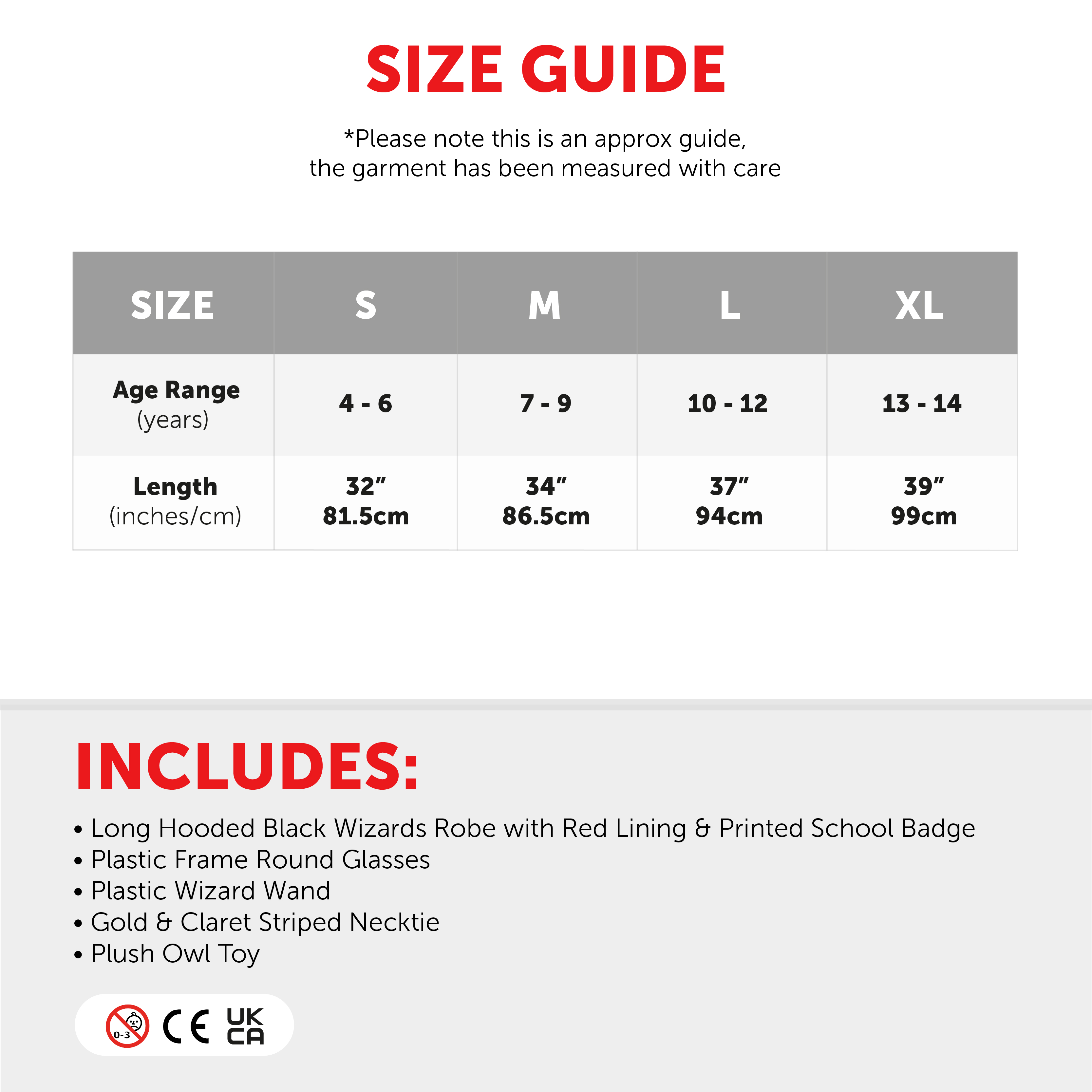 AVAILABLE IN MULTIPLE SIZES: Your Child’s Wizard Robe is available in multiple sizes from Small to X-Large: Small (4 - 6 years) Length 32" (81.5cm) | Medium (7 - 9 years) Length 34" (86.5cm) | Large (10 - 12 years) Length 37" (94cm) | X Large (13 - 14 years) Length 39" (99cm)