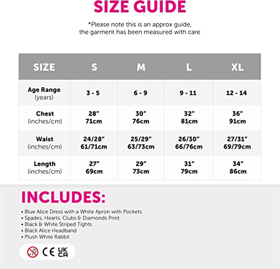 CHILD’S ALICES WONDERLAND FANCY DRESS COSTUME: Jump down the rabbit hole this World Book Day and make your Wonderland come to life for your young ones with our Child’s Alice’s Wonderland Fancy Dress Costume for Girls!