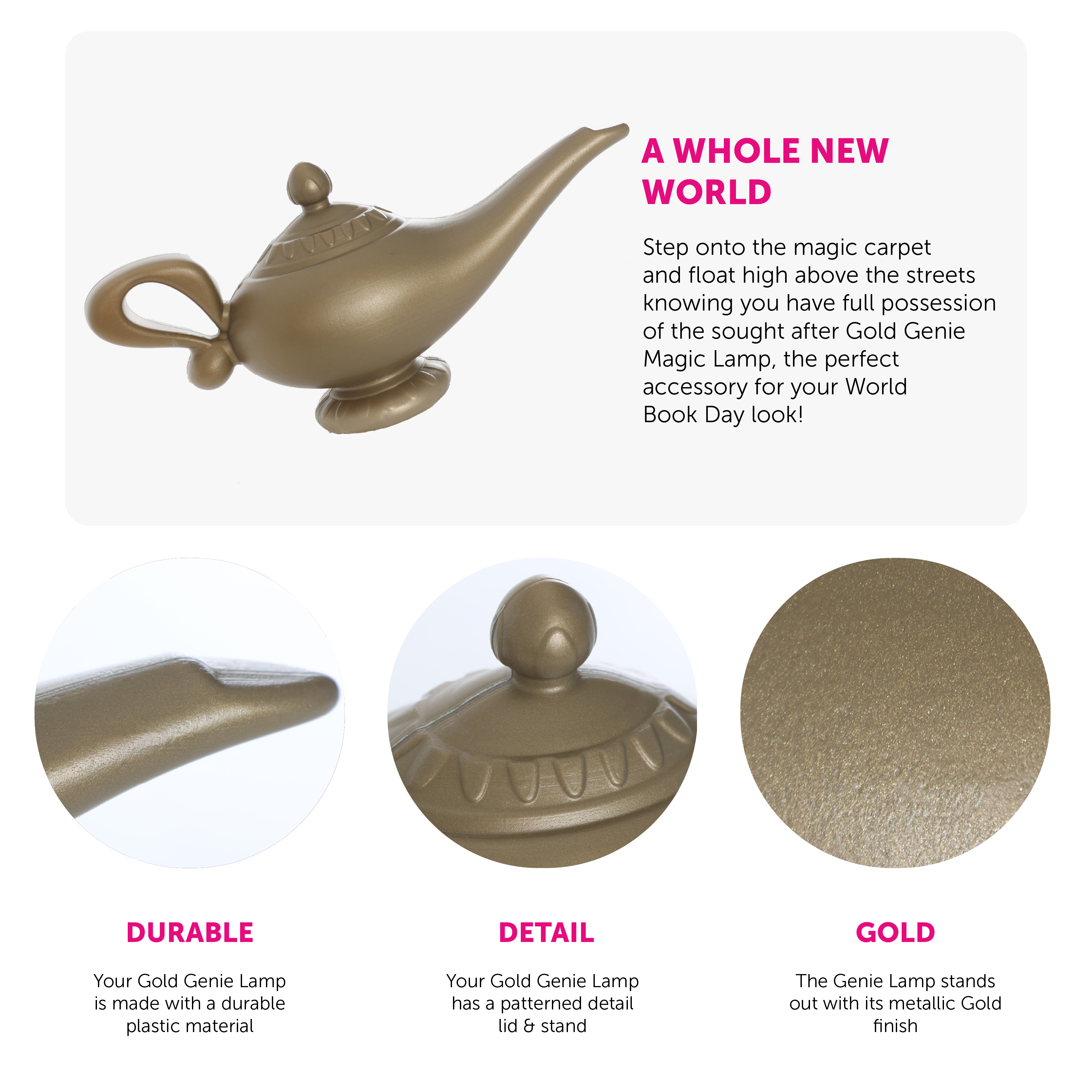 GOLD GENIE MAGIC LAMP: Step onto the magic carpet and float high above the streets knowing you have full possession of the sought after Gold Genie Magic Lamp, the perfect accessory for your World Book Day look!