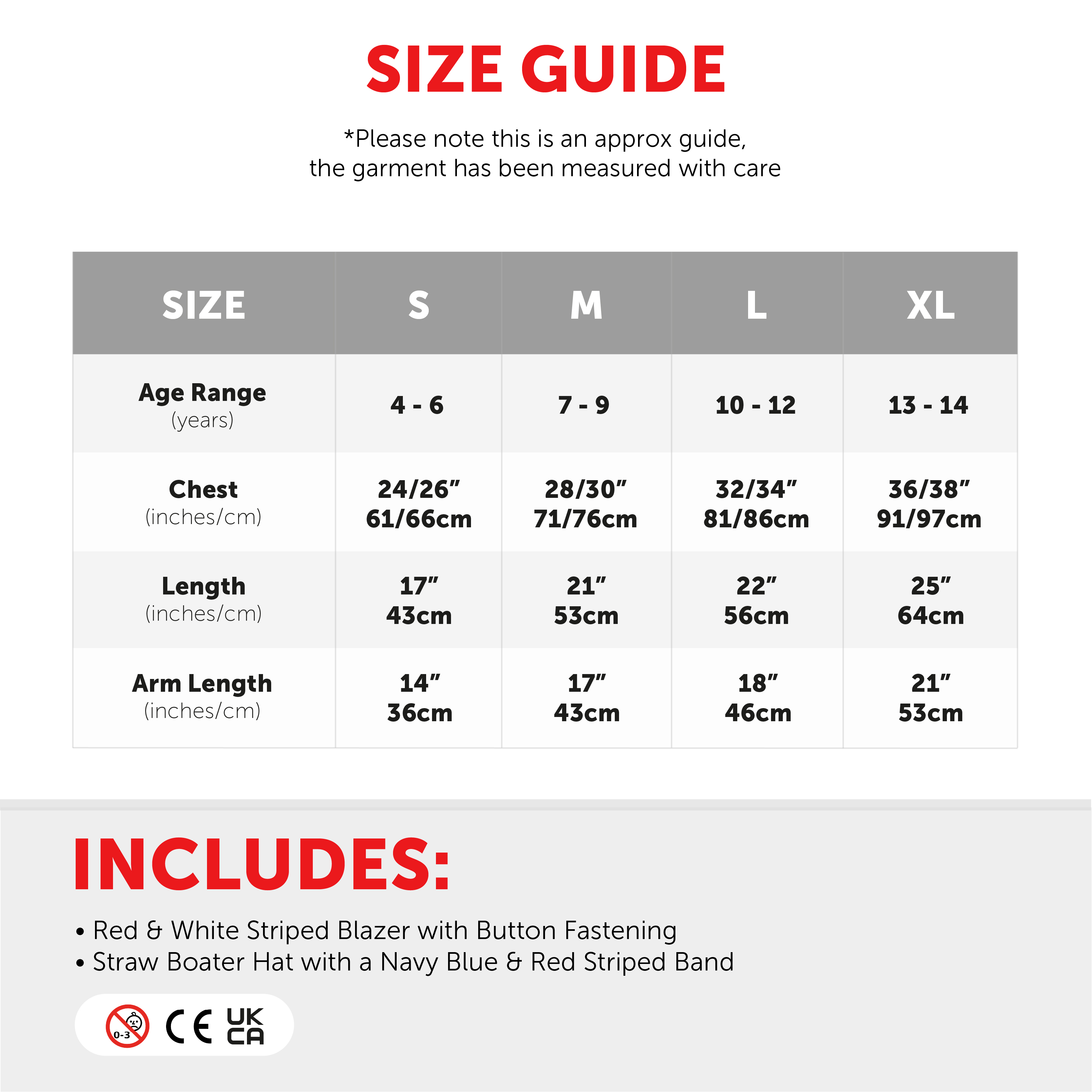 AVAILABLE IN MULTIPLE SIZES: Your Child's Striped Barbershop Blazer is available in various sizes for you to find the perfect fit, from Small to X-Large: Small - (4 - 6 years), Chest: 24/26" (61/66cm), Length: 17" (43cm), Arm Length: 14" (36cm) | Medium - (7 - 9 years), Chest: 28/30" (71/76cm), Length: 21" (53cm), Arm Length: 17" (43cm) | Large - (10 - 12 years), Chest: 32/34" (81/86cm), Length: 22" (56cm), Arm Length: 18" (46cm) | X-Large - (13 - 14 years), Chest: 36/38" (91/97cm), Length: 25" (64cm), Arm Length: 21" (53cm)