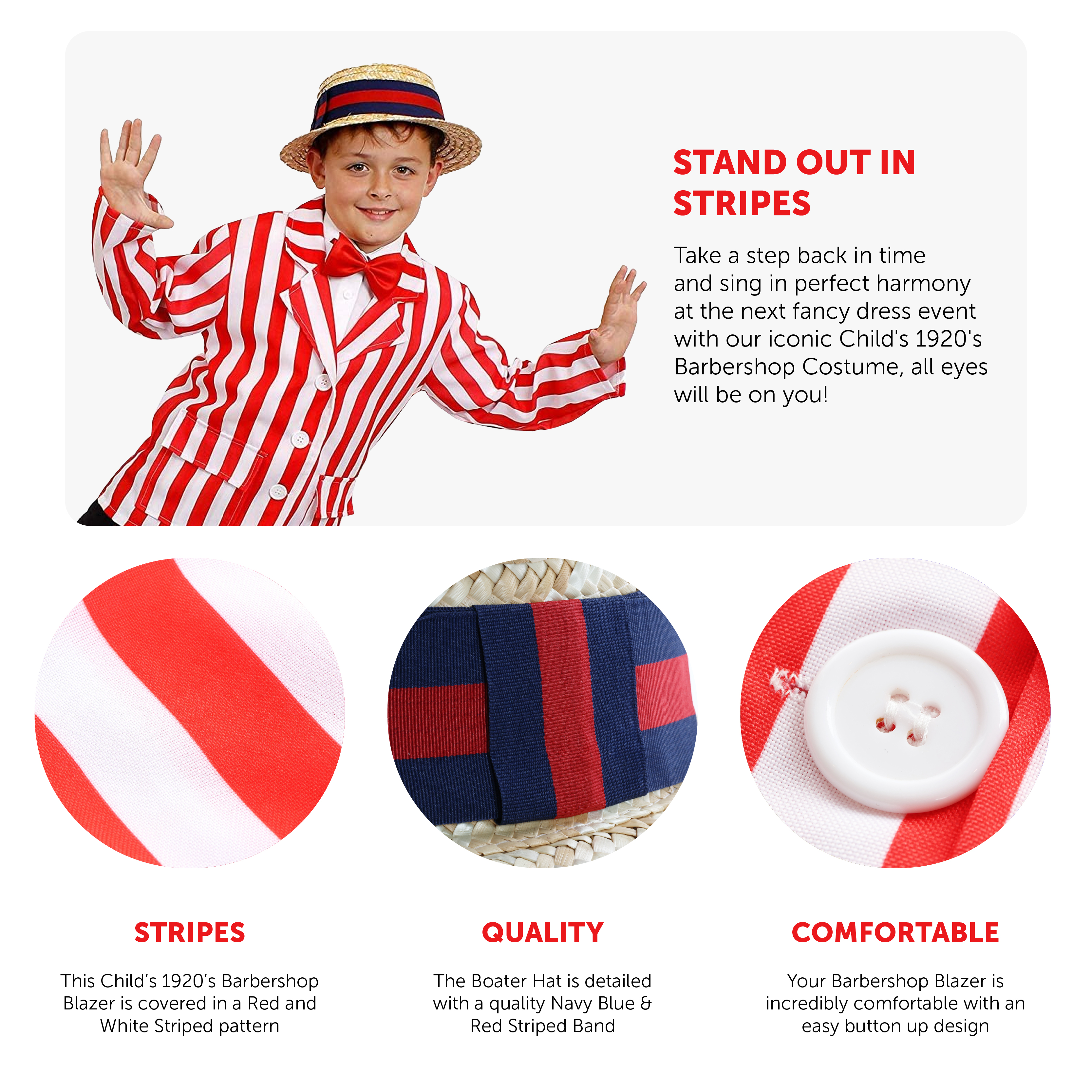 COSTUME DETAILS: This Child's 1920's Barbershop Costume includes a comfortable Blazer Jacket covered in an iconic Red and White Striped pattern with easy, button up fastening, and a Straw Boater Hat with a Navy Blue and Red Band, you'll stand out at any fancy dress event!
