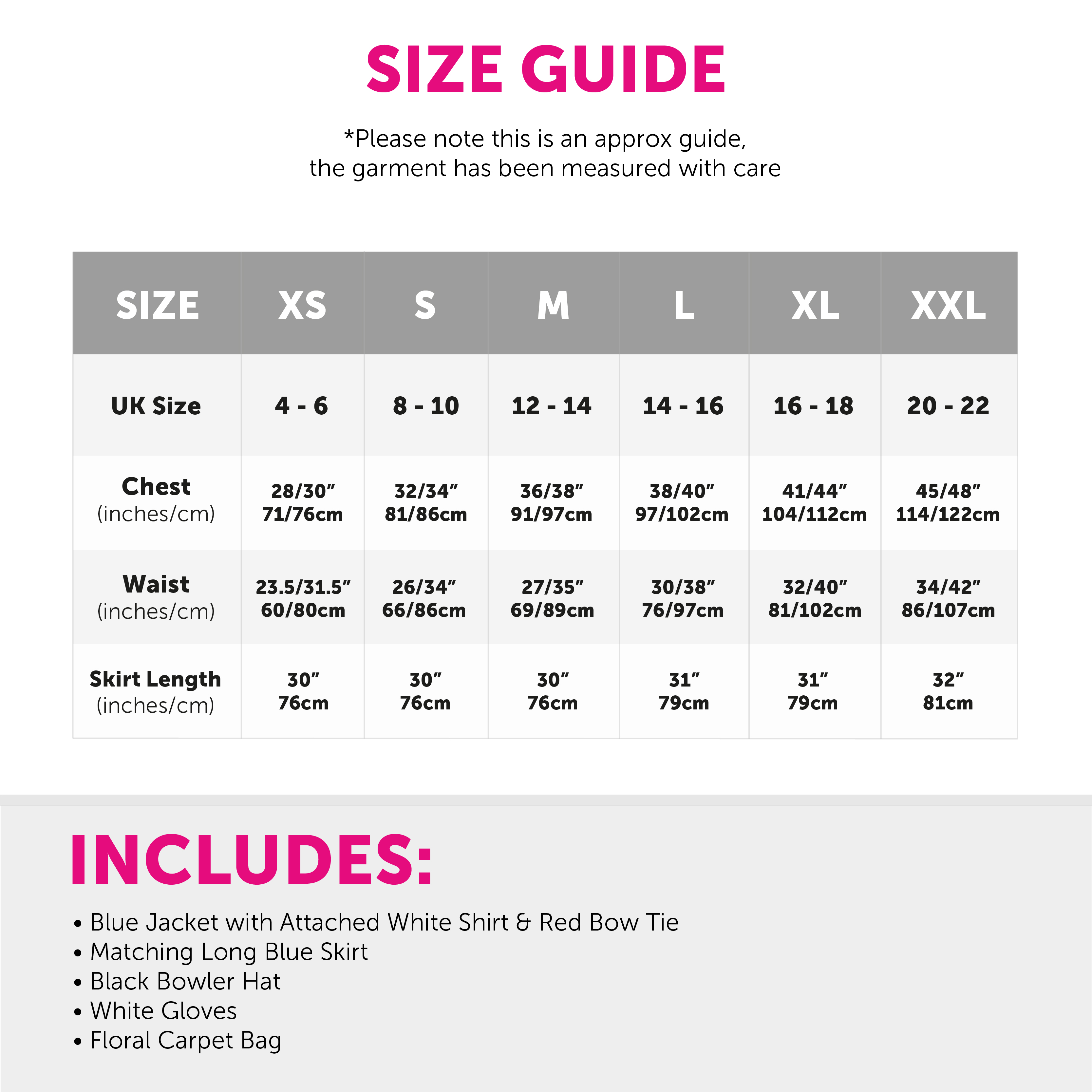 AVAILABLE IN MULTIPLE SIZES: Our Ladies Magical Nanny Costume is available in sizes X-Small – XX-Large: X-Small (UK 4 - 6) Chest 28/30" (71/76cm), Waist 23.5/31.5" (60/80cm), Skirt Length 30" (76cm) | Small (UK 8 - 10) Chest 32/34" (81/86cm), Waist 26/34" (66/86cm), Skirt Length 30" (76cm) | Medium (UK 12 - 14) Chest 36/38" (91/97cm), Waist 27/35" (69/89cm), Skirt Length 30" (76cm) | Large (UK 14 - 16) Chest 38/40" (97/102cm), Waist 30/38" (76/97 cm), Skirt Length 31" (79cm) | X-Large (UK 16 - 18) Chest 41/44" (104/112cm), Waist 32/40" (81/102cm), Skirt Length 31" (79cm) | XX-Large (UK 20 - 22) Chest 45/48" (114/122cm), Waist 34/42" (86/107cm), Skirt Length 32" (81cm)
