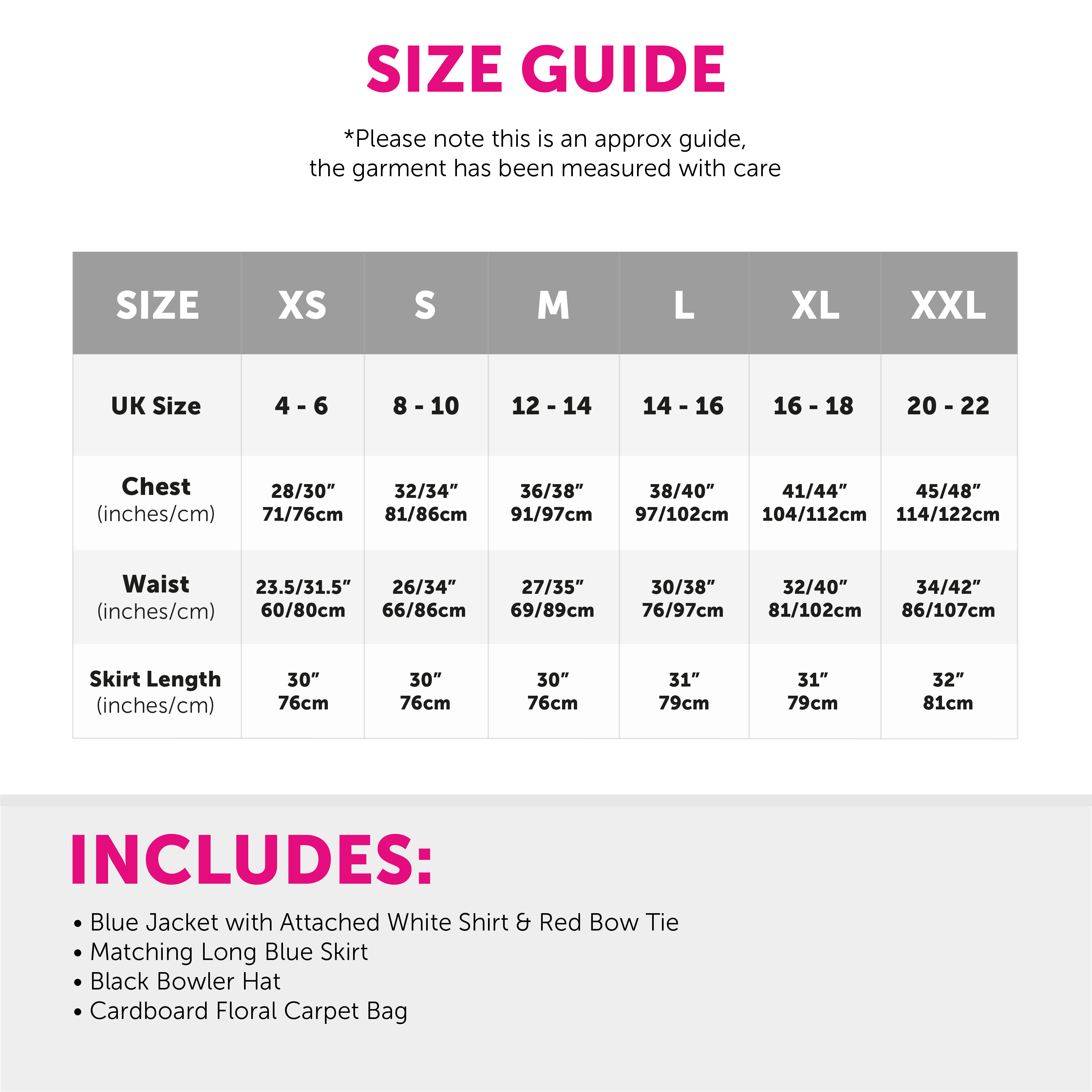 AVAILABLE IN MULTIPLE SIZES: Our Ladies Magical Nanny Costume is available in sizes X-Small – XX-Large: X-Small (UK 4 - 6) Chest 28/30" (71/76cm), Waist 23.5/31.5" (60/80cm), Skirt Length 30" (76cm) | Small (UK 8 - 10) Chest 32/34" (81/86cm), Waist 26/34" (66/86cm), Skirt Length 30" (76cm) | Medium (UK 12 - 14) Chest 36/38" (91/97cm), Waist 27/35" (69/89cm), Skirt Length 30" (76cm) | Large (UK 14 - 16) Chest 38/40" (97/102cm), Waist 30/38" (76/97 cm), Skirt Length 31" (79cm) | X-Large (UK 16 - 18) Chest 41/44" (104/112cm), Waist 32/40" (81/102cm), Skirt Length 31" (79cm) | XX-Large (UK 20 - 22) Chest 45/48" (114/122cm), Waist 34/42" (86/107cm), Skirt Length 32" (81cm)
