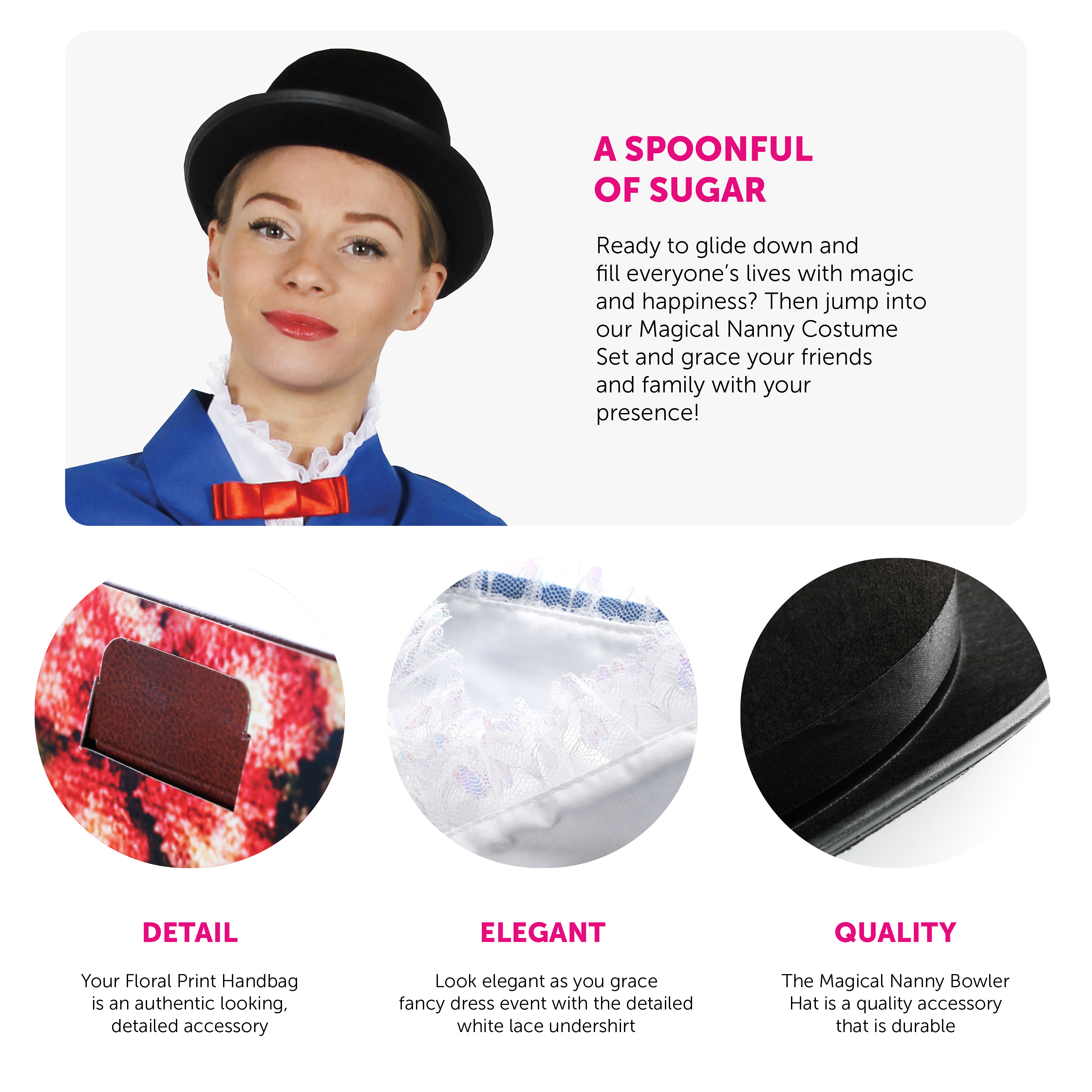 LADIES MAGICAL NANNY COSTUME SET: Ready to glide down and fill everyone’s lives with magic and happiness? Then jump into our Magical Nanny Costume Set and grace your friends and family with your presence!
