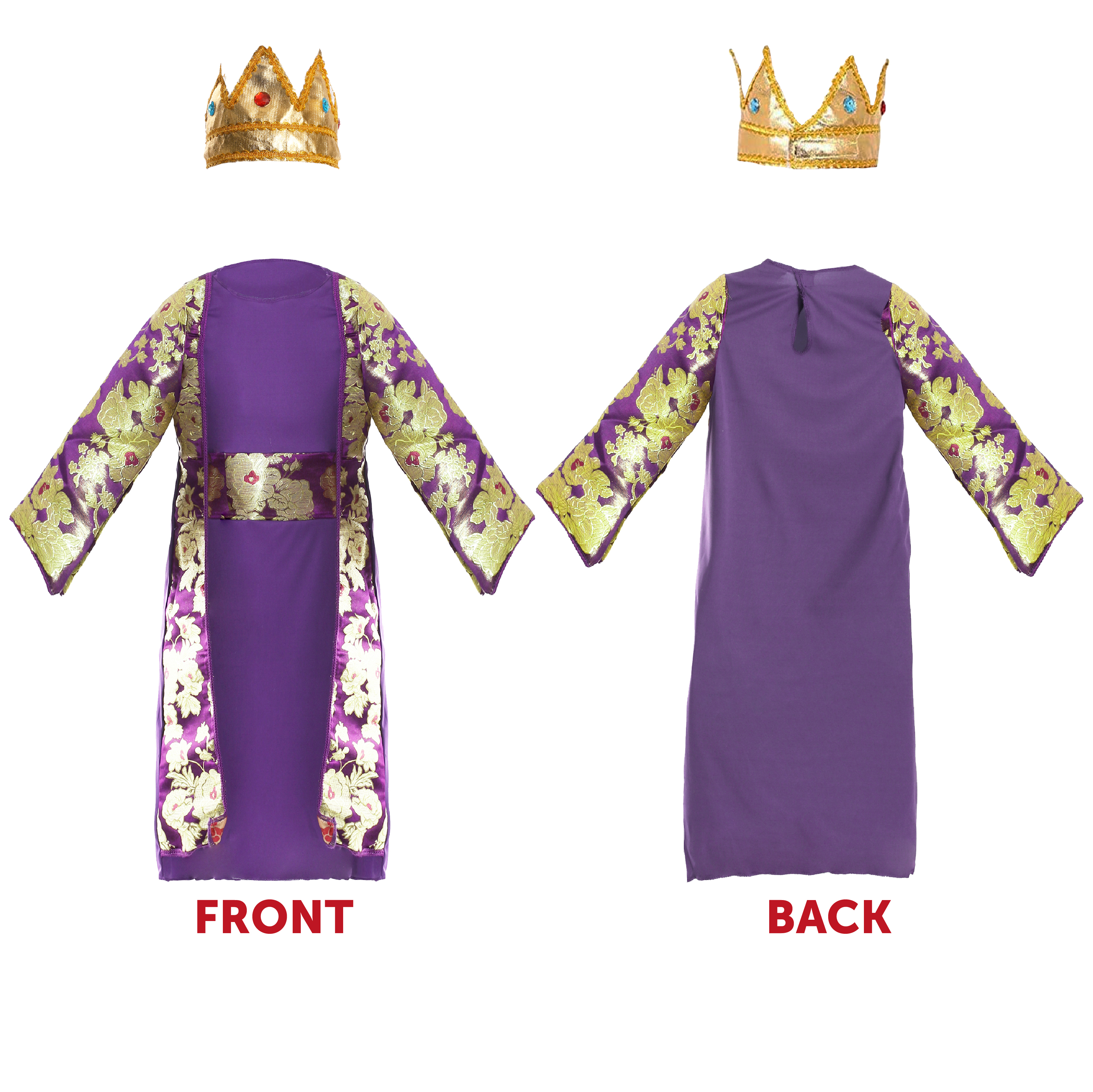COSTUME DETAILS: Your Child’s Purple King Costume includes a Long Purple Tunic, an attached Long Purple and Gold Cloak, and a Gold Crown to complete your Costumes look!