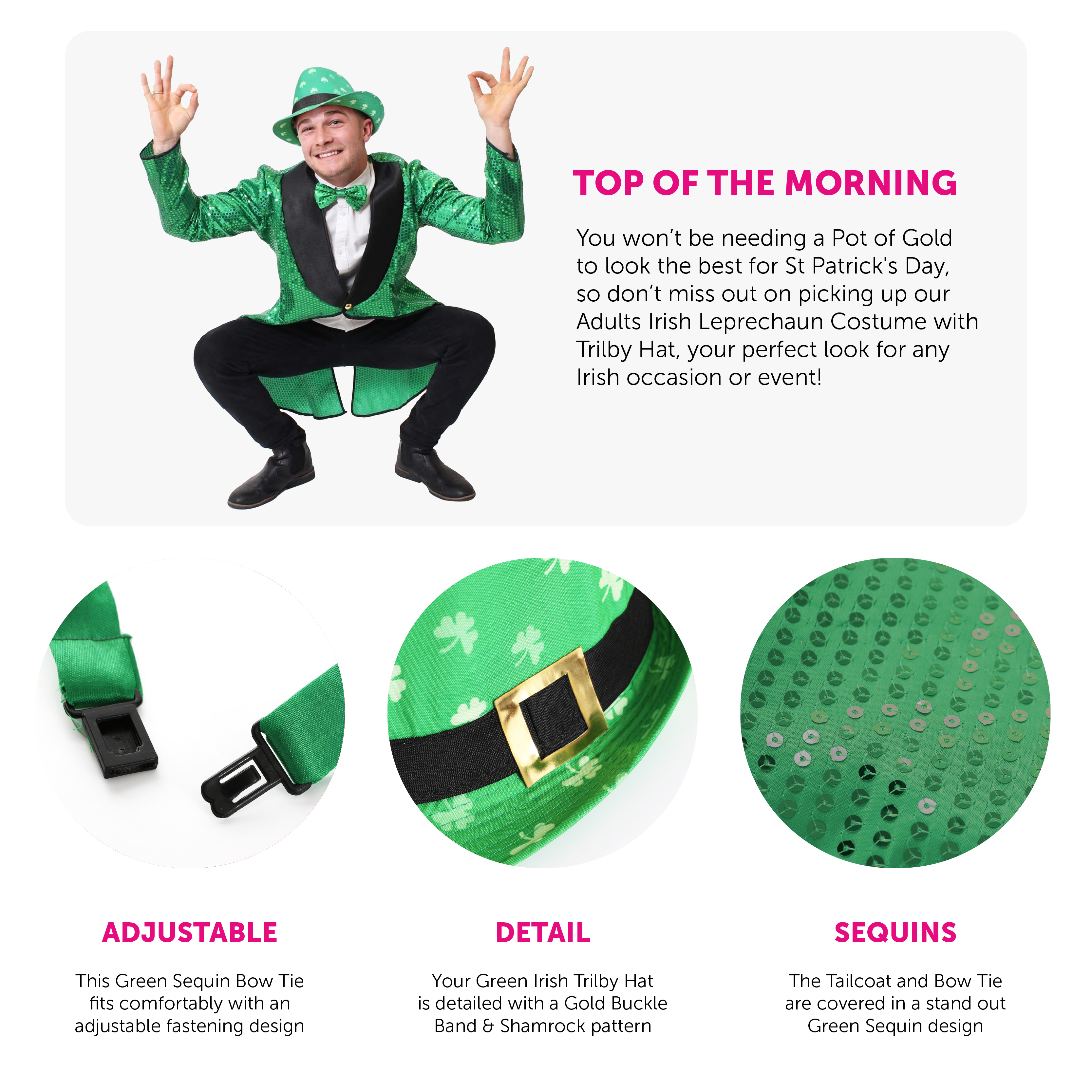 COSTUME DETAILS: Your Adults Leprechaun Costume includes a vibrant Green Sequin covered Tailcoat with Black edging and Button fastening, an adjustable Green Sequin Bow Tie, and a Green Trilby Hat covered in Green Sequins, a fantastic Irish look for any fancy dress celebration!