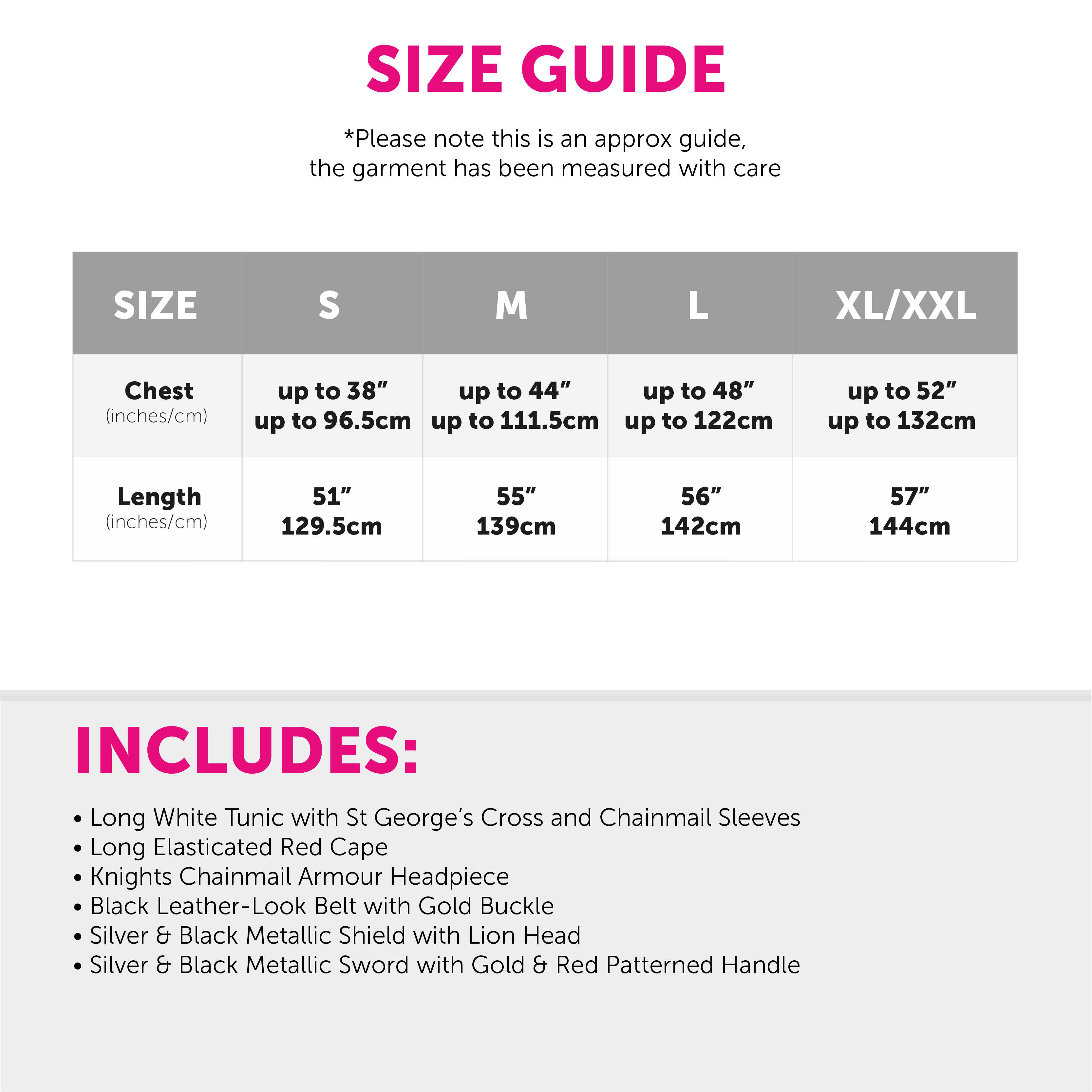 AVAILABLE IN MULTIPLE SIZES: This Adults St George's Knight Costume is available in a variety of sizes from Small to XX-Large: Small - Chest: Up to 38" (96.5cm), Length: 51" (129.5cm) | Medium - Chest: Up to 44" (111.5cm), Length: 55" (139cm) | Large - Chest: Up to 48" (122cm), Length: 56" (142cm) | X-Large/XX-Large - Chest: Up to 52" (132cm), Length: 57" (144cm)