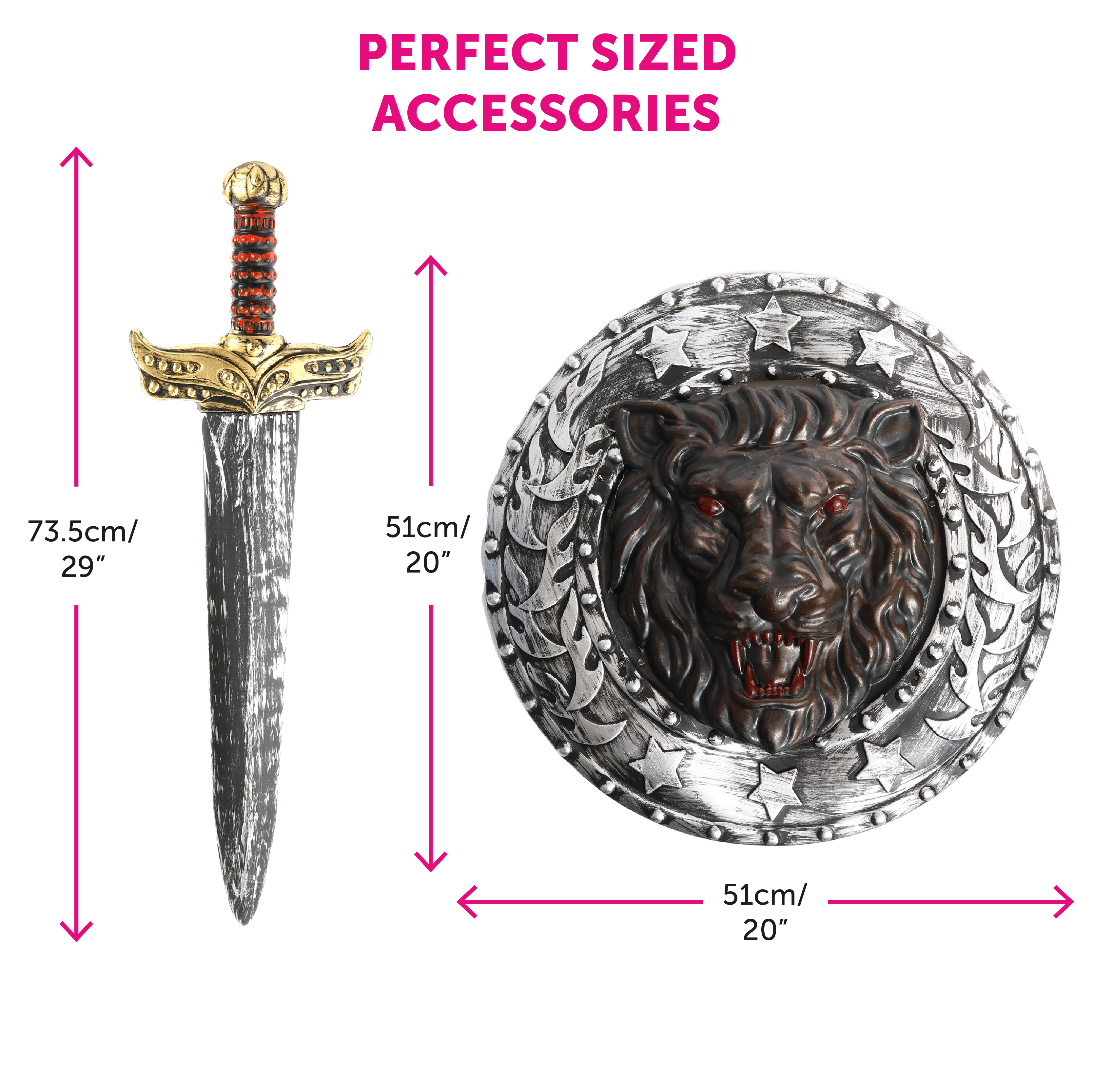 PERFECT SIZED ACCESSORIES: The Sword and Shield Set are great sized accessories to add to your Knight outfit, with the Sword measuring a length of 29" (73.5cm) and the Shields diameter measuring 20" (51cm)