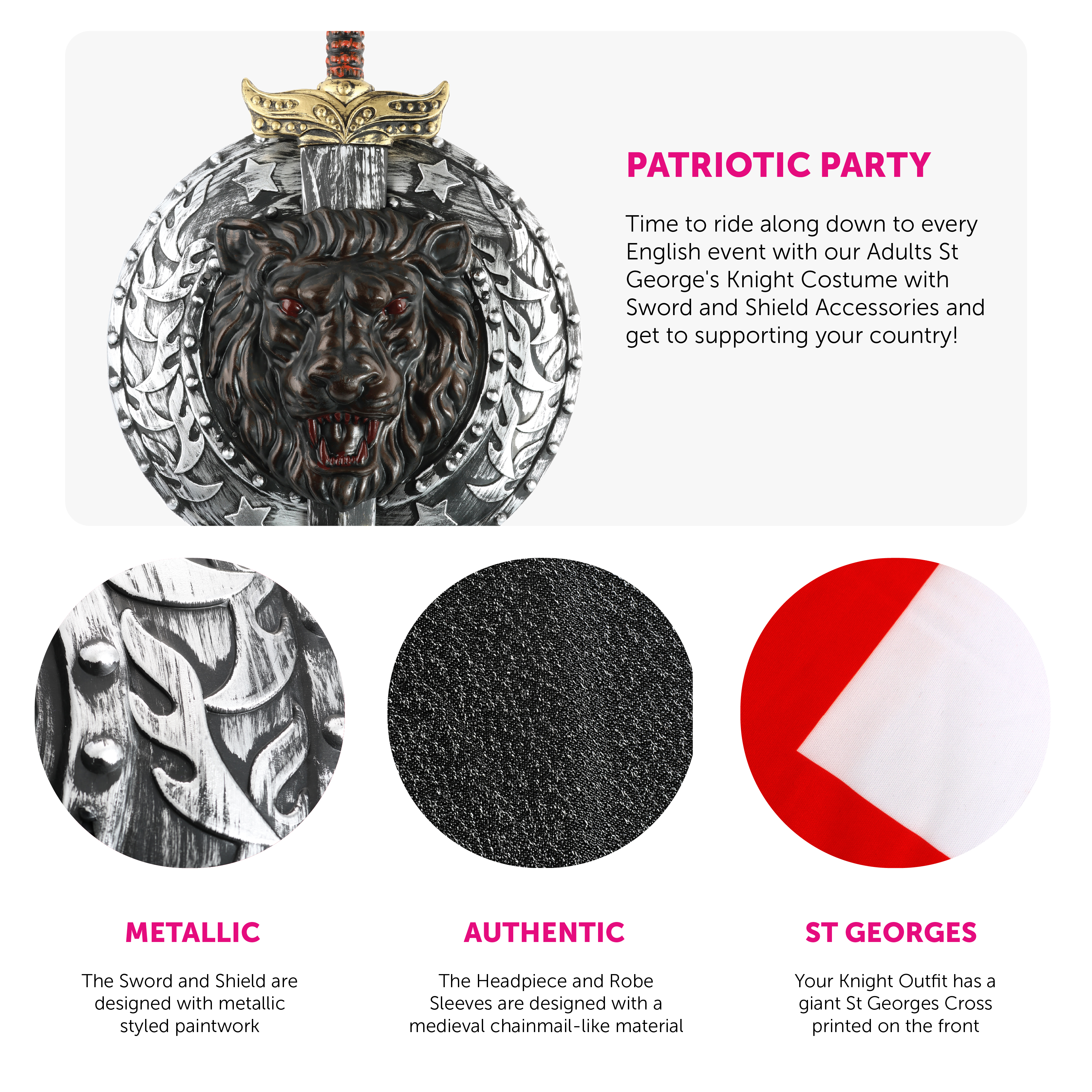 COSTUME INCLUDES: Your Adults Knight Costume includes an English Flag Tunic with a Black Belt, a Red Cape, a Knight Chain Mail Armour Headpiece, a round Black and Silver Shield with a Lion Motif and a matching Black and Silver Sword with a Gold and Red handle, all prepped up for every England Game!