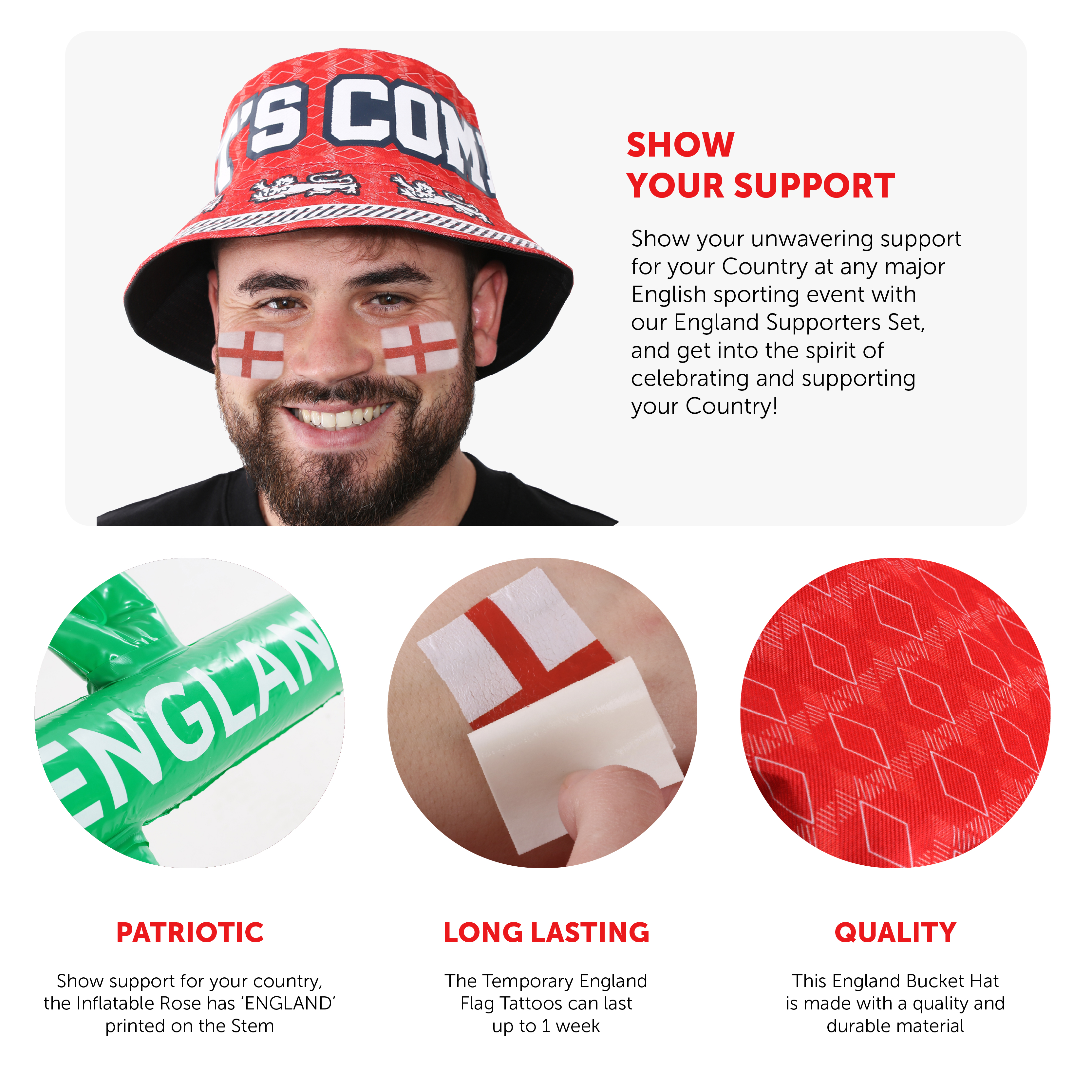 SET INCLUDES: This England Supporters Set includes a Red England Bucket Hat with 'IT'S COMING HOME' printed all the way around, and 3 Lions on the brim, an Inflatable Rose with 'ENGLAND' printed on the Green Stem, and 2x Temporary England Flag Tattoos, the perfect set to support your Country at any English event!