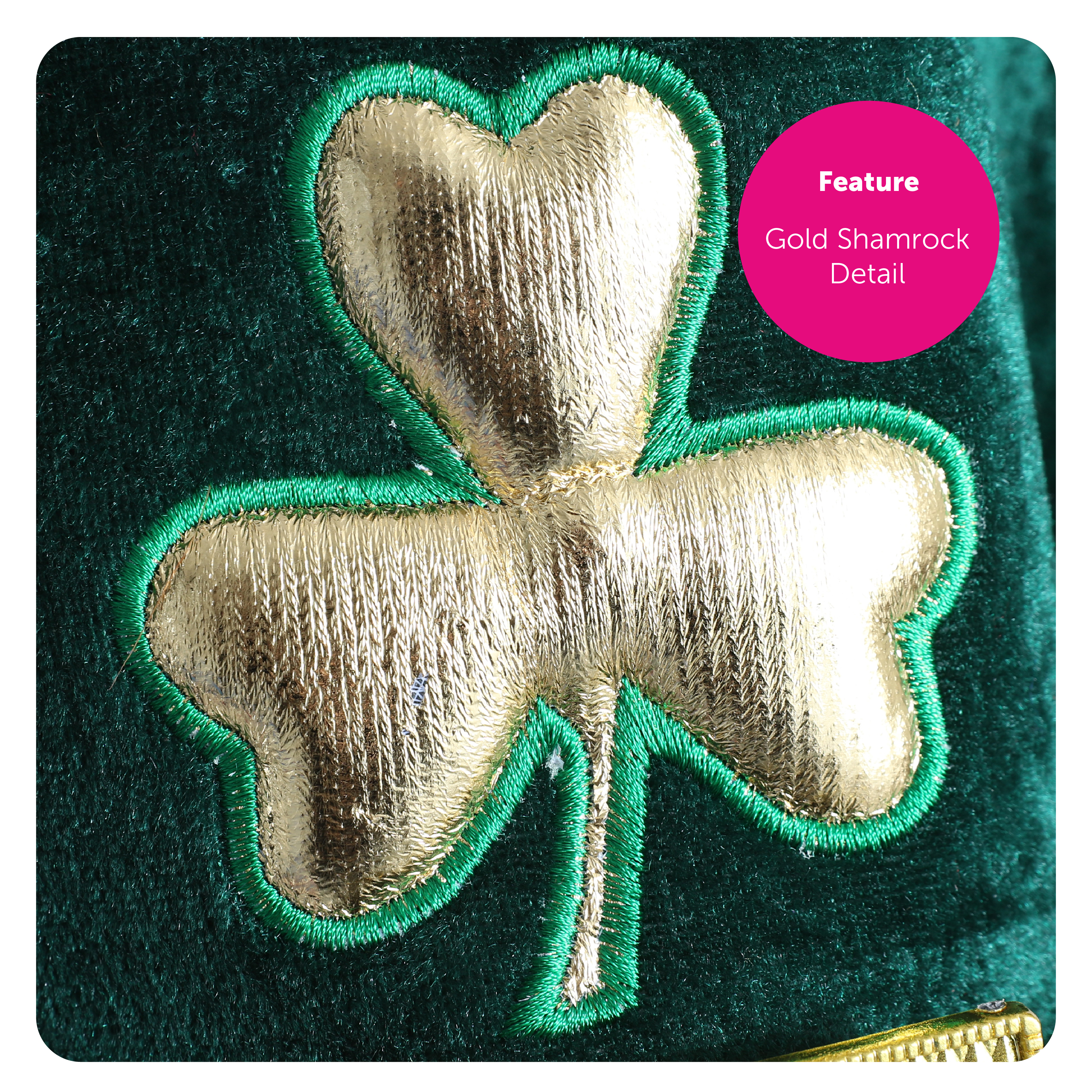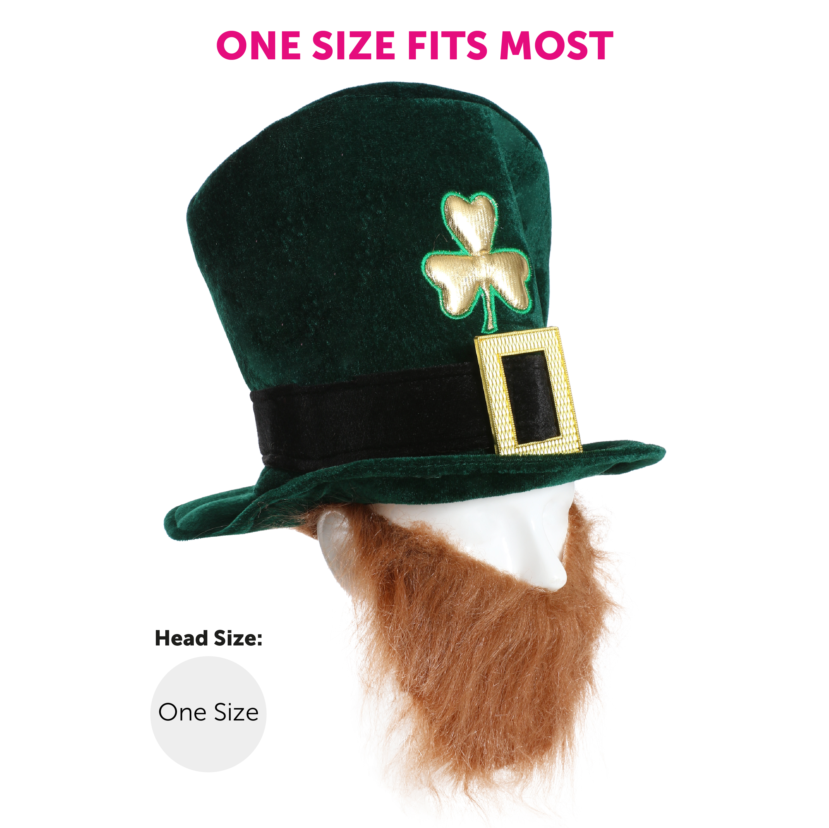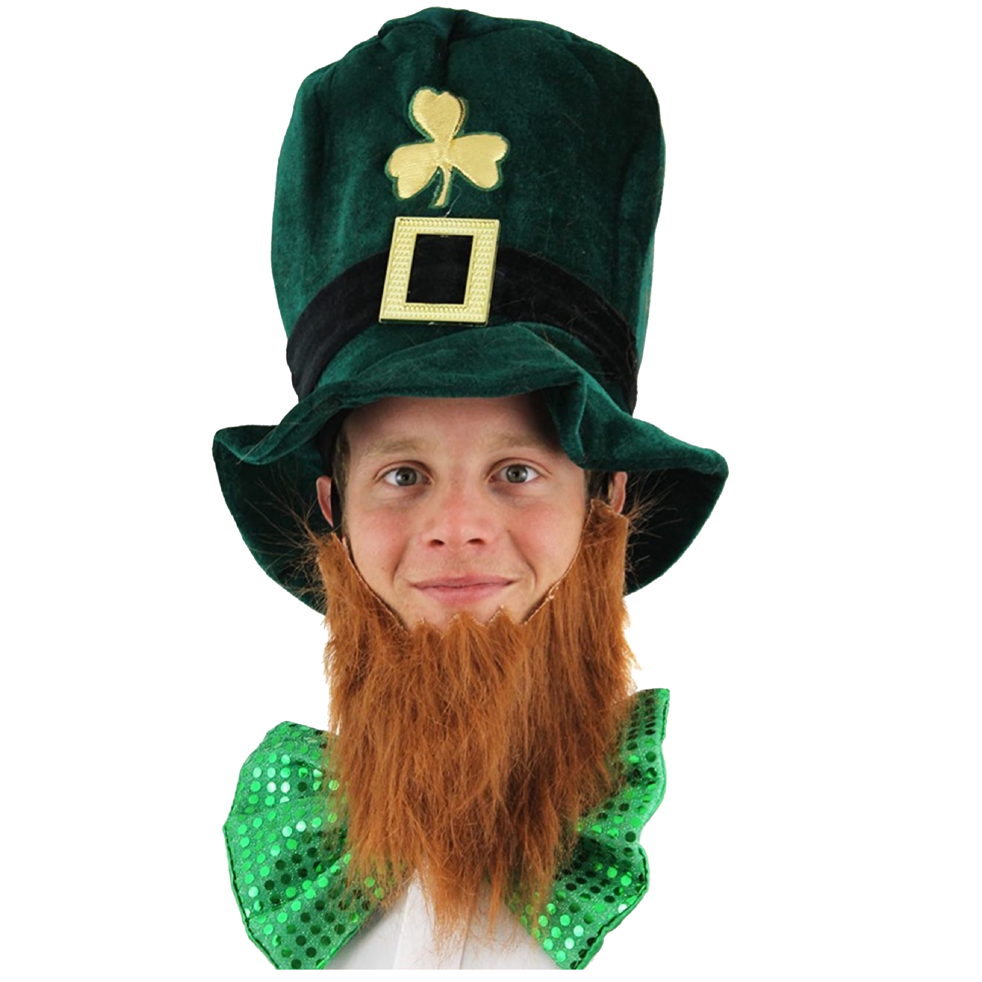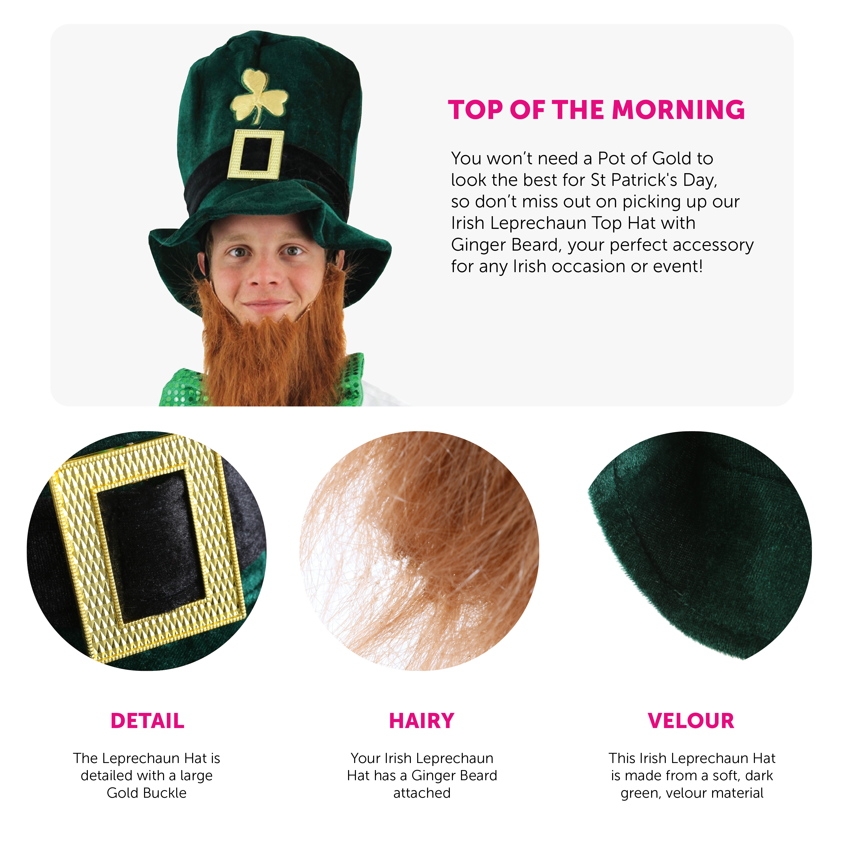 LEPRECHAUN HAT DETAILS: Your Irish Leprechaun Hat is a dark green, soft, velour Top Hat with a Gold Shamrock detail embroidered on the front, a Gold Buckle band and an attached Ginger Beard, a great addition to your Irish outfit!