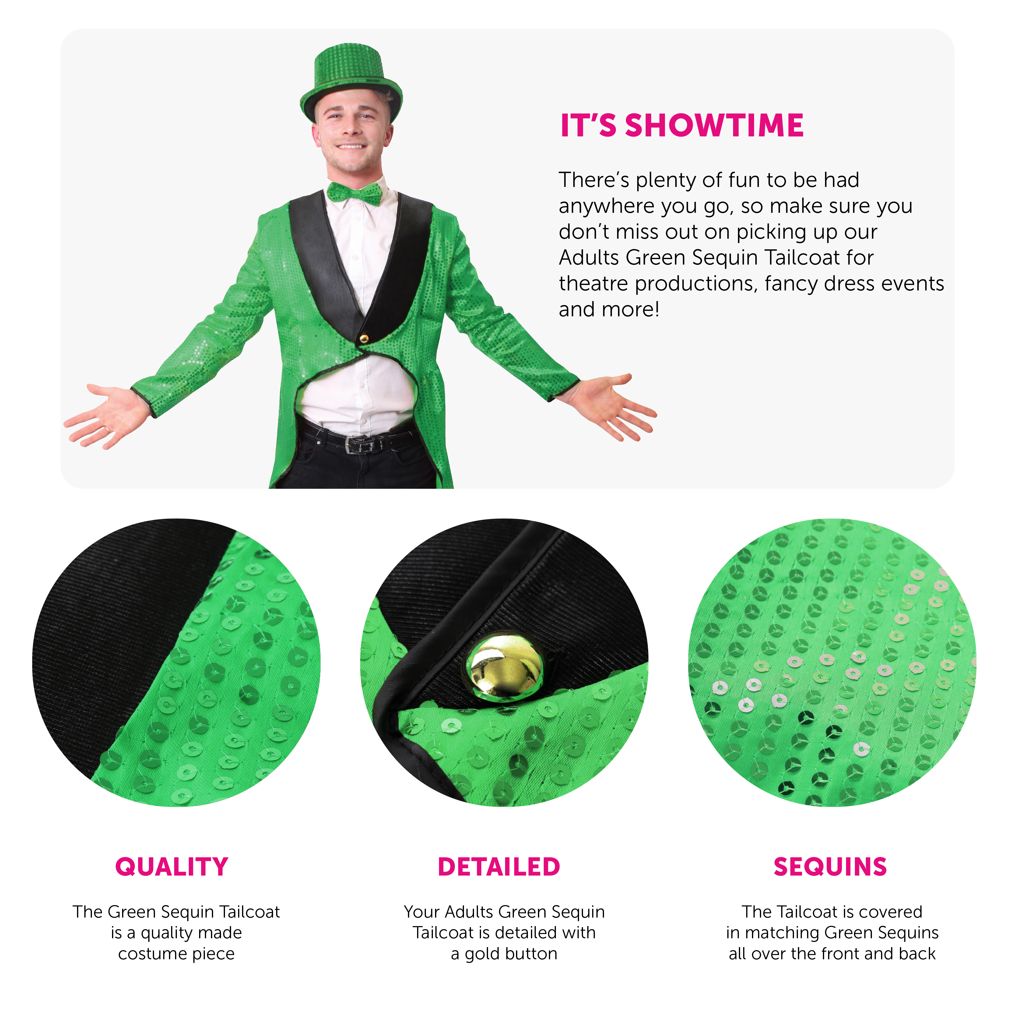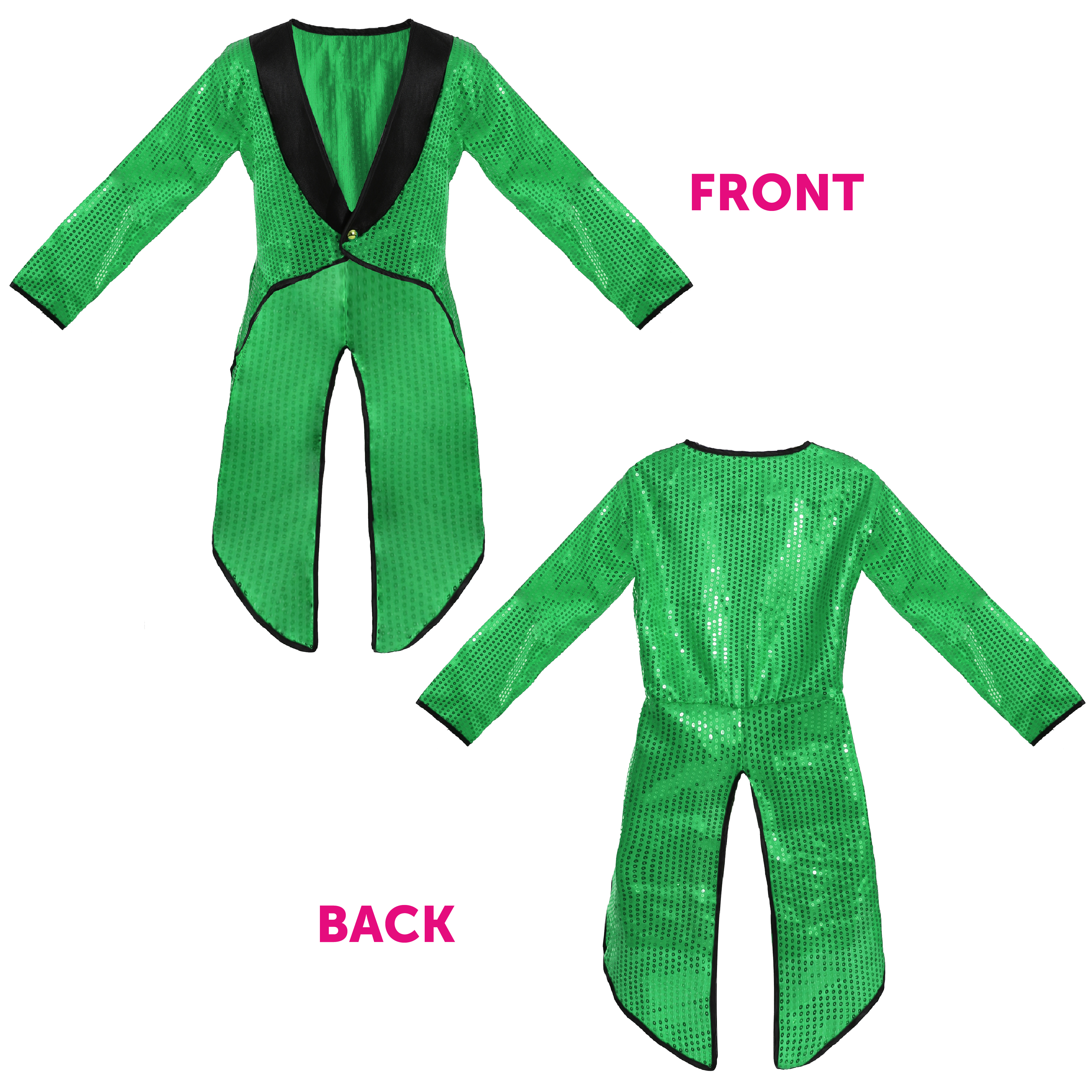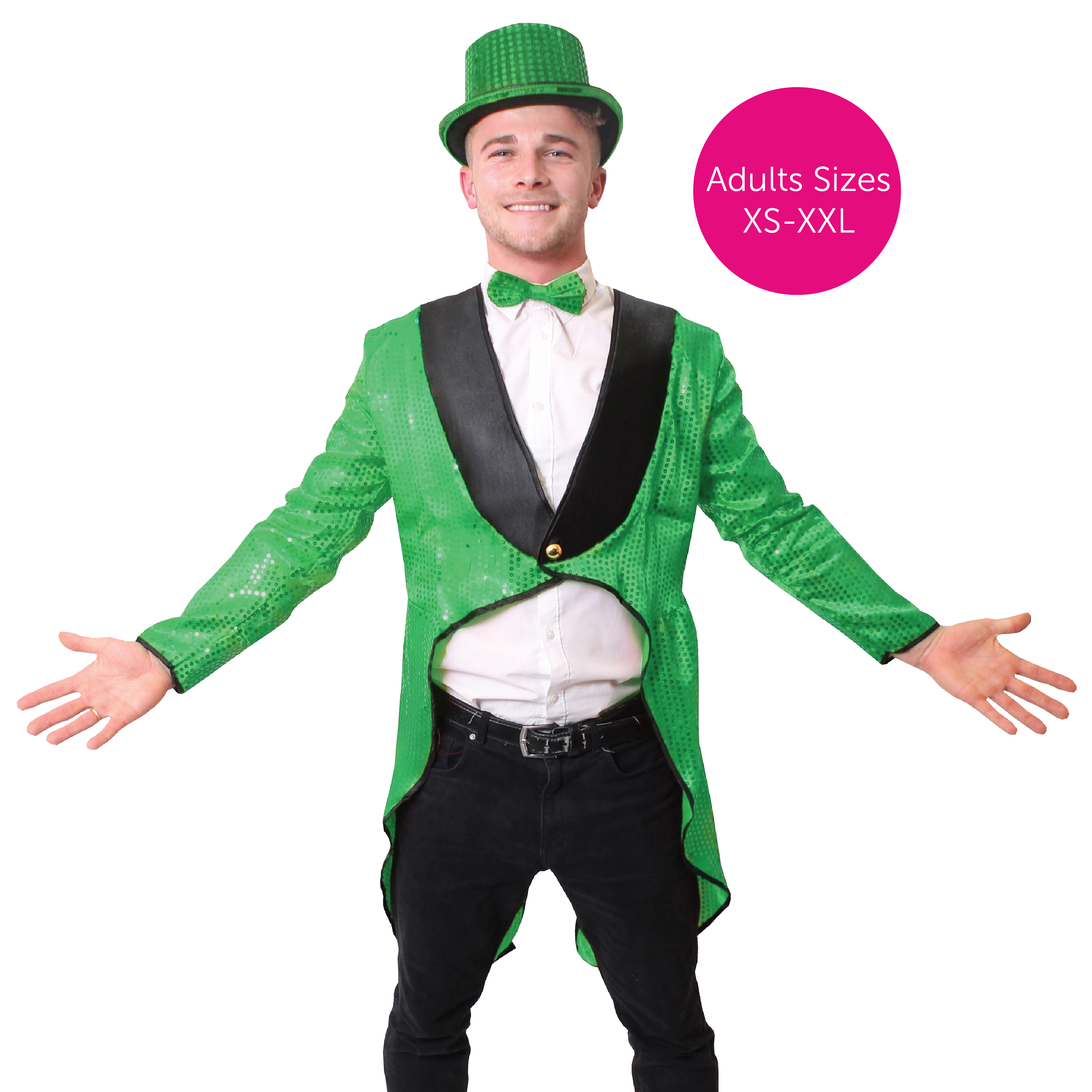 GREEN TAILCOAT DETAILS: This Adults Tailcoat is a vibrant Green Sequin covered Coat with black edging and detailed with a Gold Button, the perfect finishing touch to any outfit!