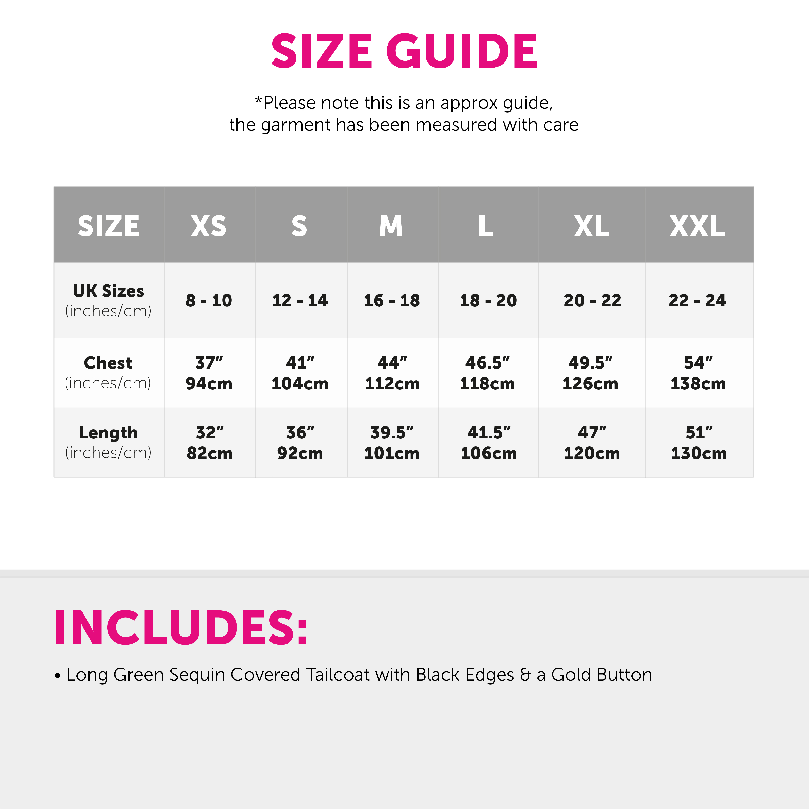 AVAILABLE IN MULTIPLE SIZES: Your Adults Green Tailcoat is available in multiple sizes, from X-Small to XX-Large: X-Small (UK size 8 - 10) Chest 37" (94cm), Length 32" (82cm) | Small (UK size 12 - 14) Chest 41" (104cm), Length 36" (92cm) | Medium (UK size 16 - 18) Chest 44" (112cm), Length 39.5" (101cm) | Large (UK size 18 - 20) Chest 46.5" (118cm), Length 41.5" (106cm) | X-Large (UK size 20 - 22) Chest 49.5" (126cm), Length 47" (120cm) | XX-Large (UK size 22 - 24) Chest 54" (138cm), Length 51" (130cm)