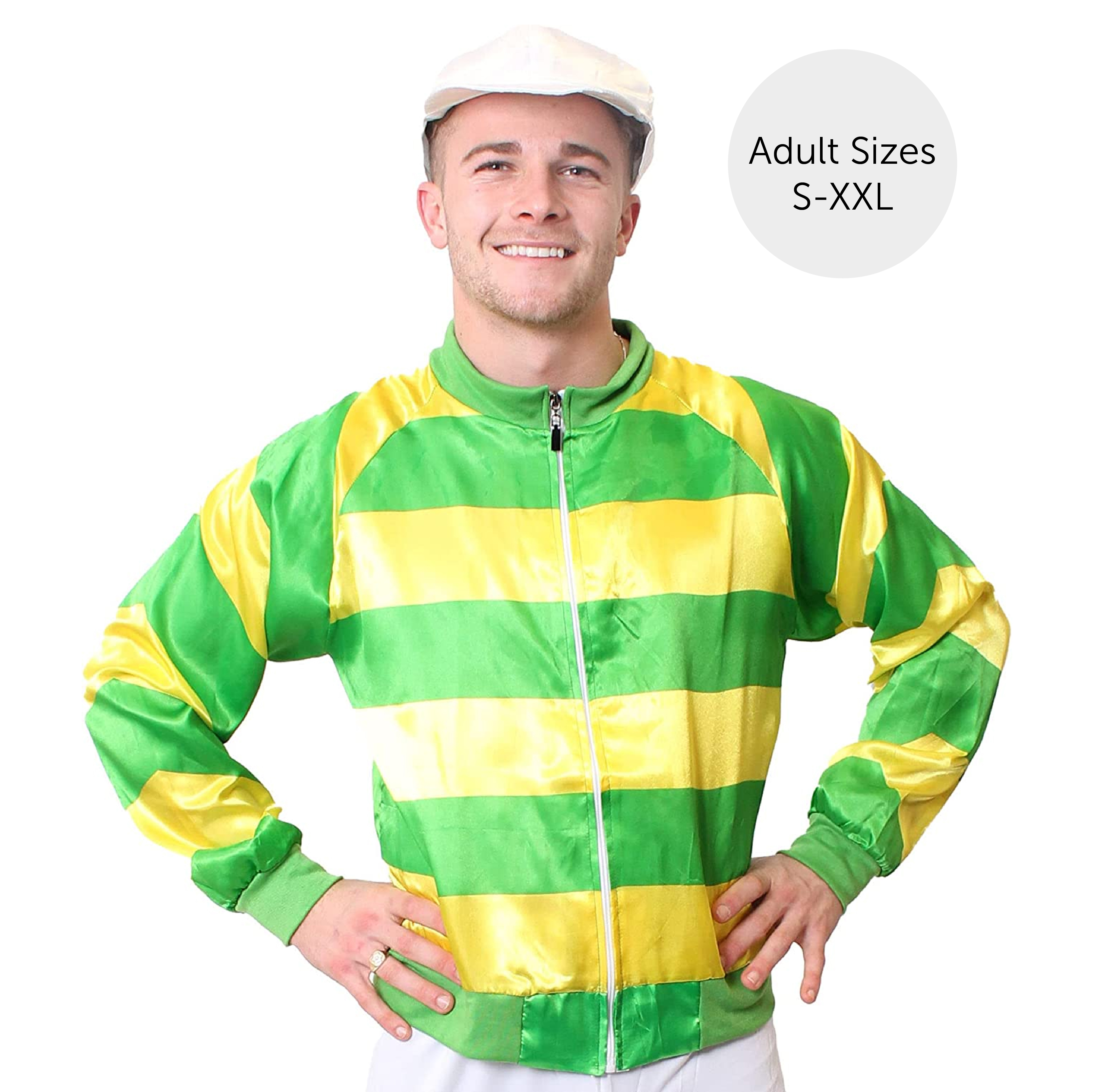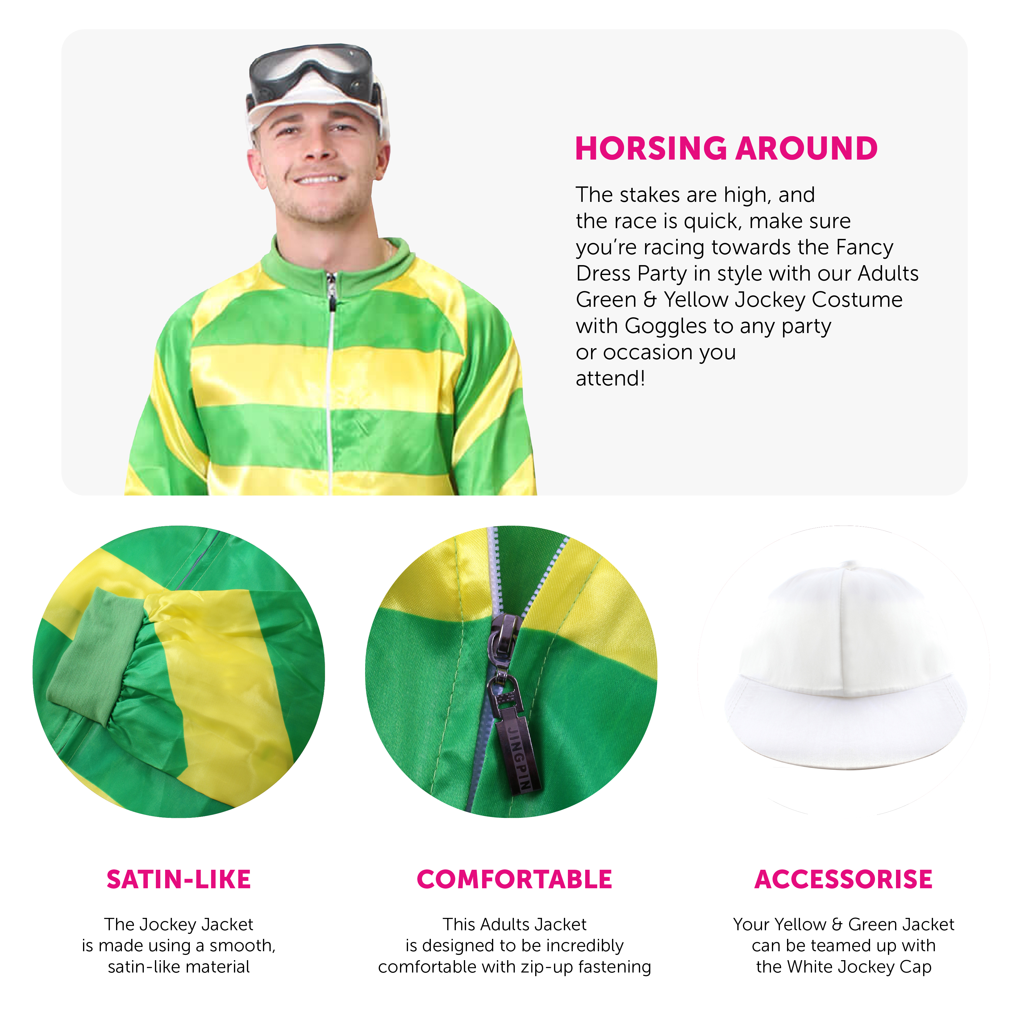 COSTUME INCLUDES: This Adults Jockey Costume includes a Yellow and Green Striped satin-look Jockey Jacket, White Trousers, a White Jockey Hat, and Goggles with an elastic strap, the perfectly compact set for any rider looking to travel light!