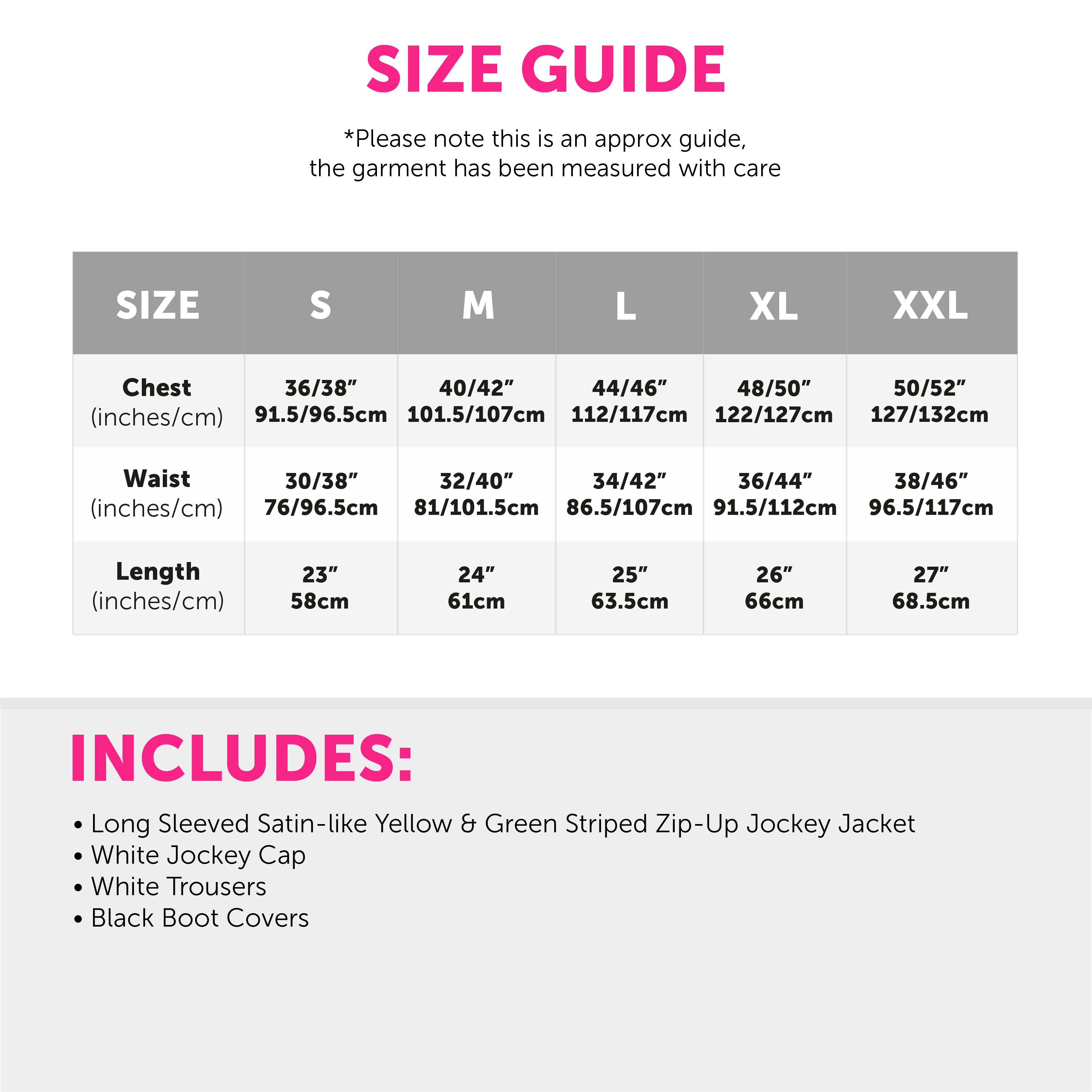 AVAILABLE IN MULTIPLE SIZES: Our Adults Green & Yellow Jockey Costume is available in multiple sizes from Small – XX-Large: Small - Chest 36/38" (91.5/96.5cm), Waist 30/38" (76/96.5cm), Length 23" (58cm) | Medium - Chest 40/42" (101.5/107cm), Waist 32/40" (81/101.5cm), Length 24" (61cm) | Large - Chest 44/46” (112/117cm), Waist 34/42" (86.5/107cm), Length 25” (63.5cm) | X-Large - Chest 48/50” (122/127cm), Waist 36/44" (91.5/112cm), Length 26” (66cm) | XX-Large - Chest 50/52” (127/132cm), Waist 38/46" (96.5/117cm), Length 27” (68.5cm)
