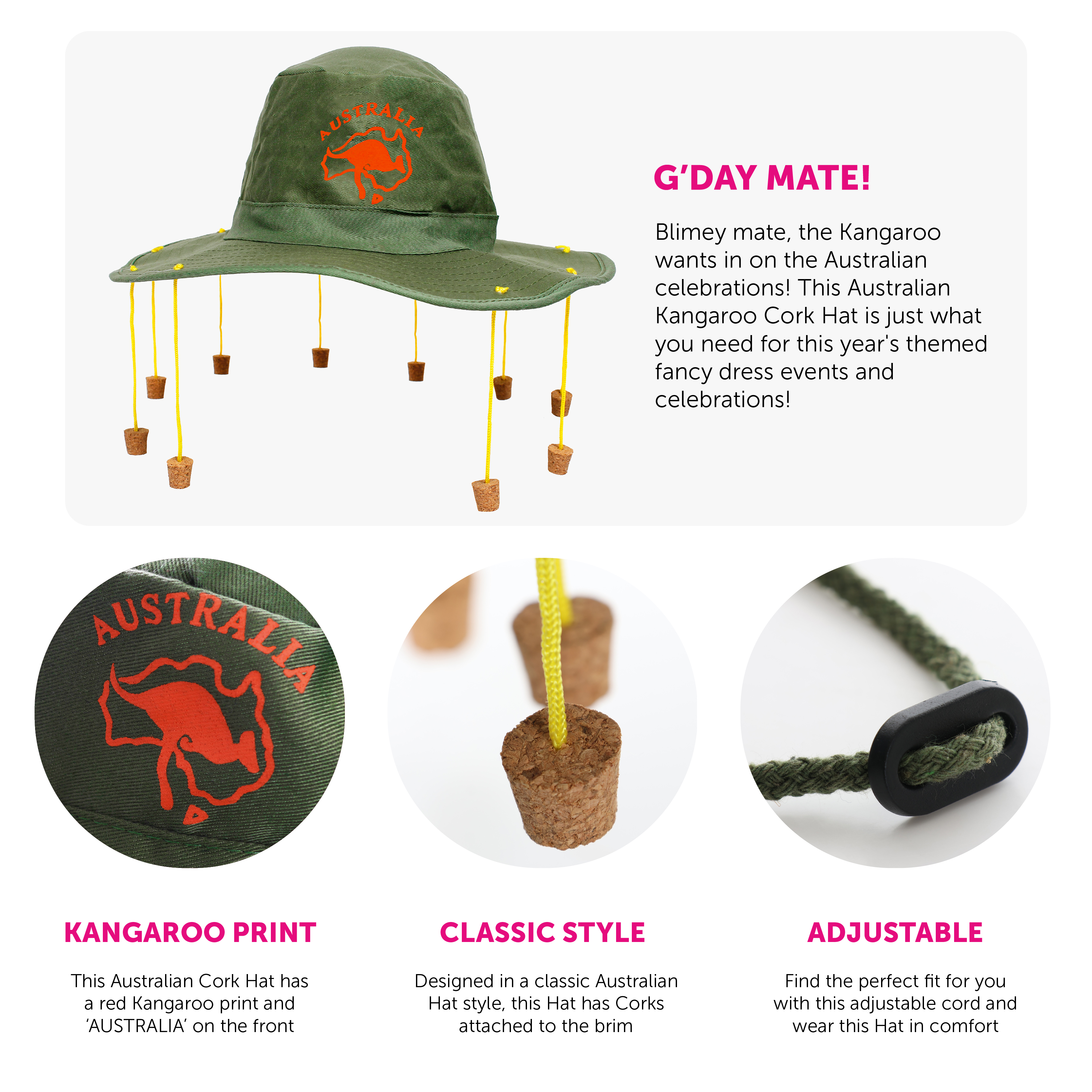 AUSTRALIAN KANGAROO CORK HAT: Blimey mate, the Kangaroo wants in on the Australian celebrations! This Australian Kangaroo Cork Hat is just what you need for this year's themed fancy dress events and celebrations!