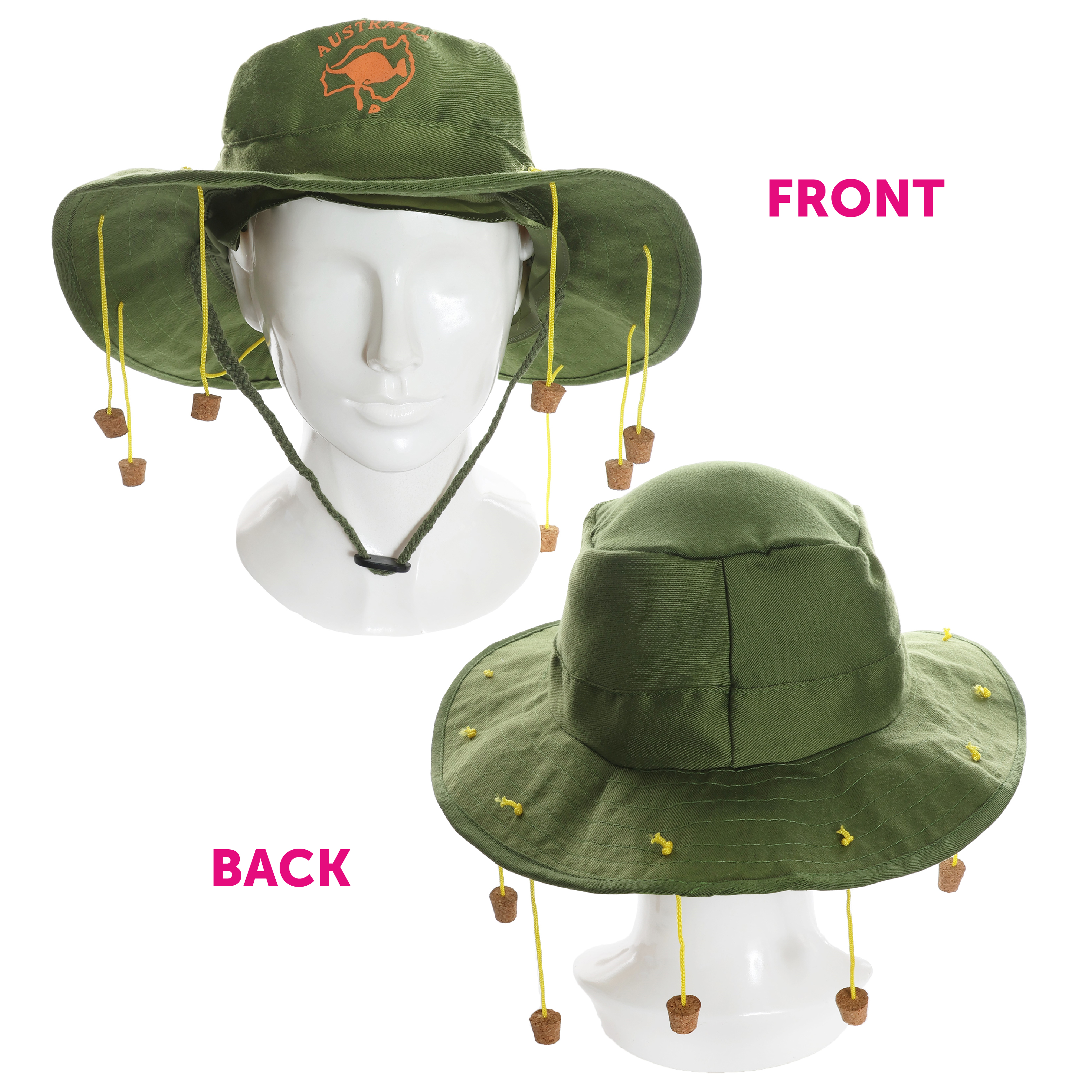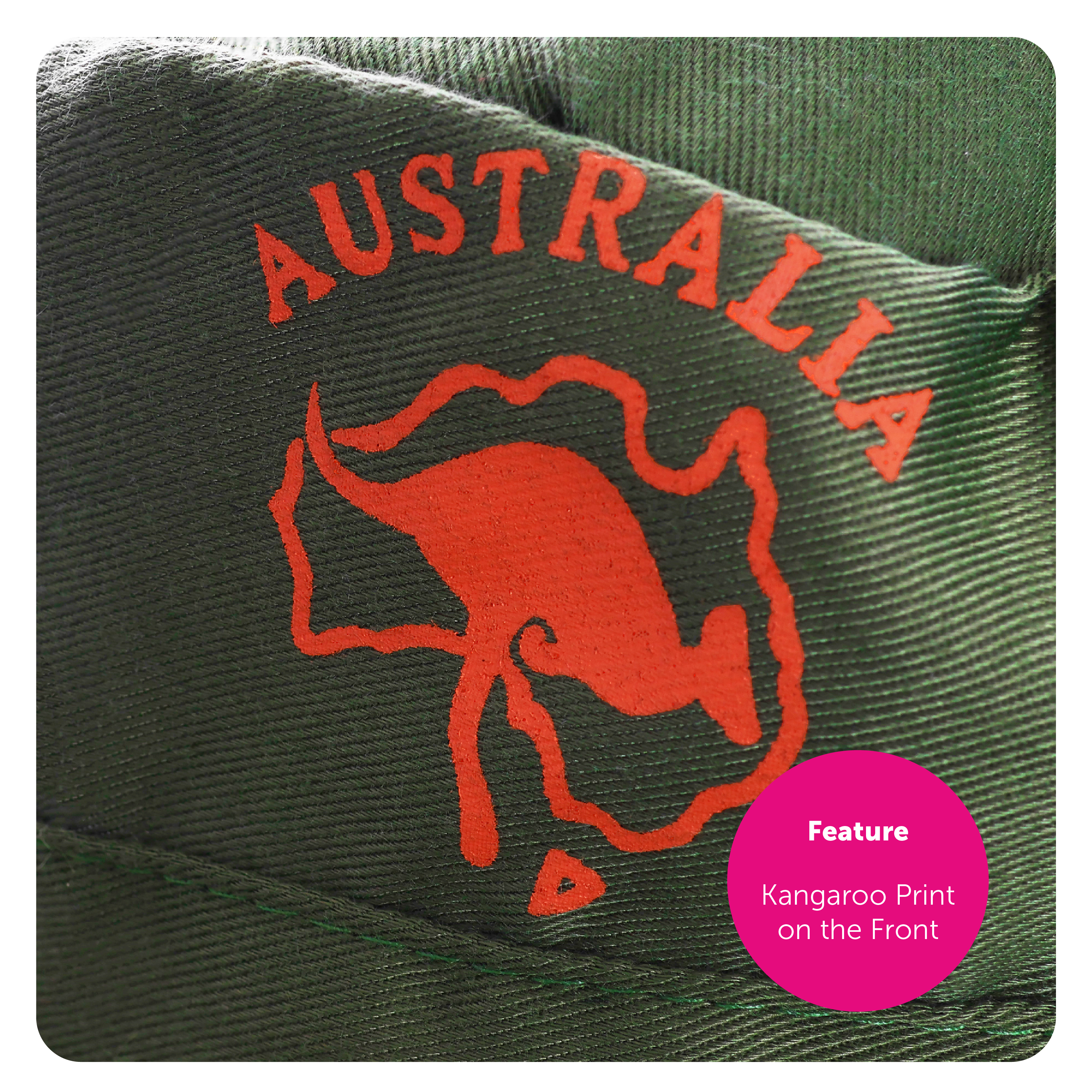 HAT DETAILS: This Cork Hat is a quality Green Hat with a Red Kangaroo Print on the front reading 'AUSTRALIA', Corks hanging by string attached all around the brim and a comfortable, adjustable drawstring design!