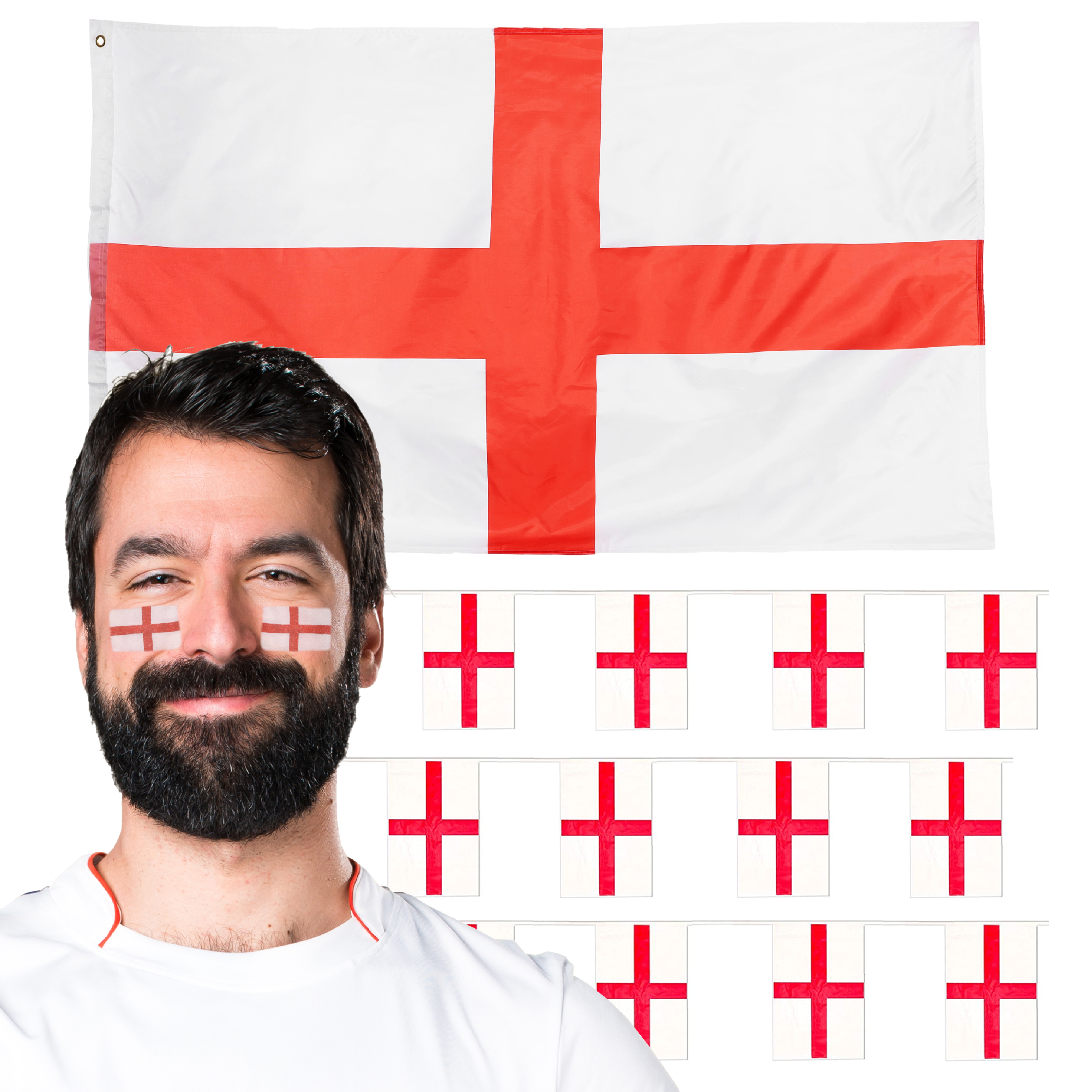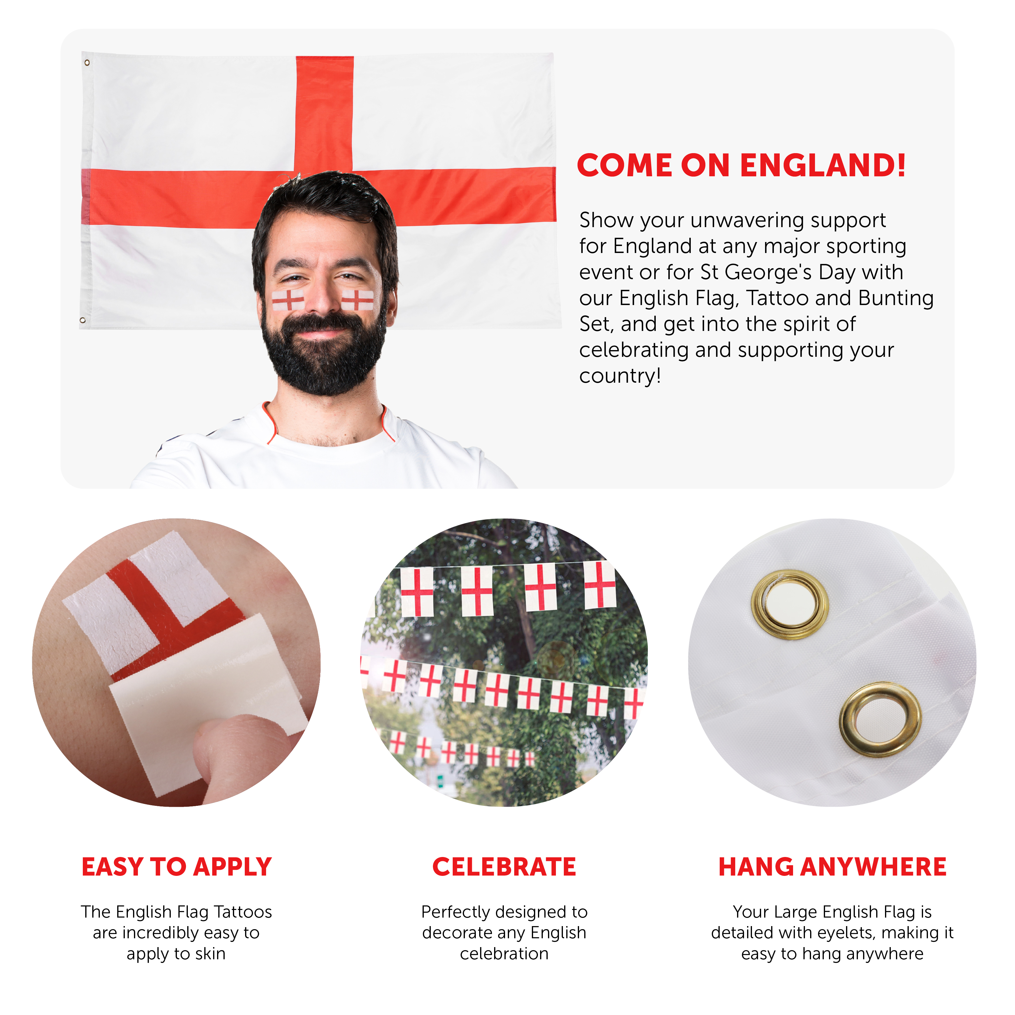 5FT X 3FT ENGLAND FLAG, TEMPORARY TATTOOS & BUNTING SET: Show your unwavering support for England at any major sporting event or for St George's Day with our English Flag, Tattoo and Bunting Set, and get into the spirit of celebrating and supporting your country!