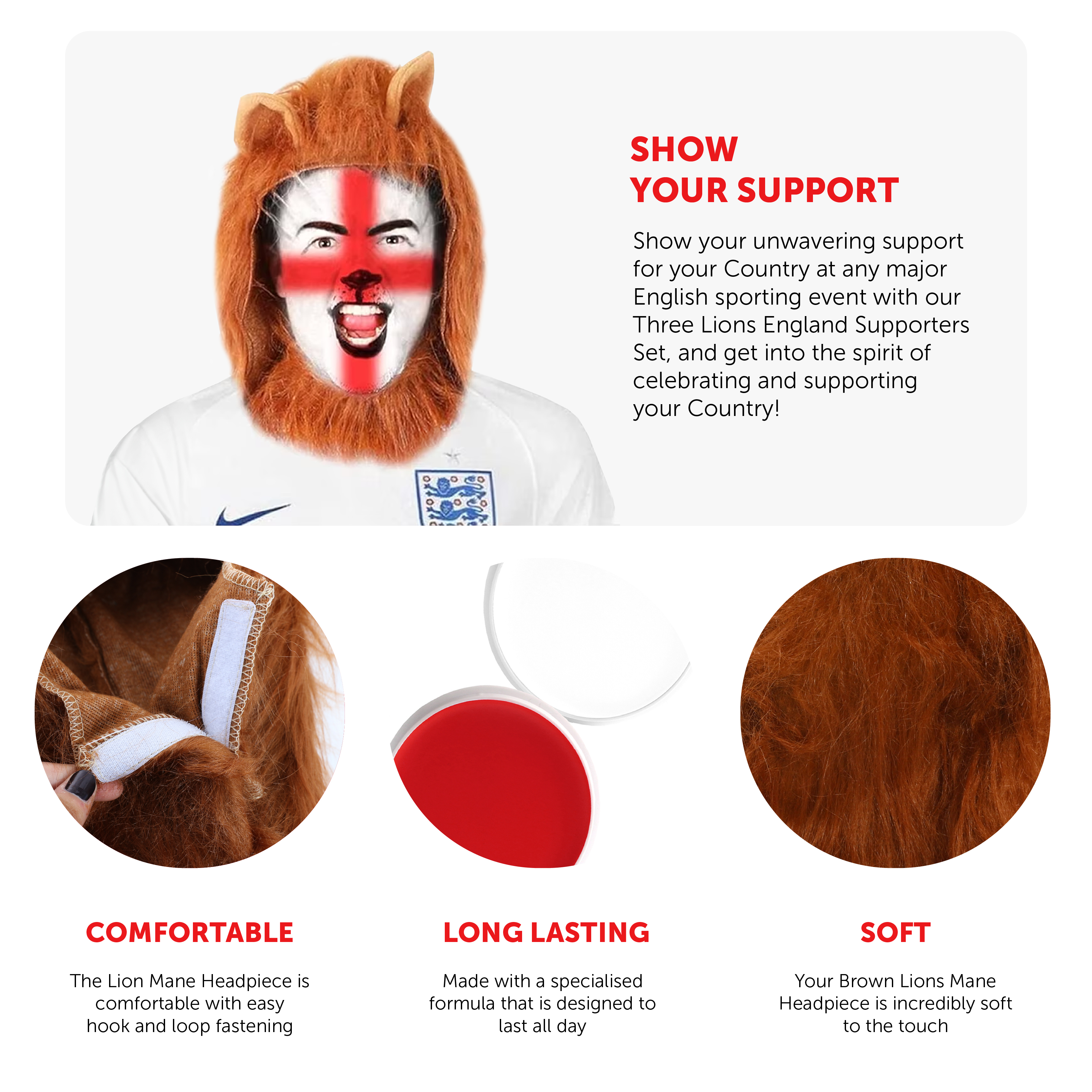 SET INCLUDES: This Three Lions England Supporters Set includes a fluffy Brown Lions Mane with comfortable hook and loop fastening, a Palette of Red Face Paint, and a Palette of White Face Paint, the perfect set to support your Country at any English event!
