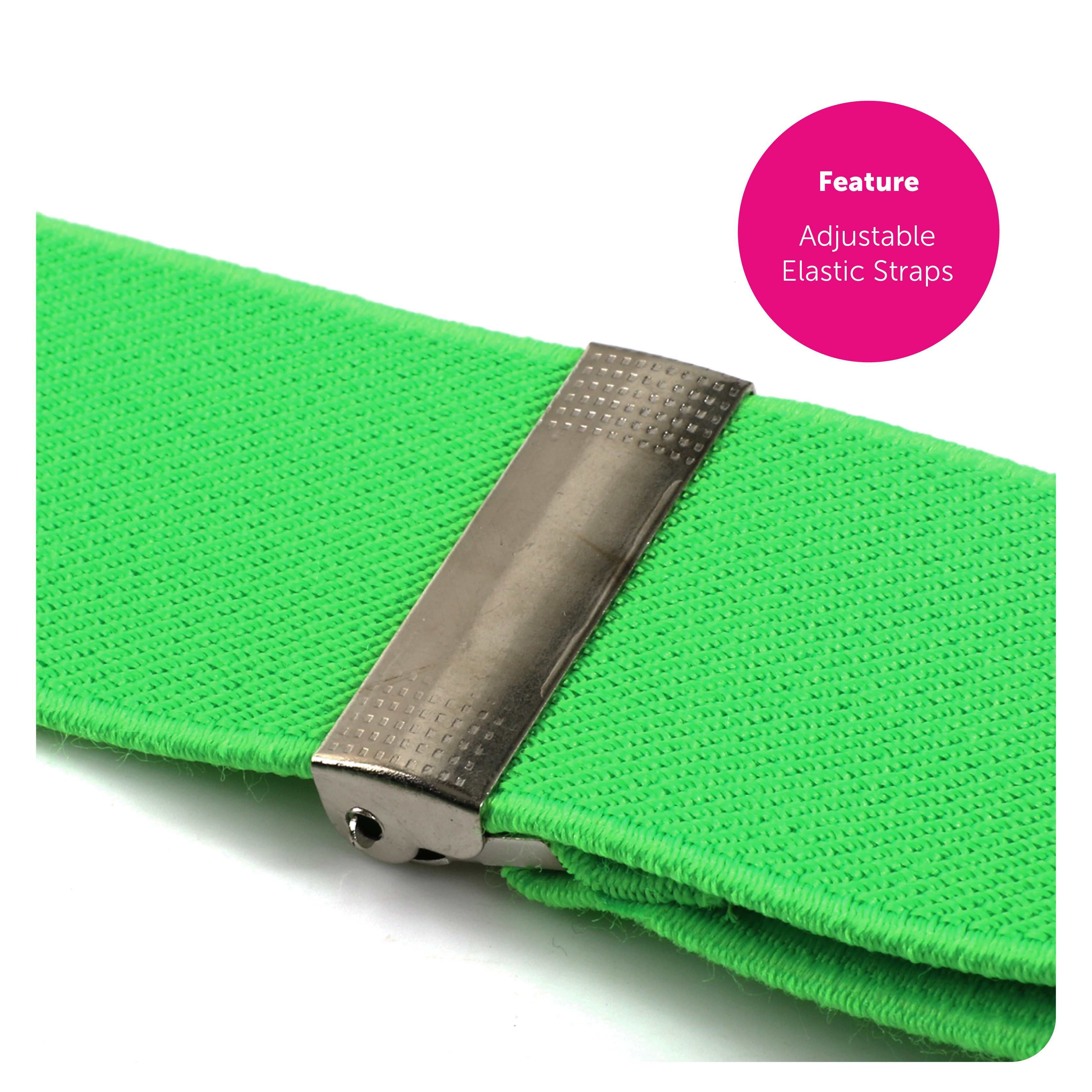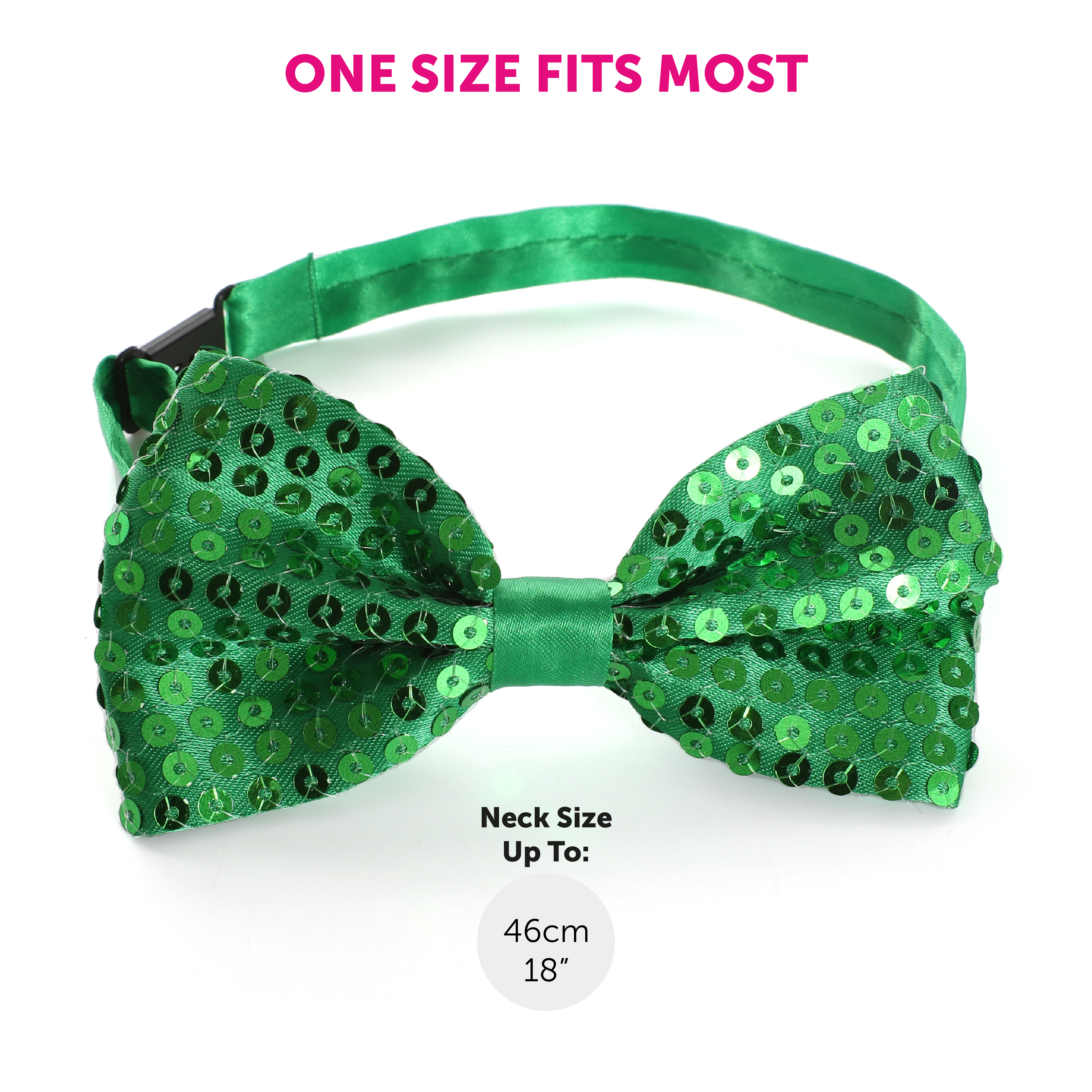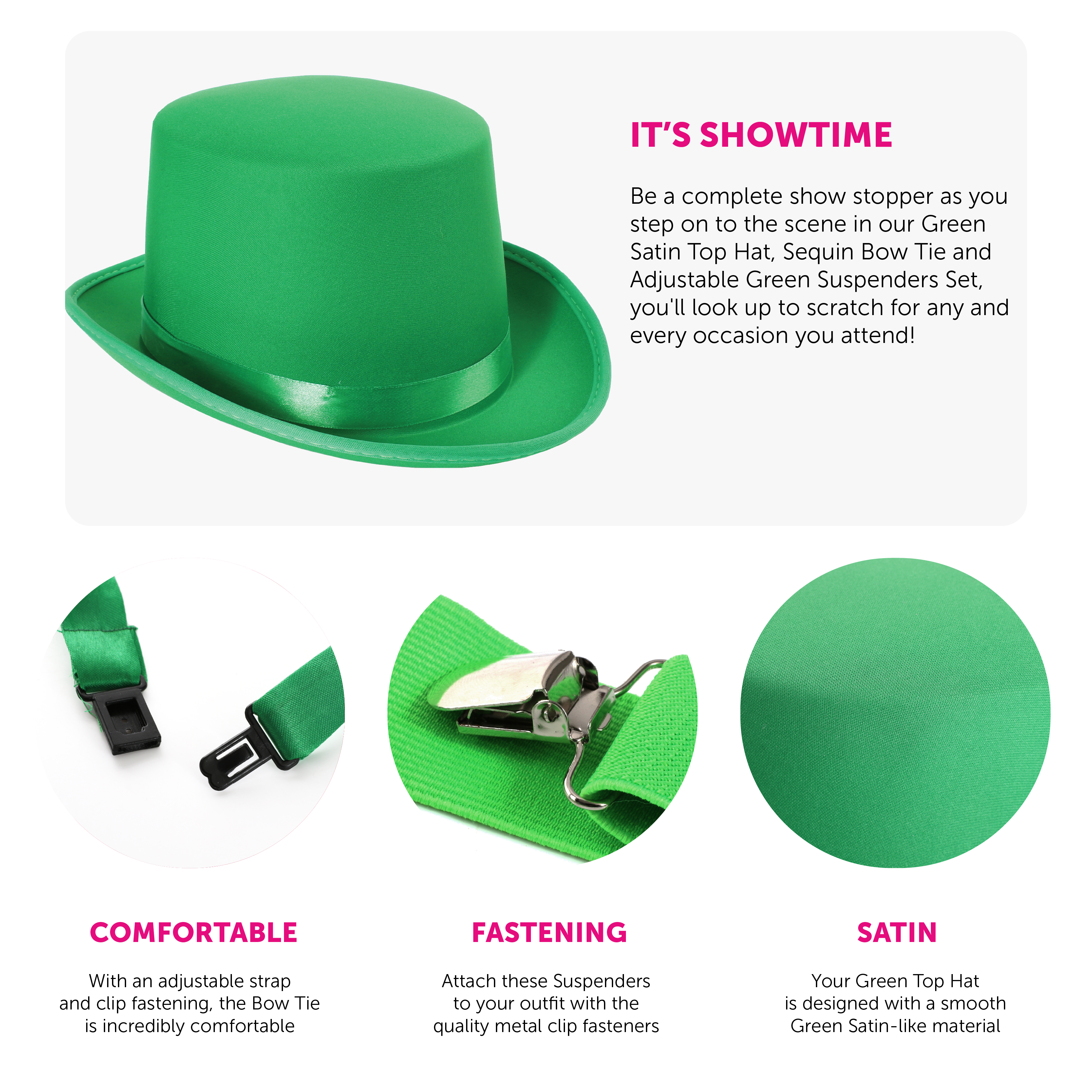 ACCESSORY DETAILS: This accessory set includes a vibrant Green Hat covered in a smooth satin material with a matching Green Ribbon band, a Sequin covered Green Bow Tie with an adjustable strap for extra comfort and adjustable, elasticated Green Suspenders with clip fasteners, the perfect addition to any fancy dress outfit!