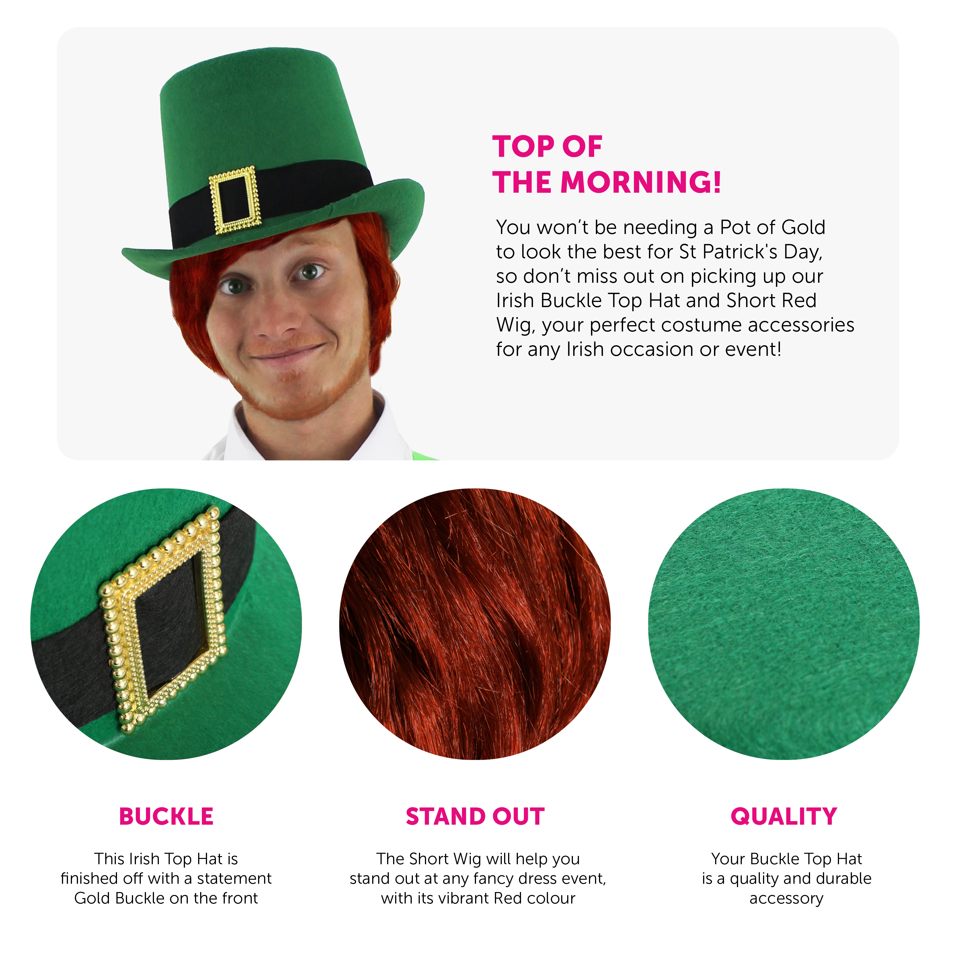 IRISH SET DETAILS: The Irish Set includes a Green Top Hat complete with a statement Gold Buckle Band around the brim, and a vibrant Short Red Wig, a great look for any themed event!