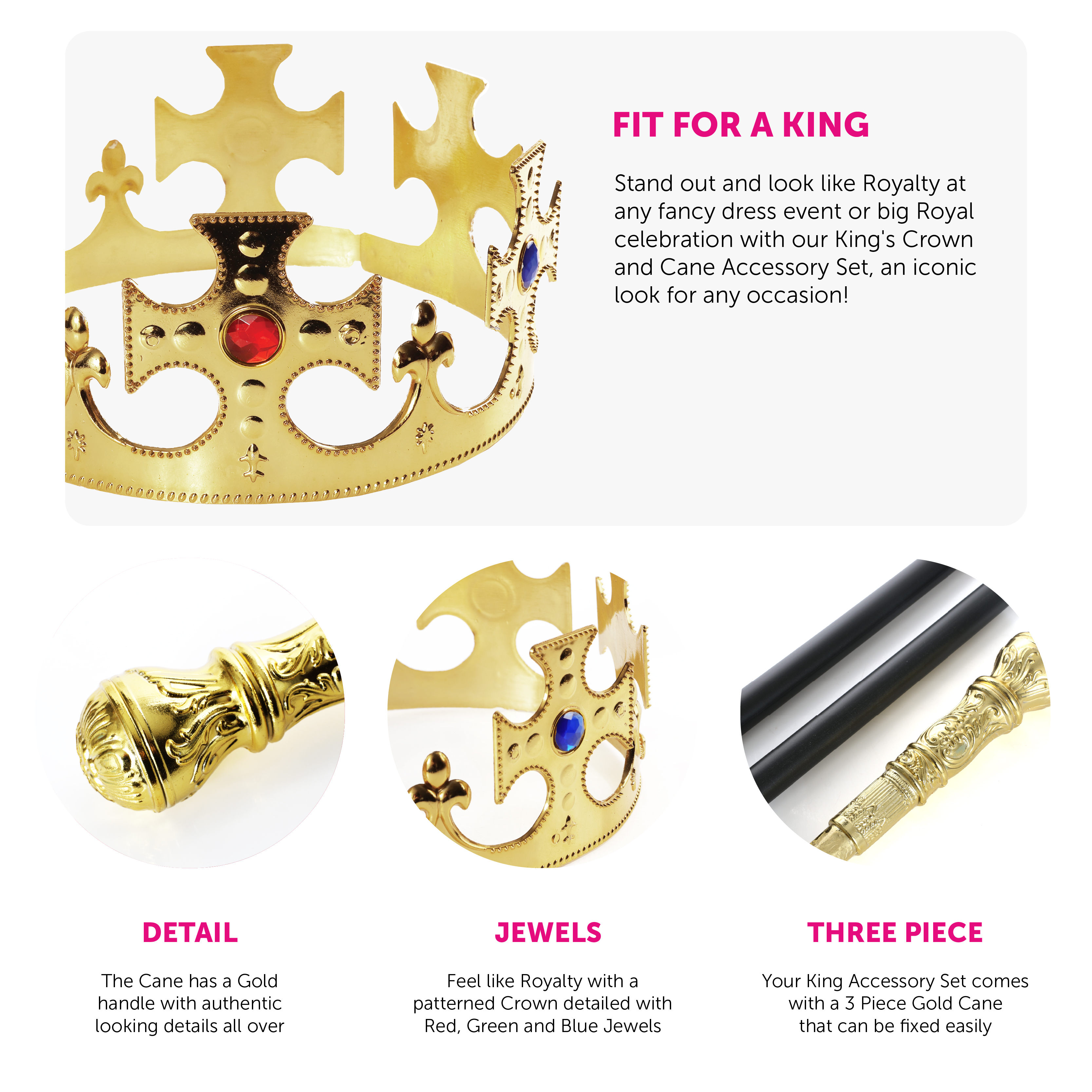ACCESSORY SET DETAILS: Your King Accessory Set includes an adjustable Gold Plastic Crown with Blue, Green and Red Jewels attached and a 3 Piece Cane with a detailed Gold Handle, the perfect addition to any King Outfit!