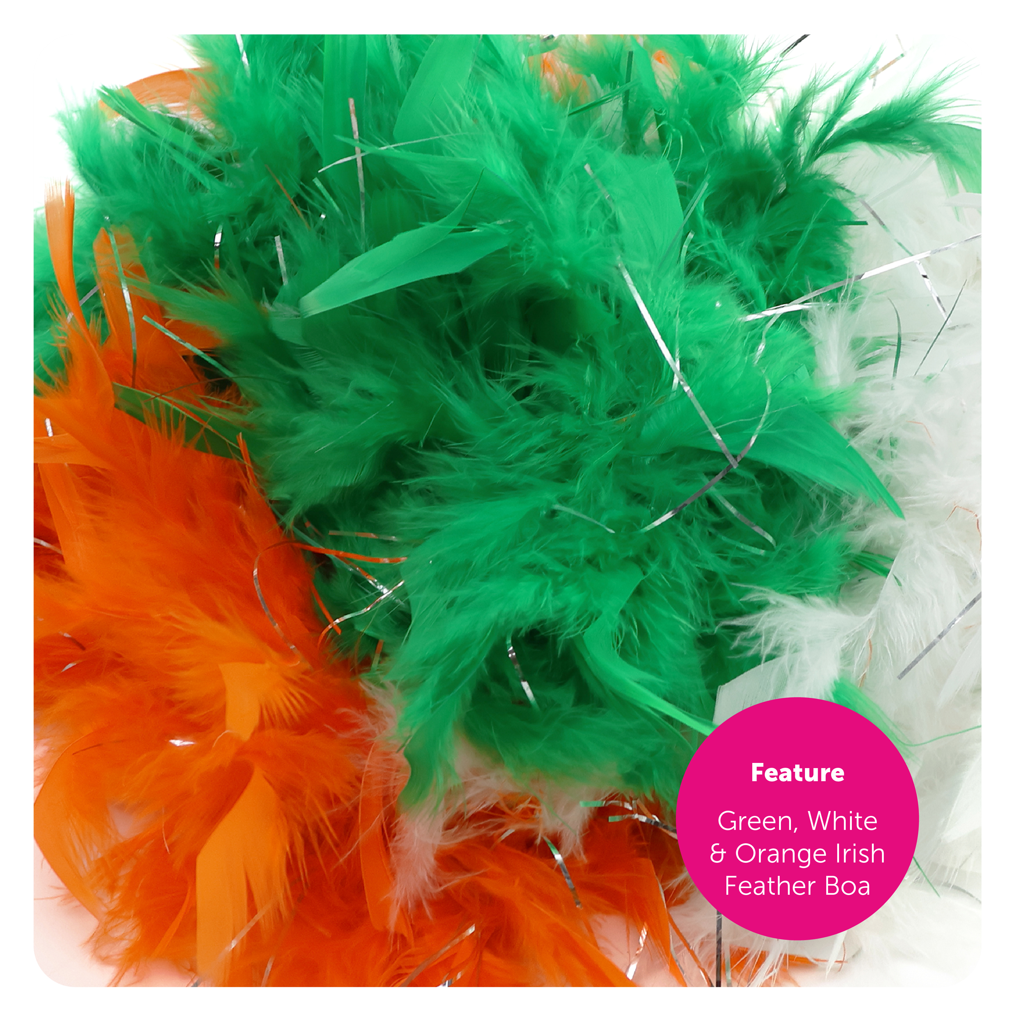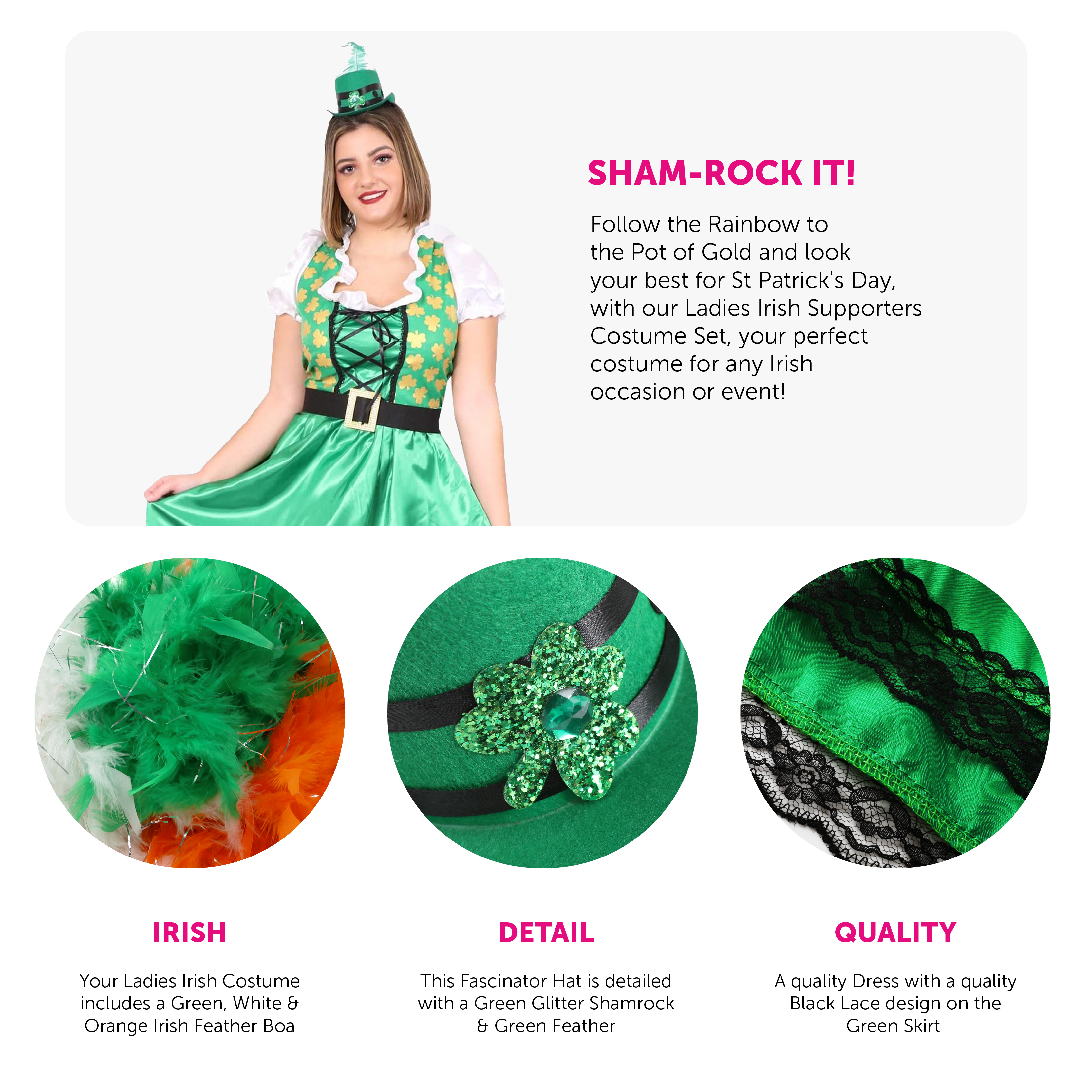COSTUME DETAILS: Your Ladies St Patrick’s Day Costume includes a Green Dress with a Gold Shamrock Print on a Corset style Top with a White Blouse attached and a Gold Buckle Belt, a Mini Green Glitter Fascinator Hat attached to an Alice band, White Stockings, and a Green, White & Orange Irish Feather Boa, to finish your look!
