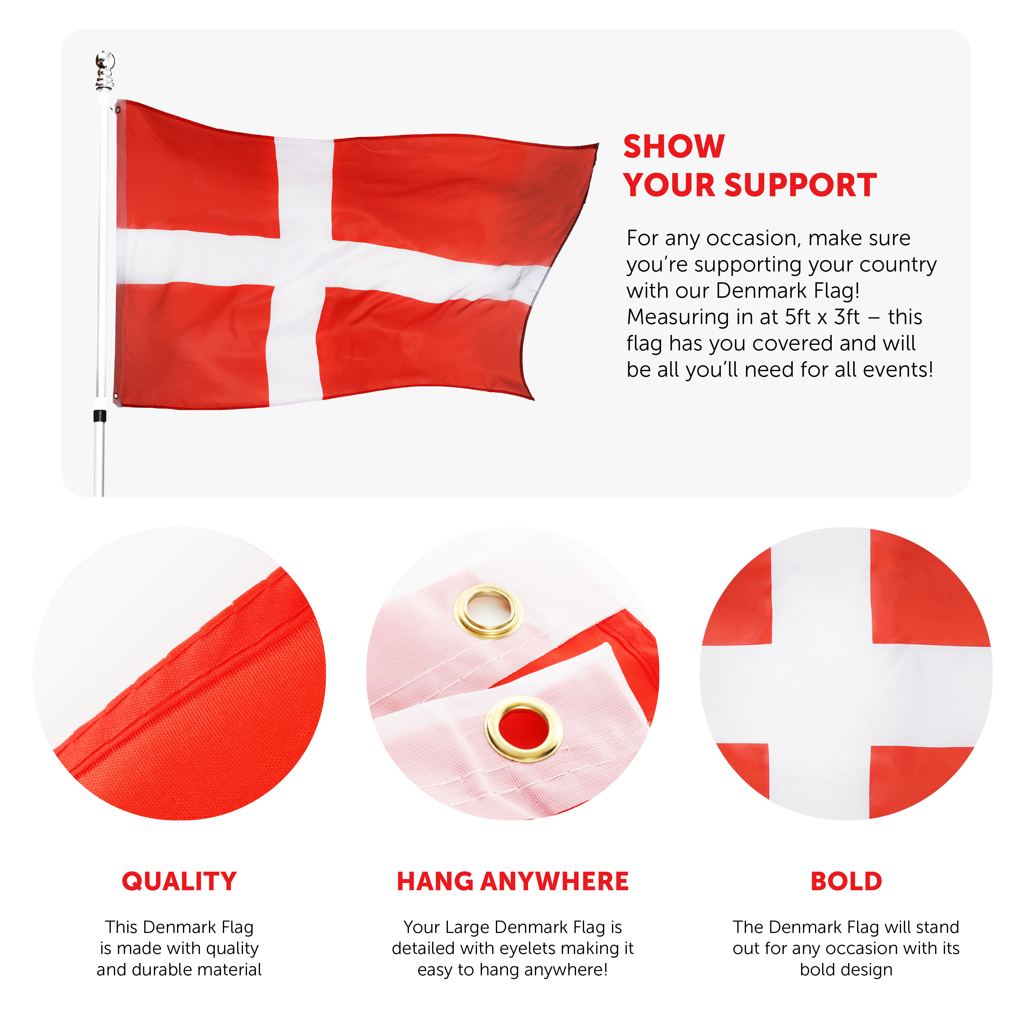 FLAG DETAILS: This Denmark Flag is a vibrant Red Flag with a White Cross, the Flag measures 5ft (152cm/60") in Width and 3ft (91cm/36") in Height, you'll have the perfect flag accessory to fly high for any event!