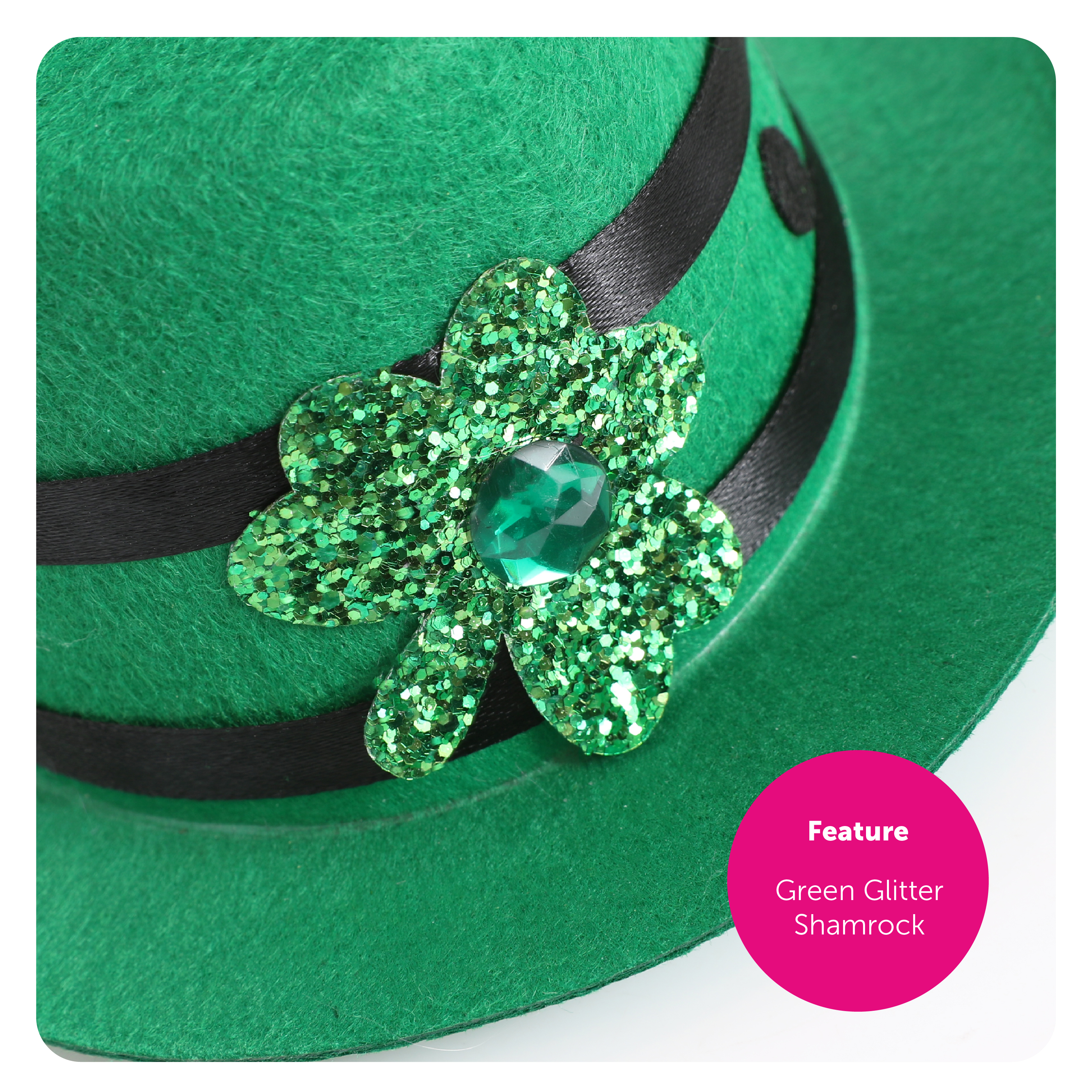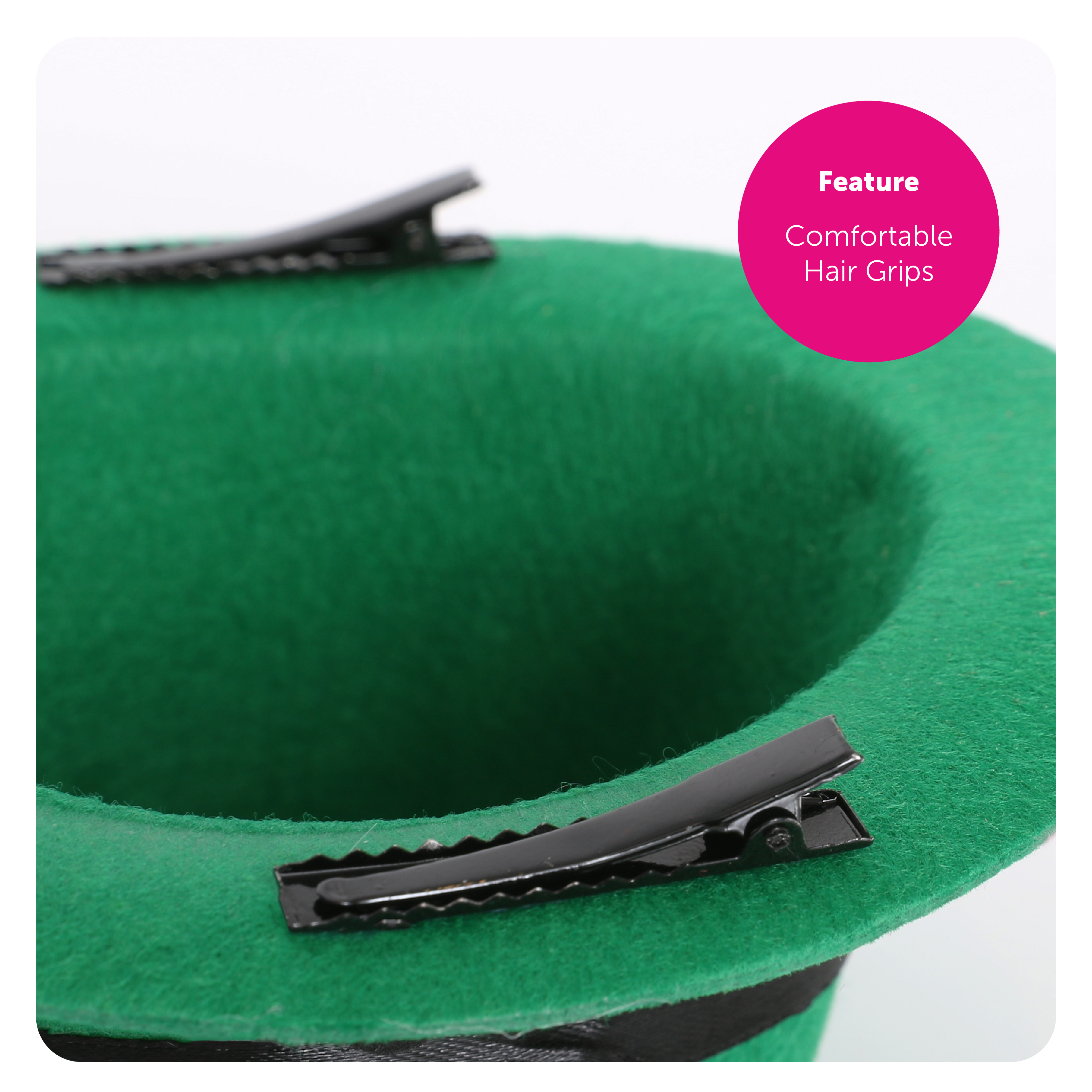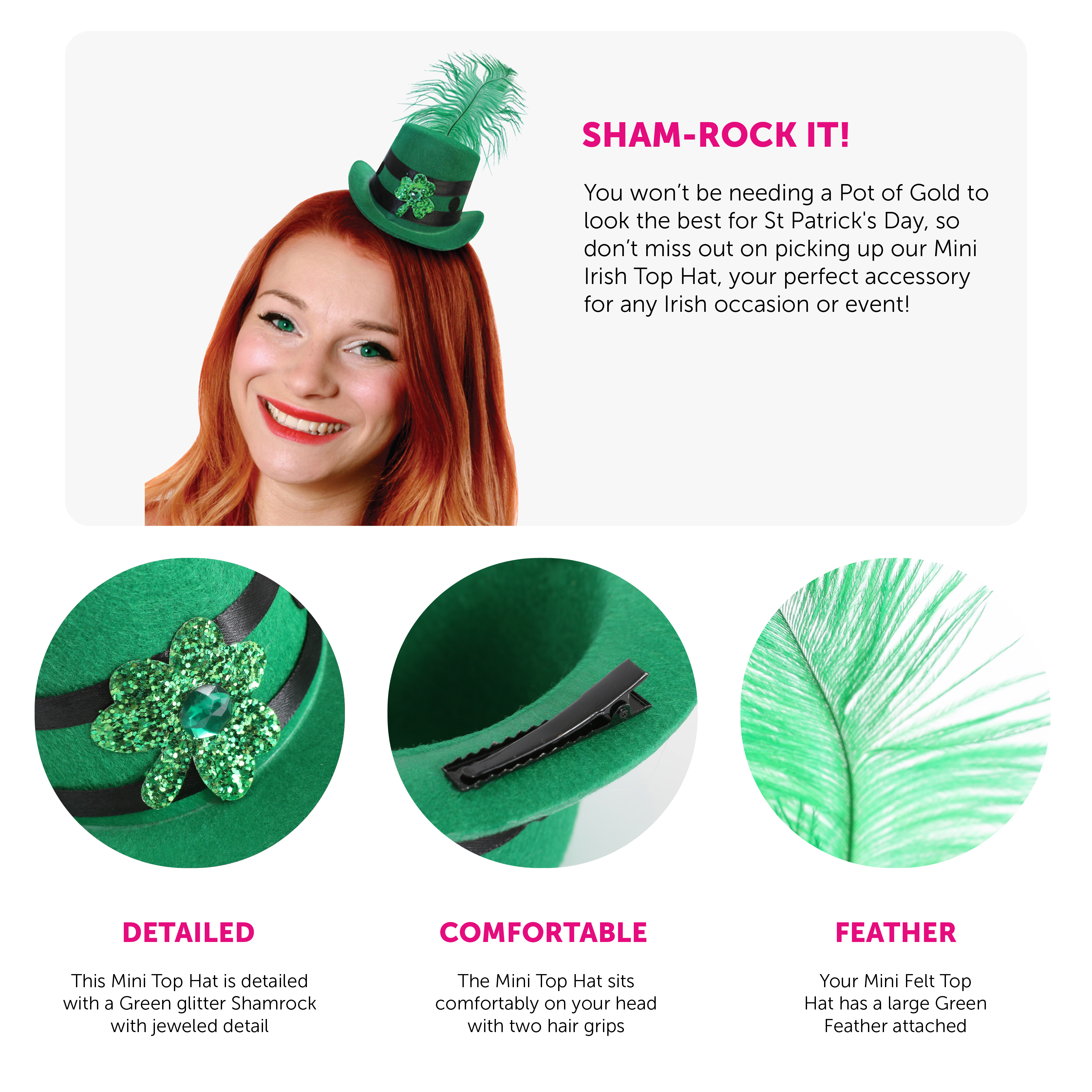 TOP HAT DETAILS: This Mini Irish Top Hat is a small Green Top Hat attached to easy to wear Hair Grip on the base, with a large Green Feather, Black Ribbon detail and a Green Glitter Shamrock with Jewel detail!